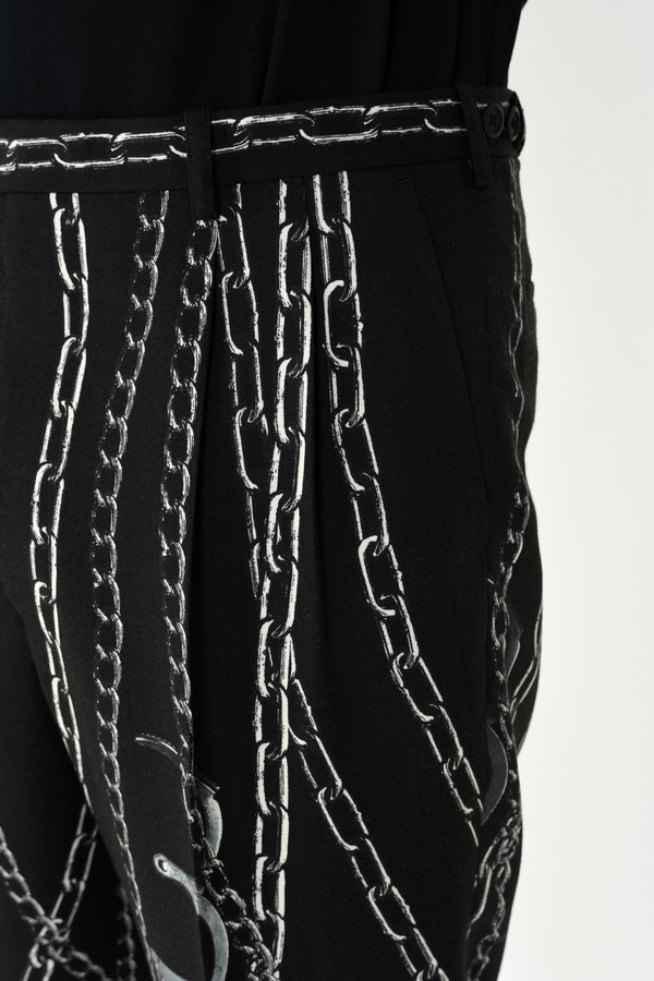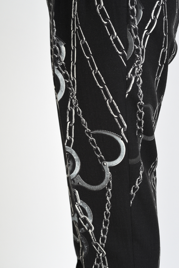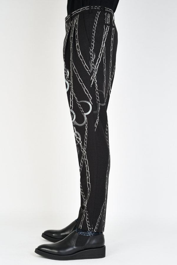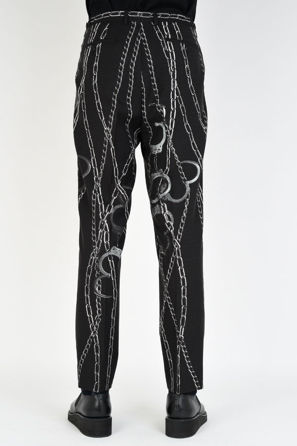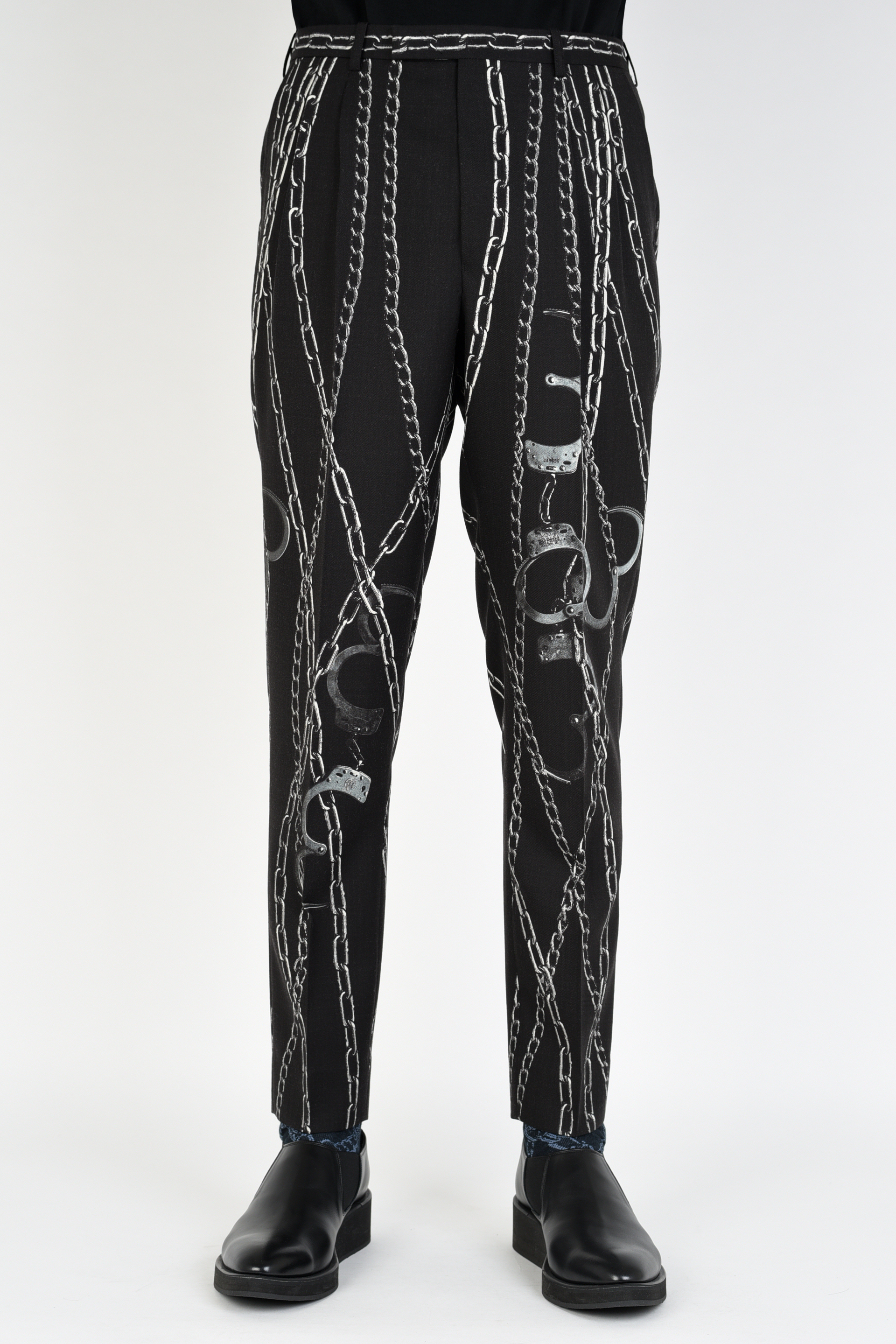 チェーンと手錠柄をプリントしたウール素材を使用した2タックスラックス。