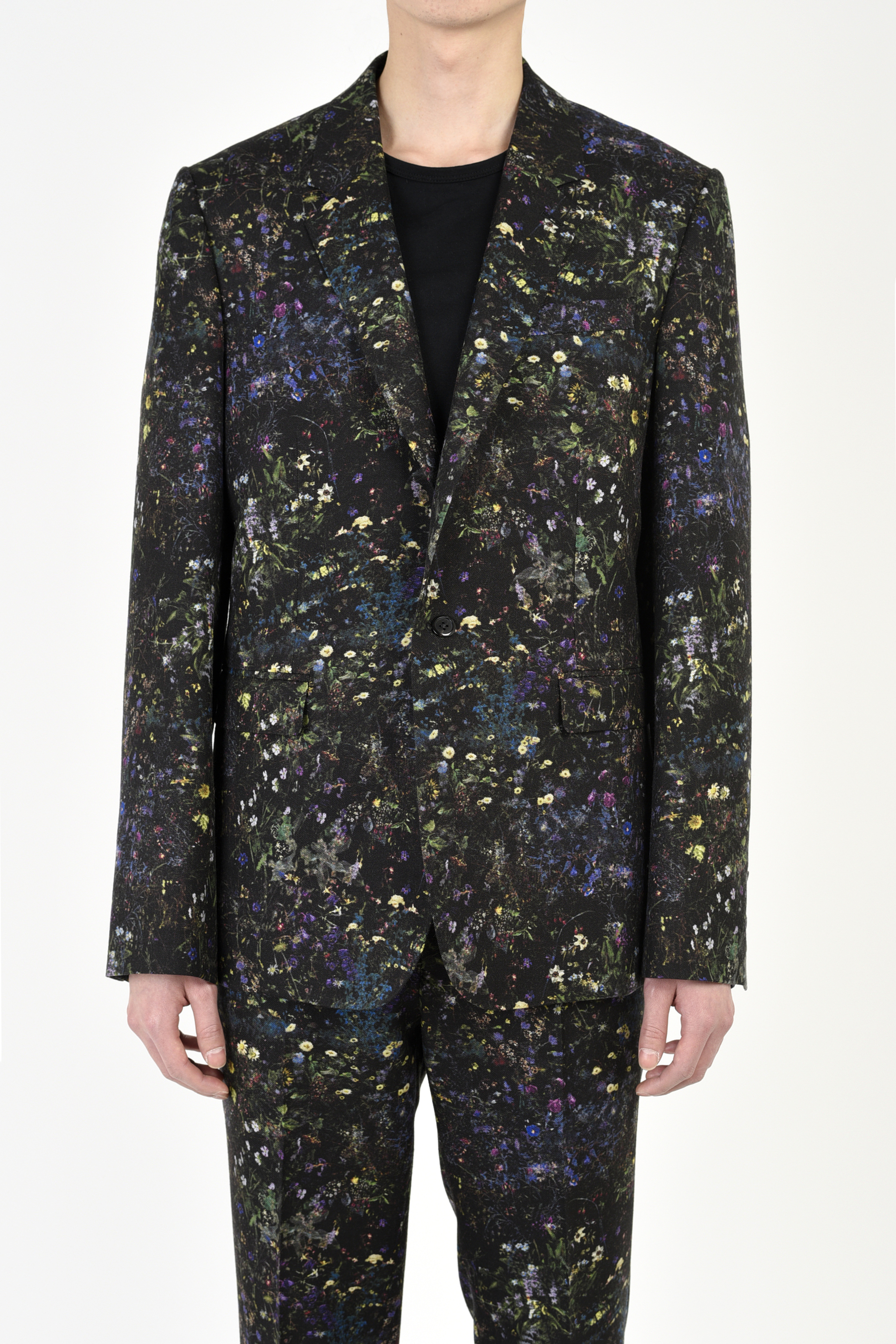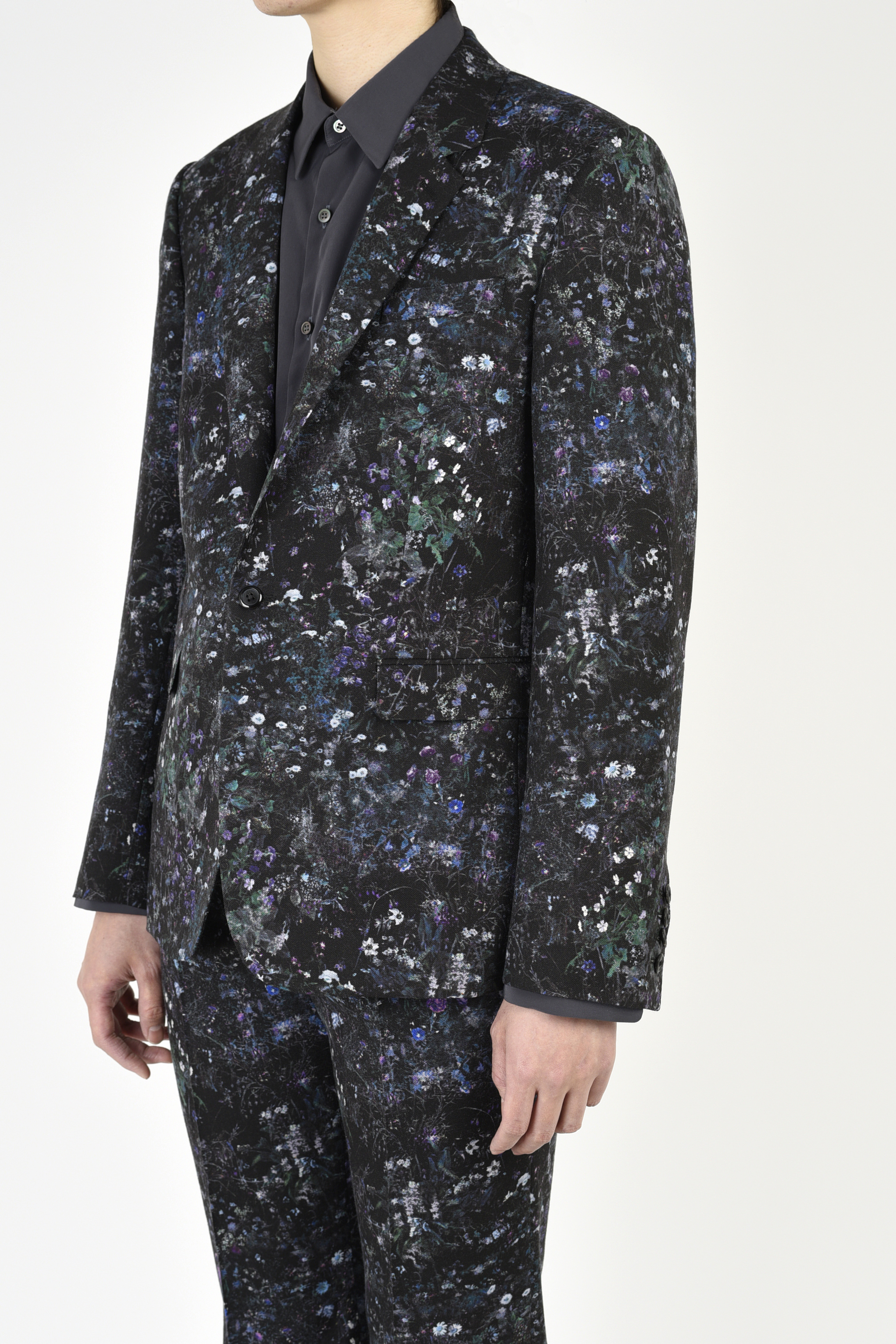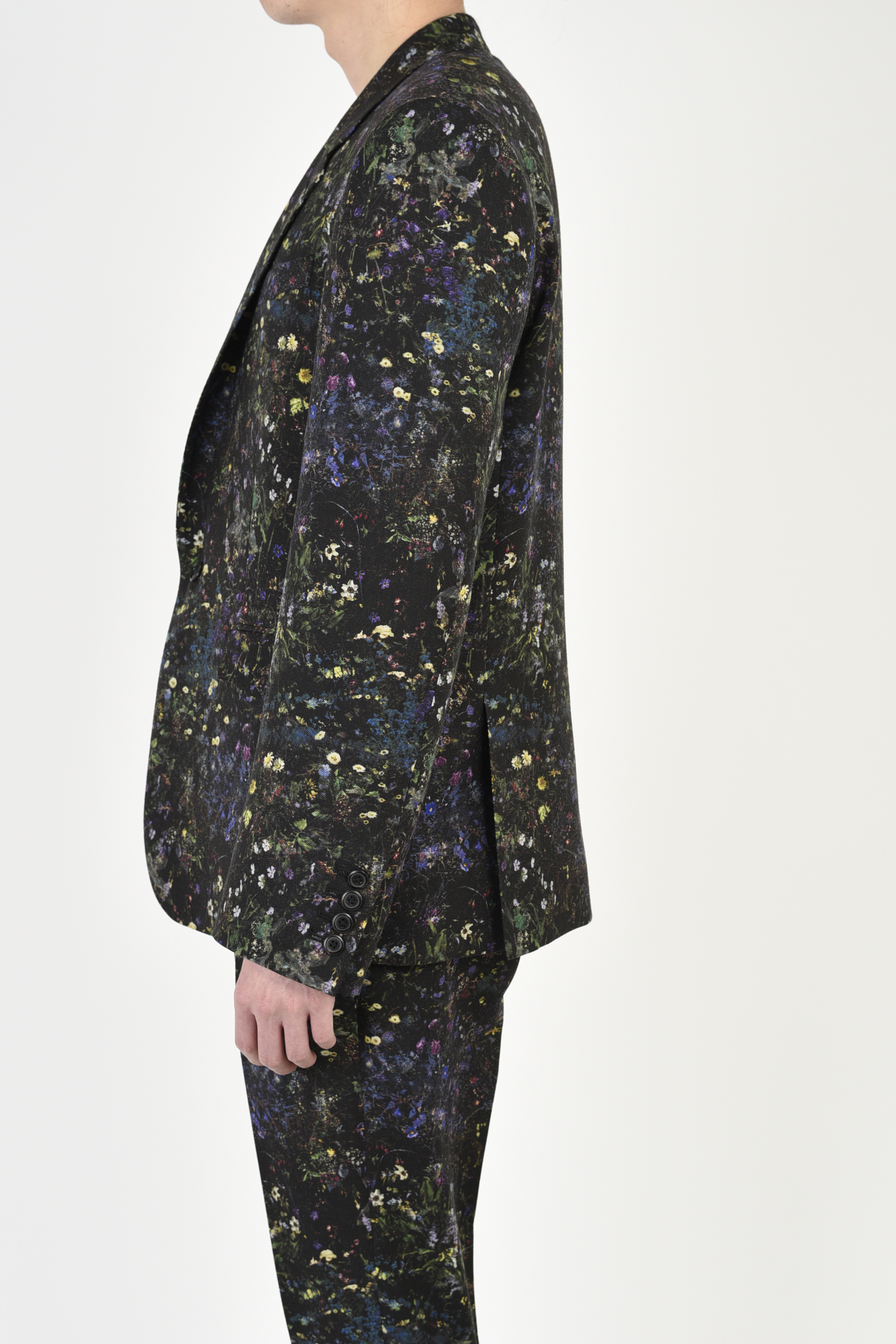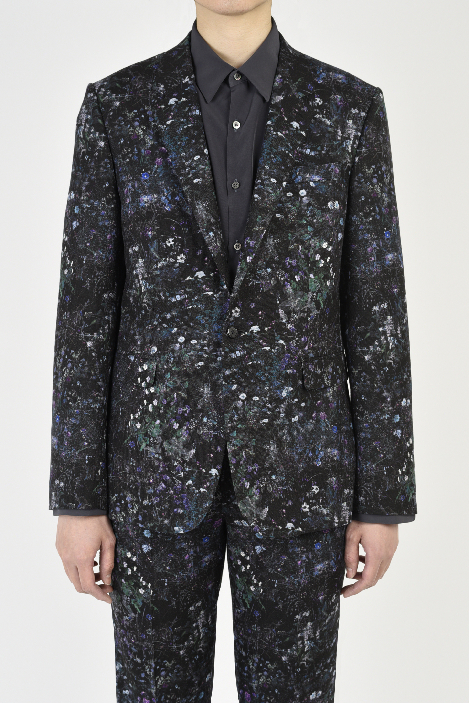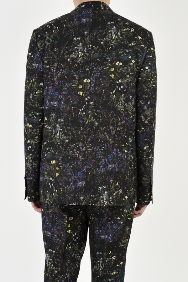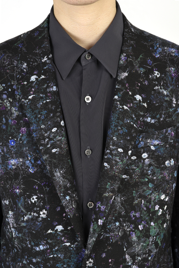 フラワー柄をプリントしたウール素材を使用した1Bジャケット。