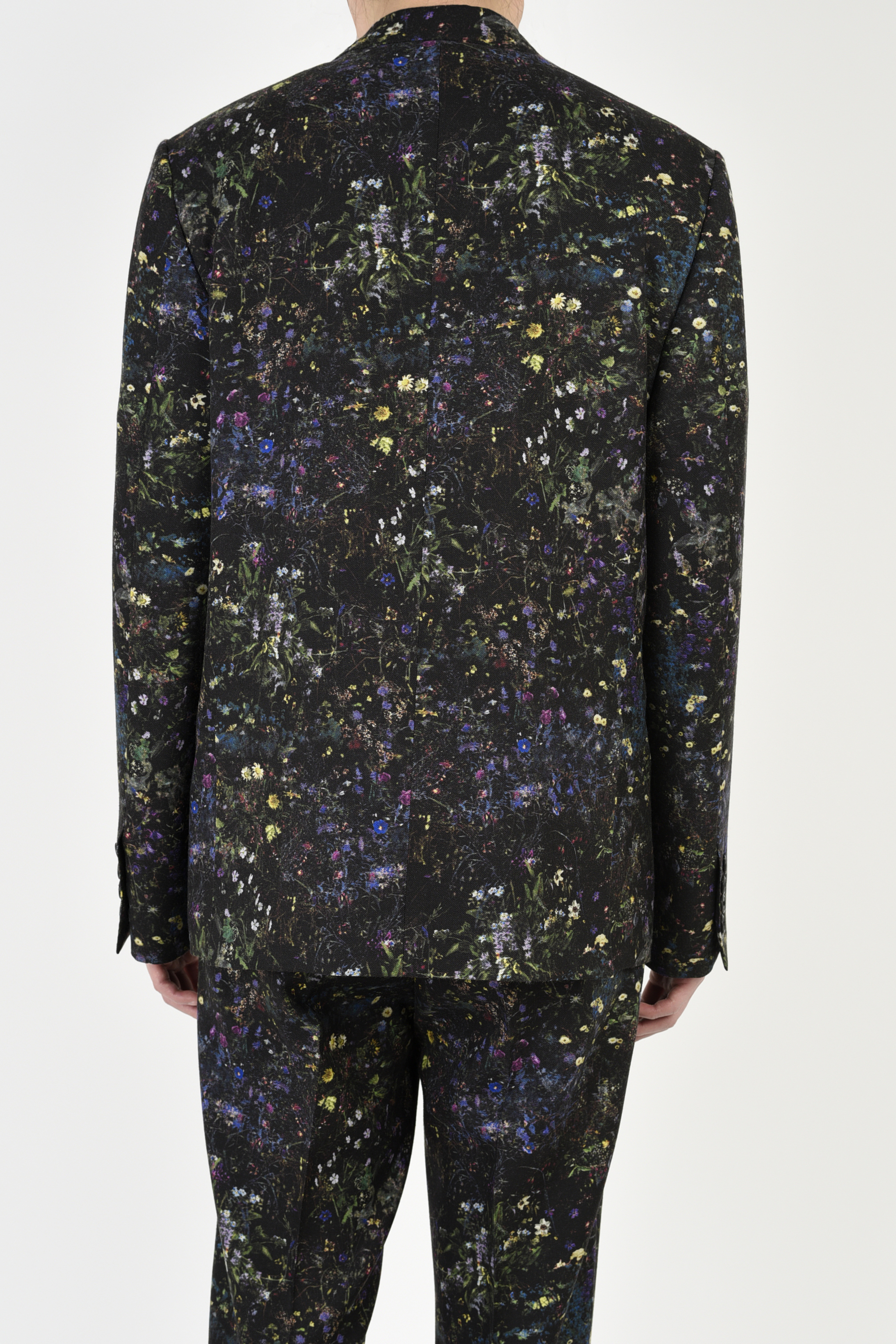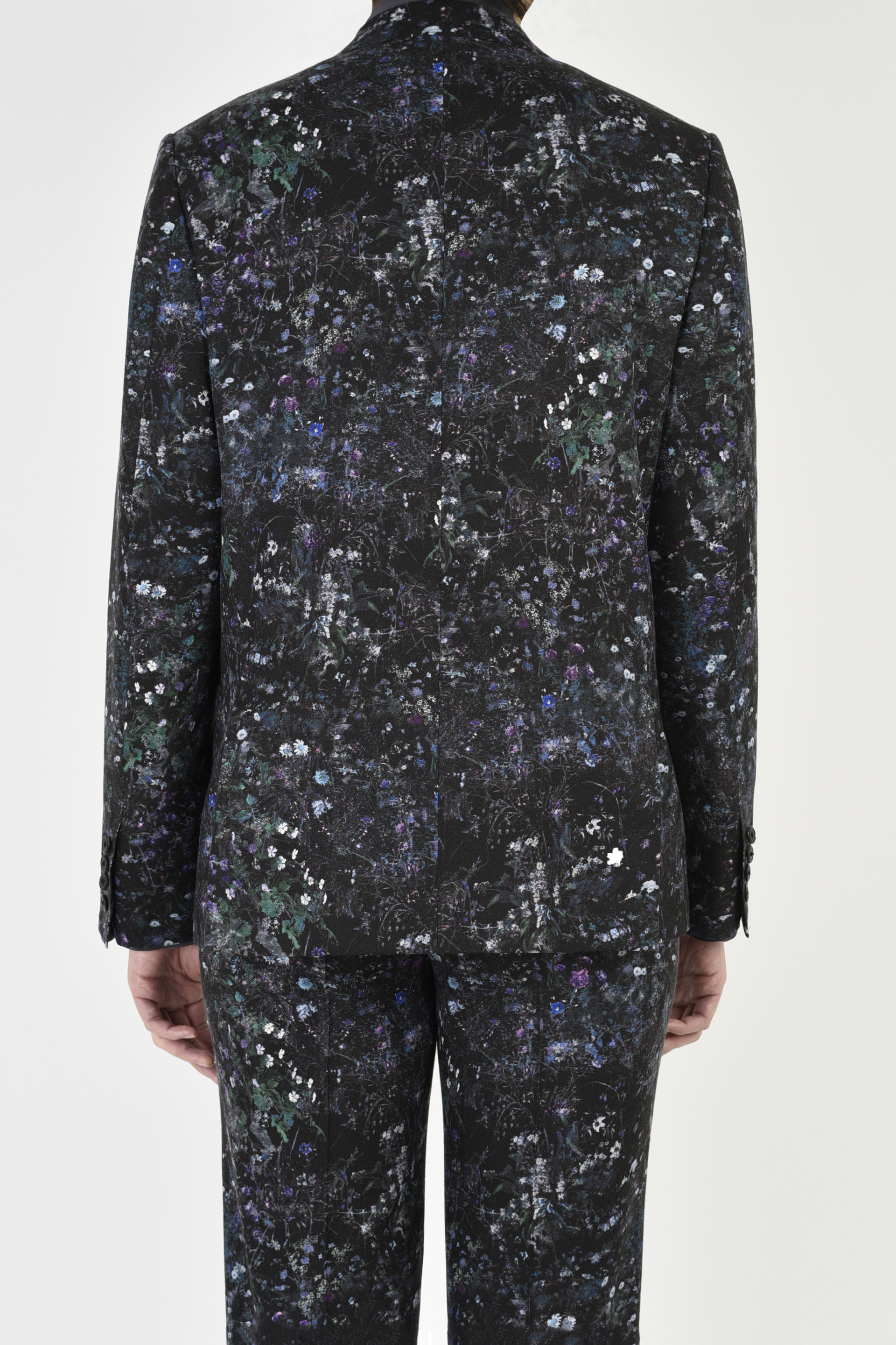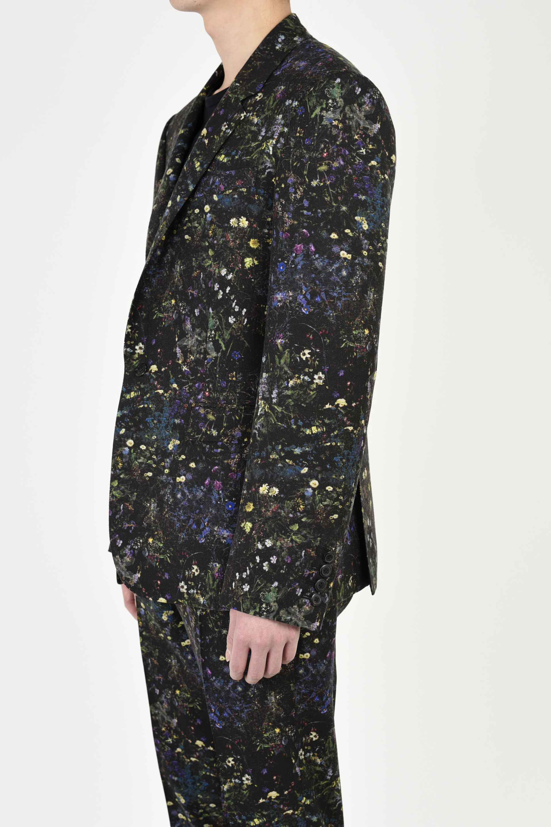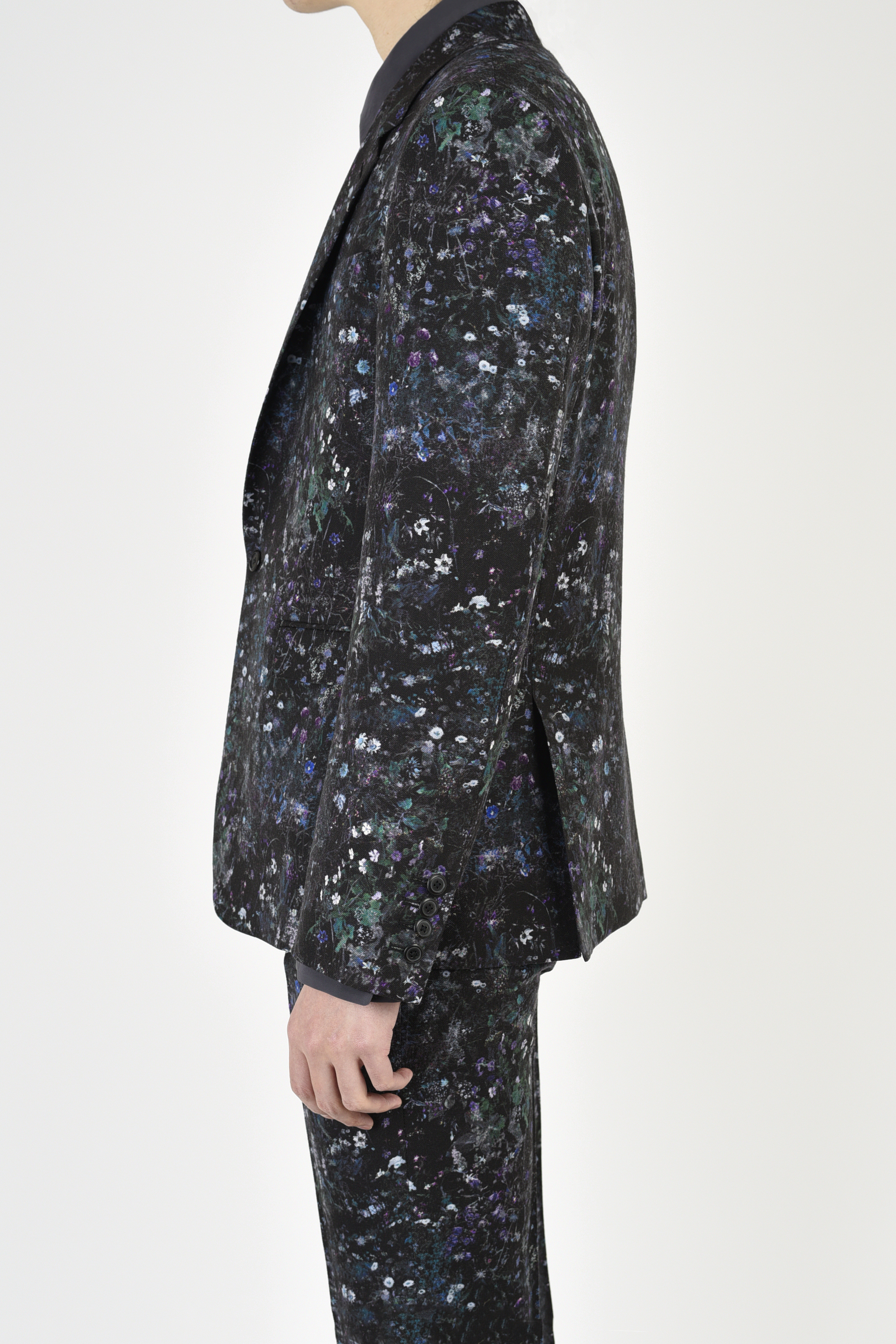 フラワー柄をプリントしたウール素材を使用した1Bジャケット。
