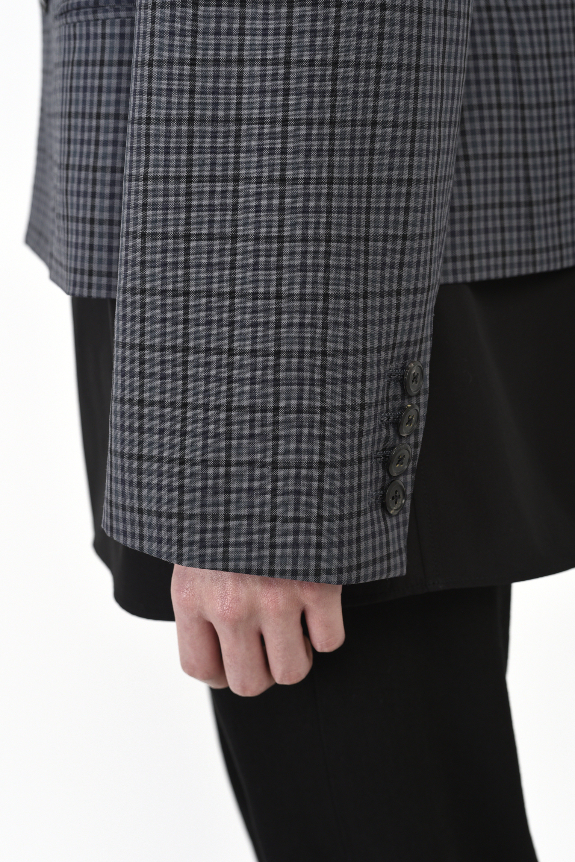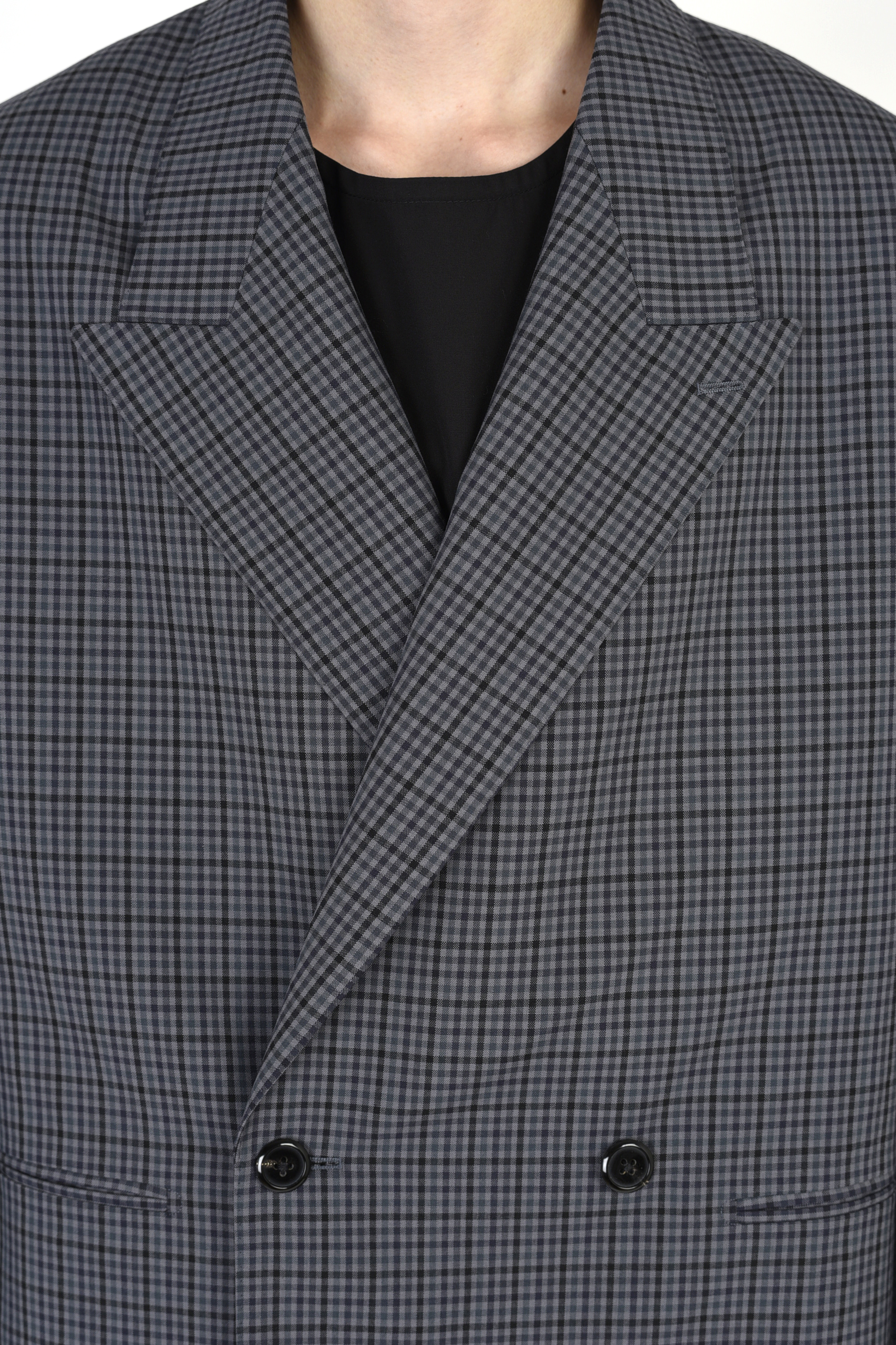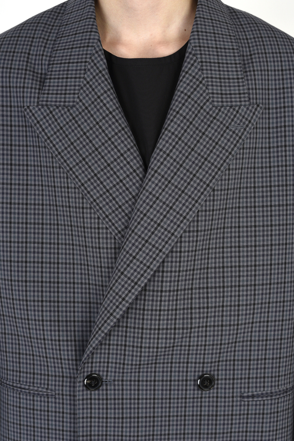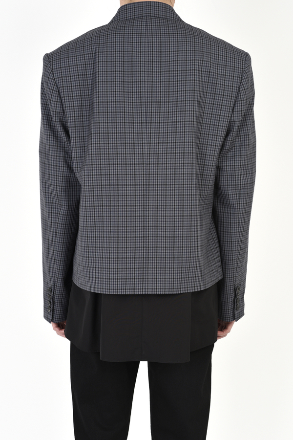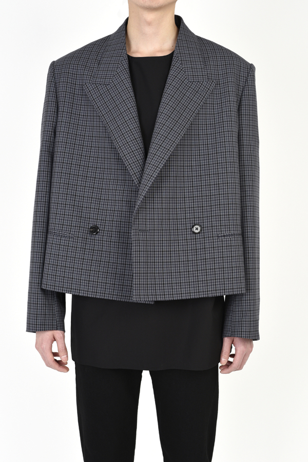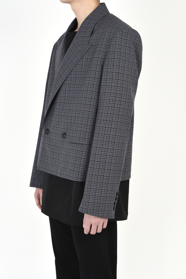 ギンガムチェック柄のウール素材を使用したショート丈のダブルブレストジャケット。