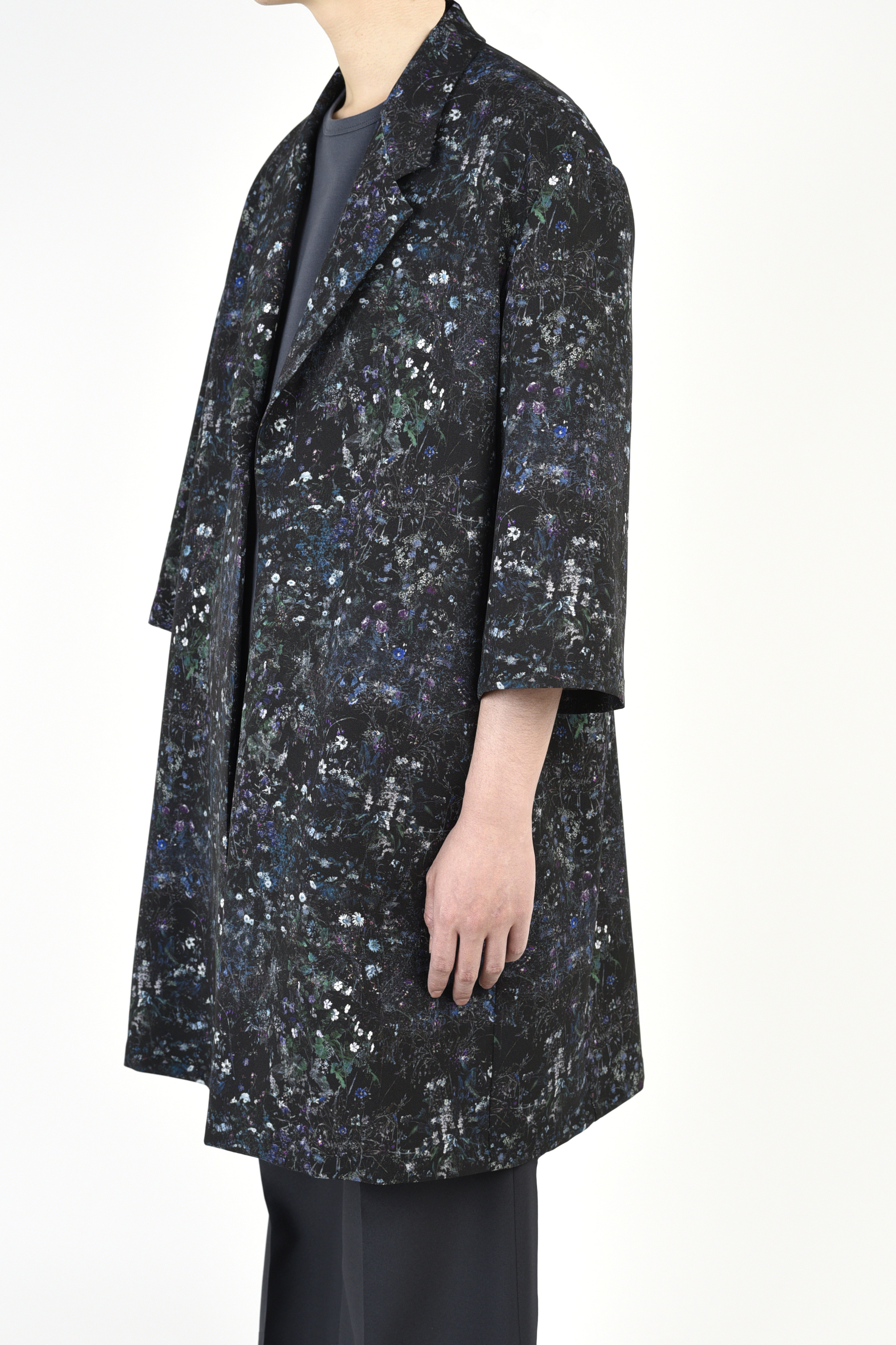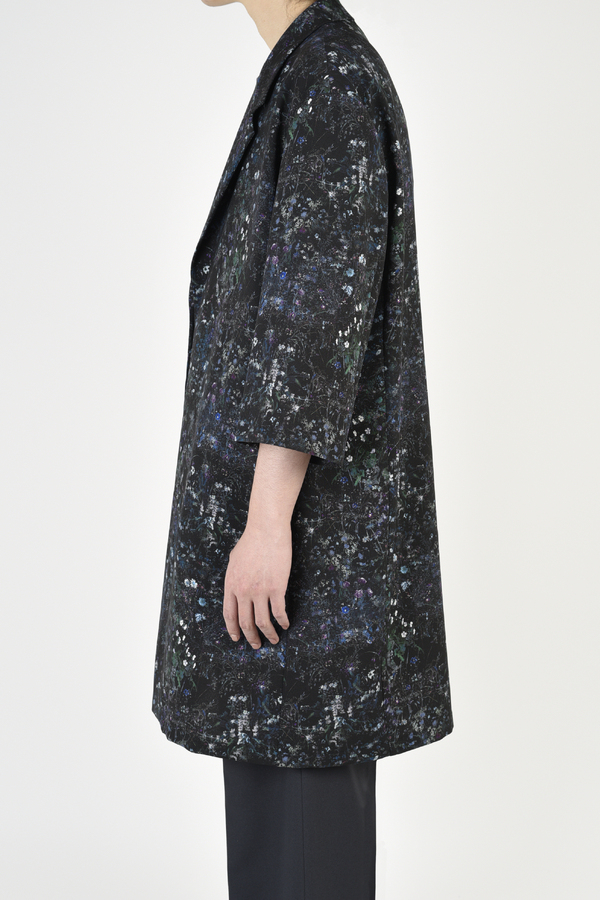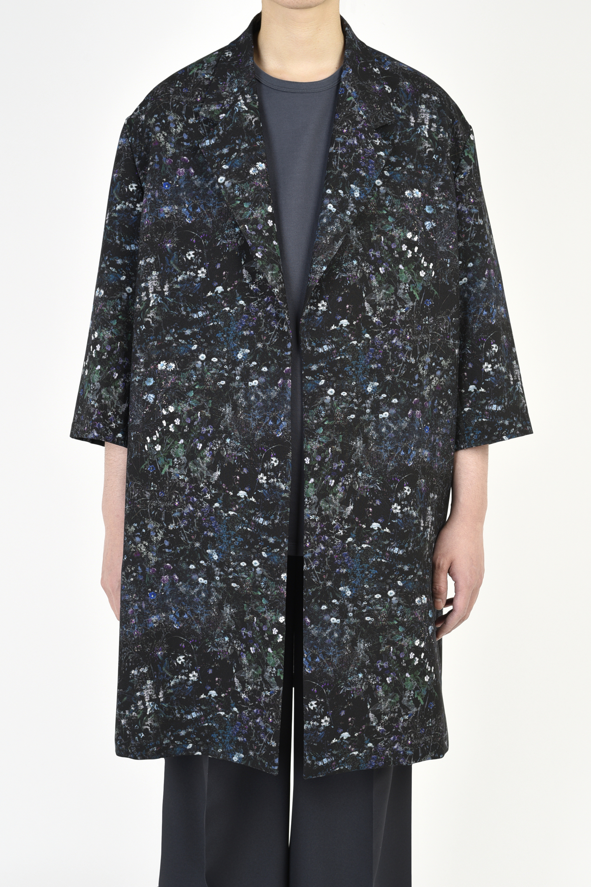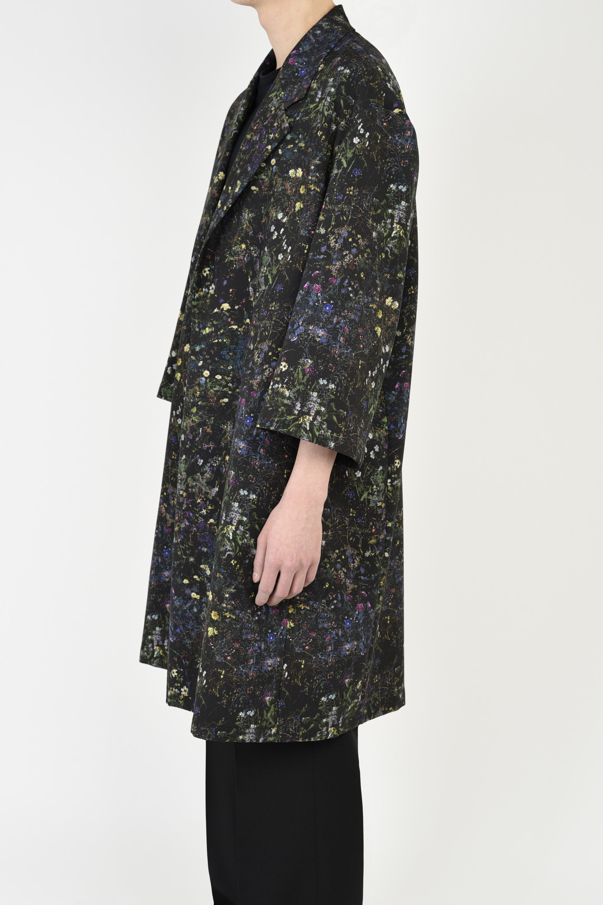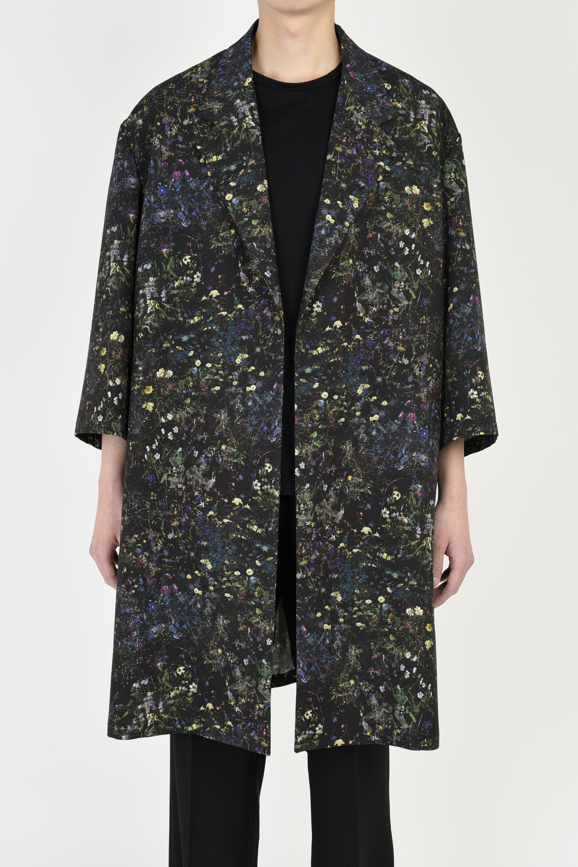 フラワー柄をプリントしたトロピカル素材を使用したアンコンロングジャケット。