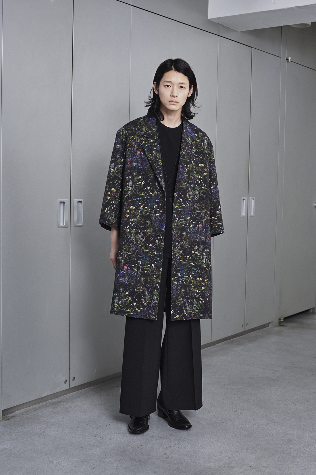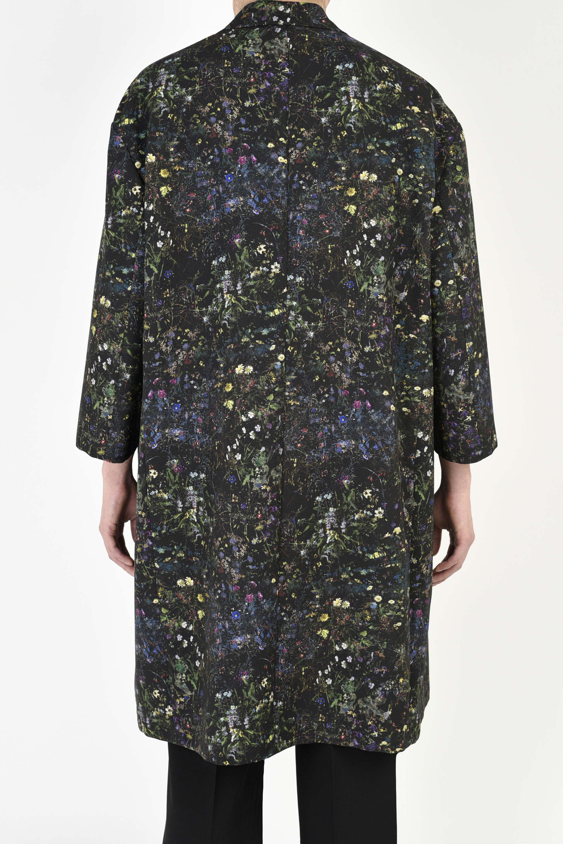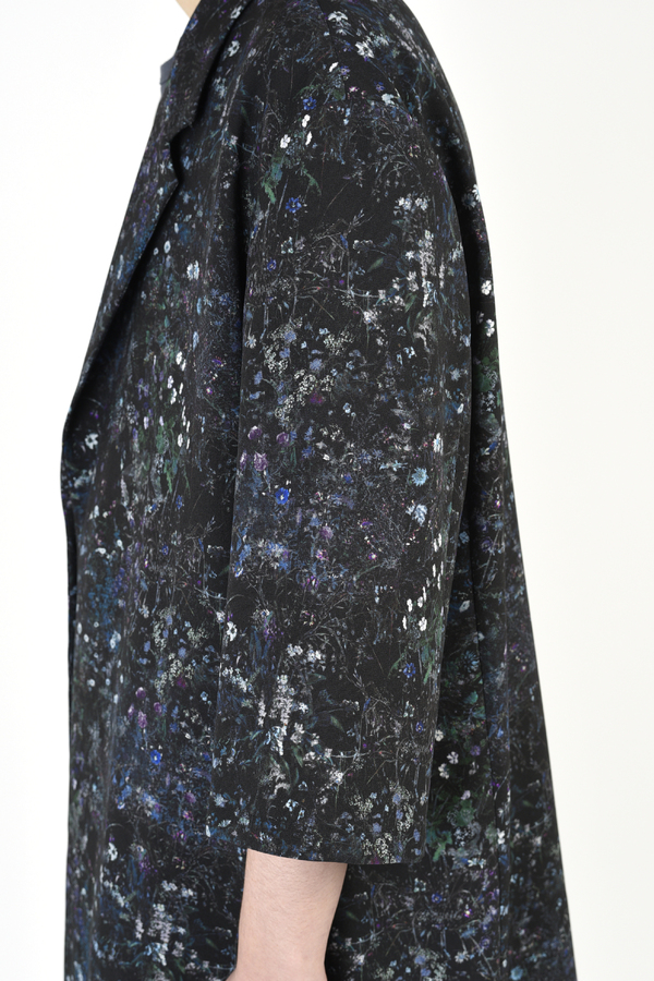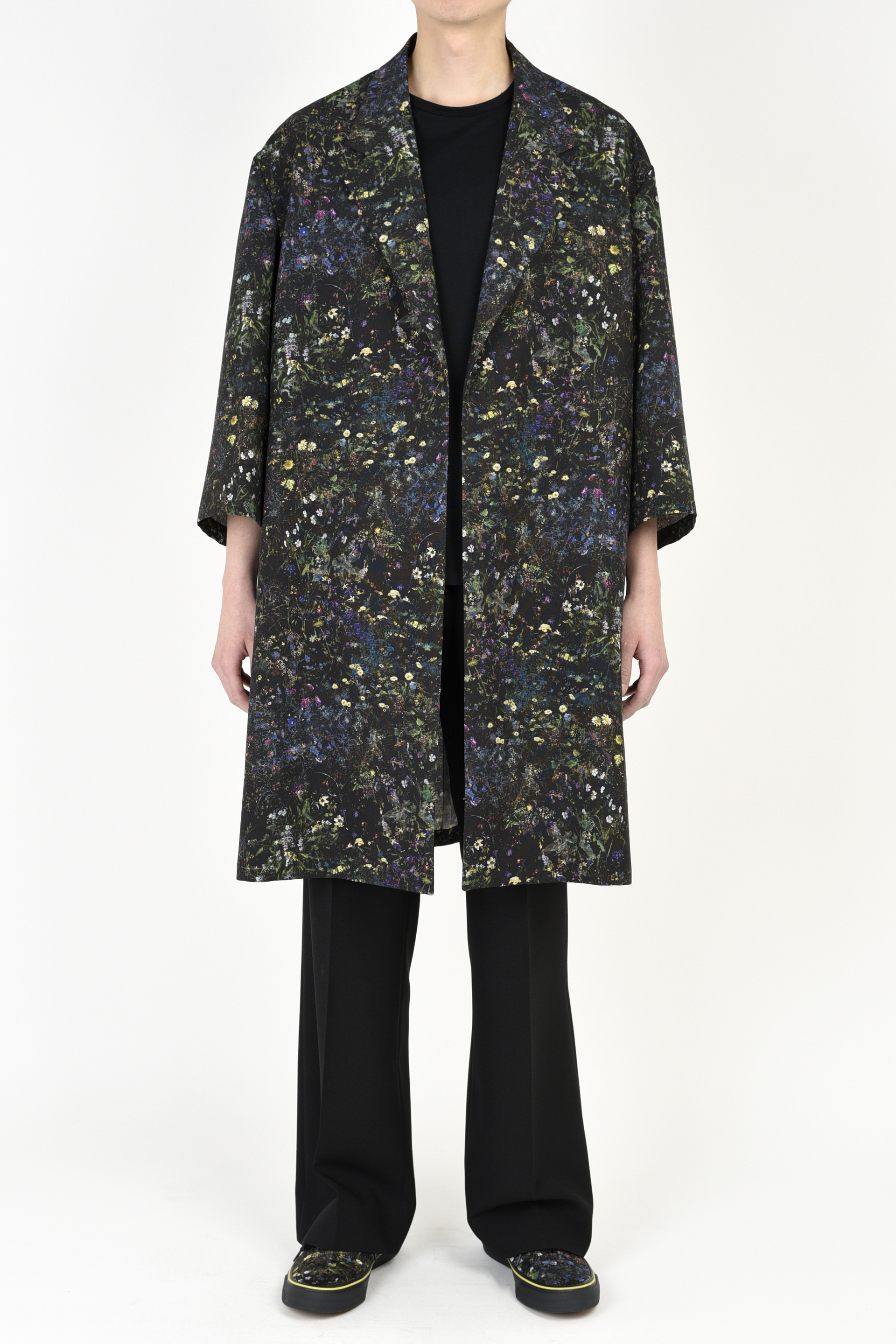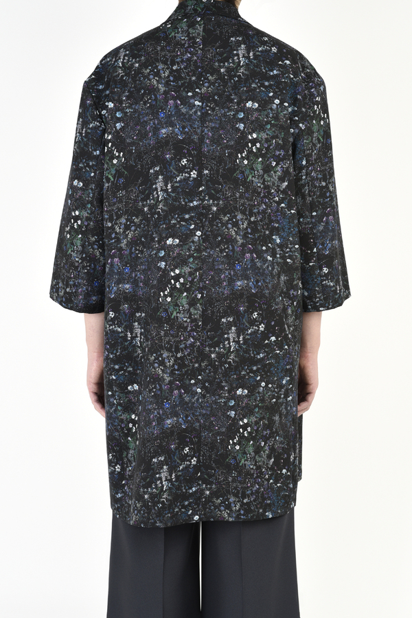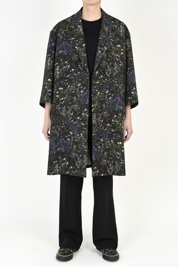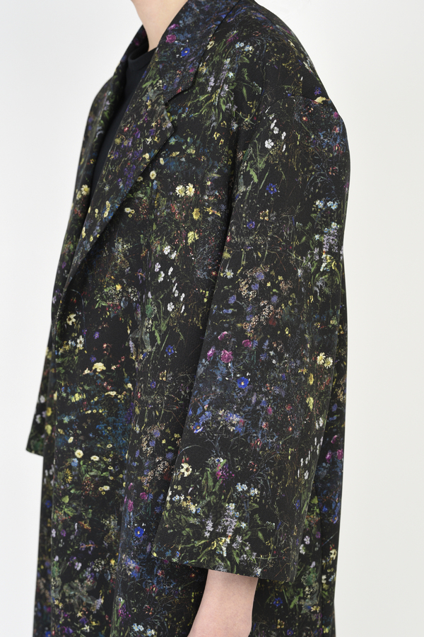 フラワー柄をプリントしたトロピカル素材を使用したアンコンロングジャケット。