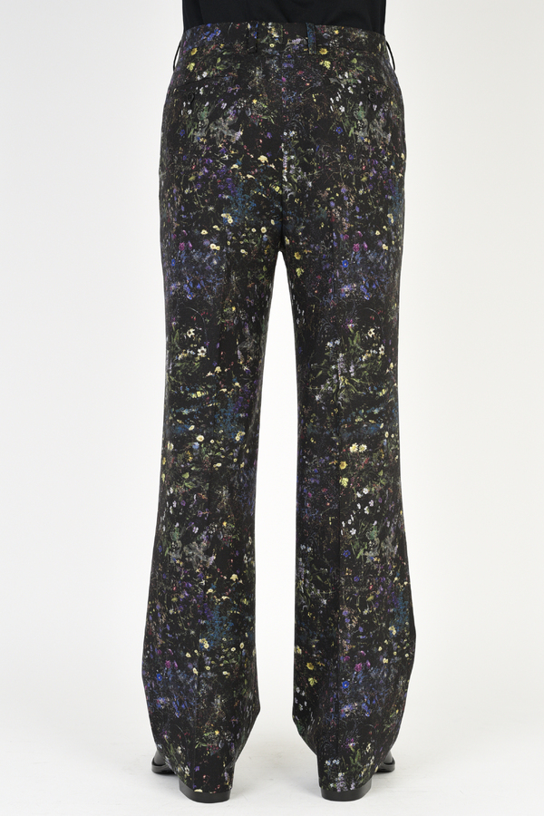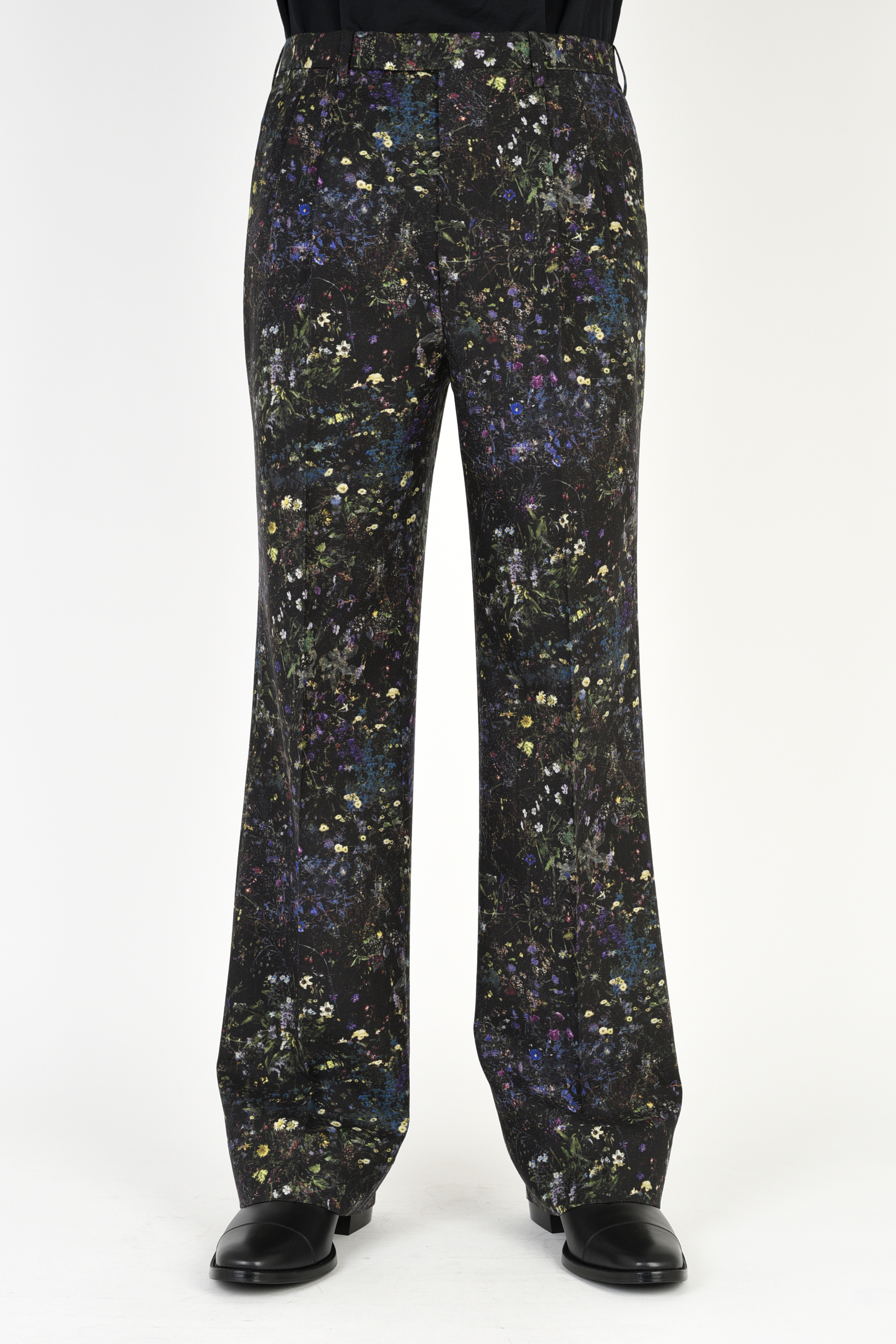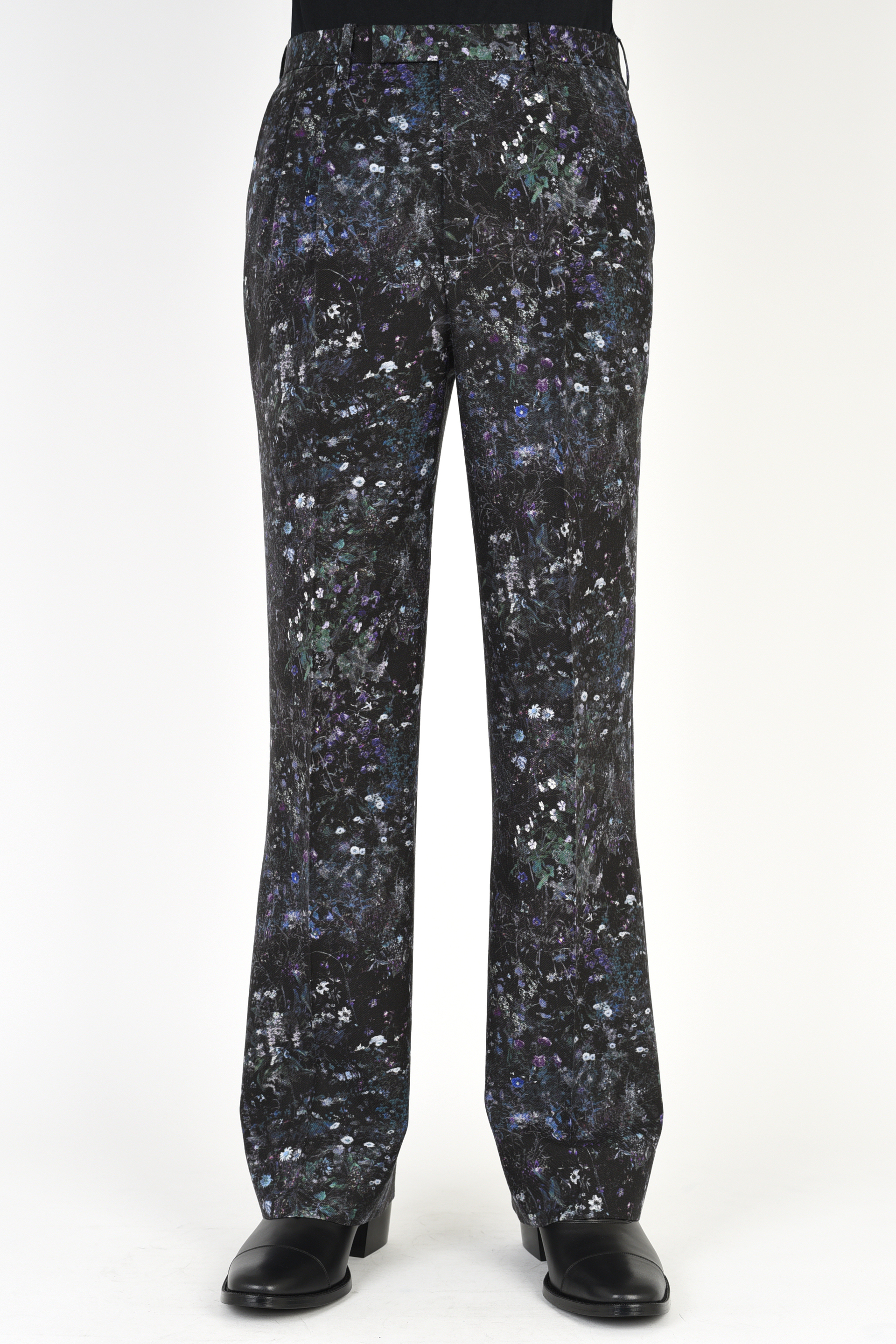 フラワー柄をプリントしたウール素材を使用したスリムフレアスラックス。