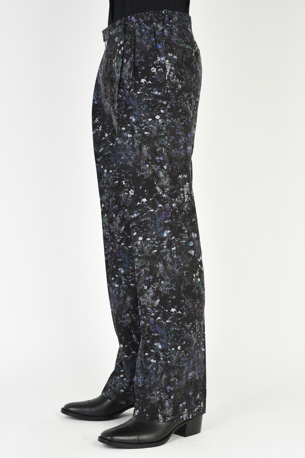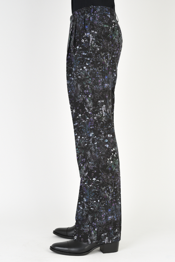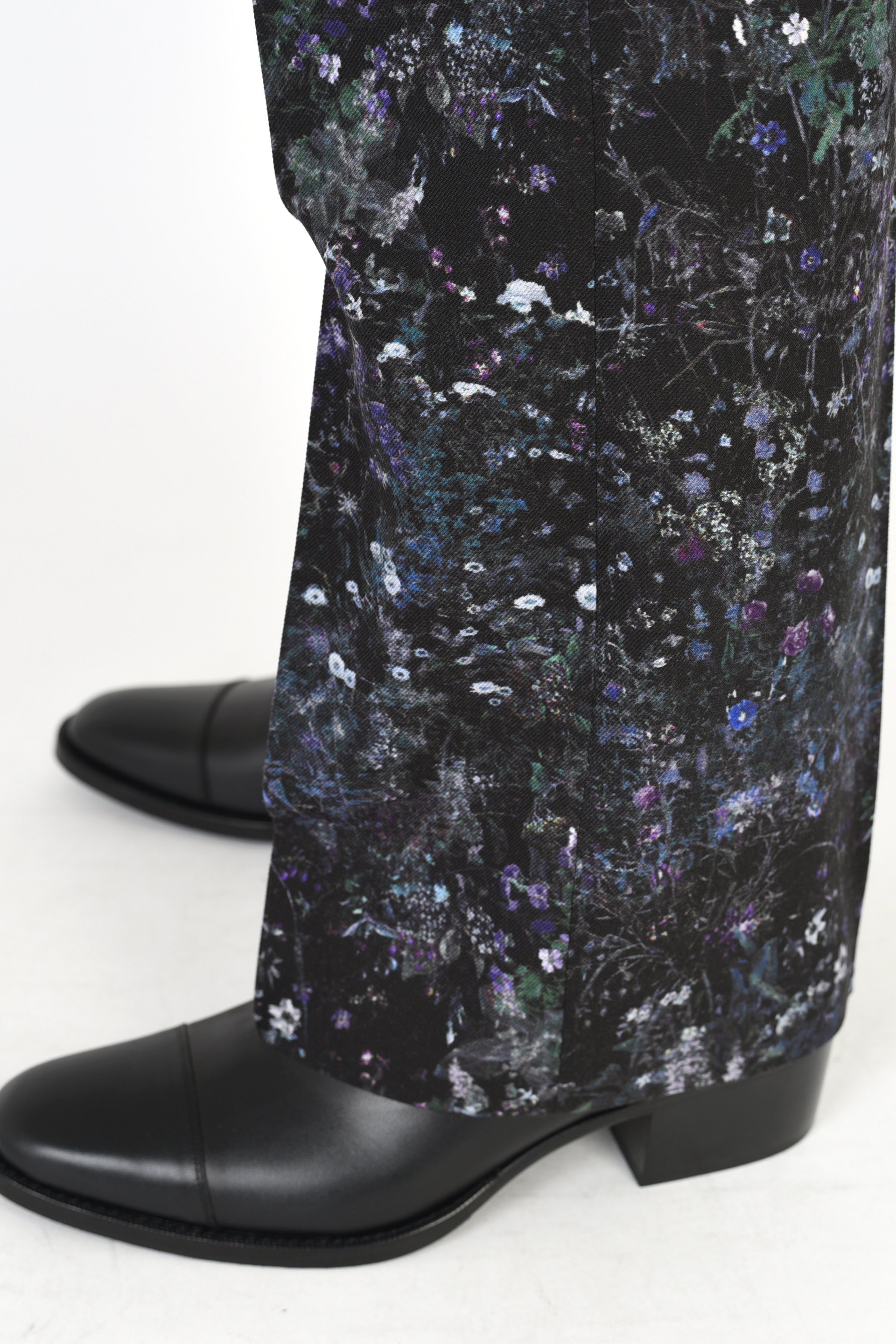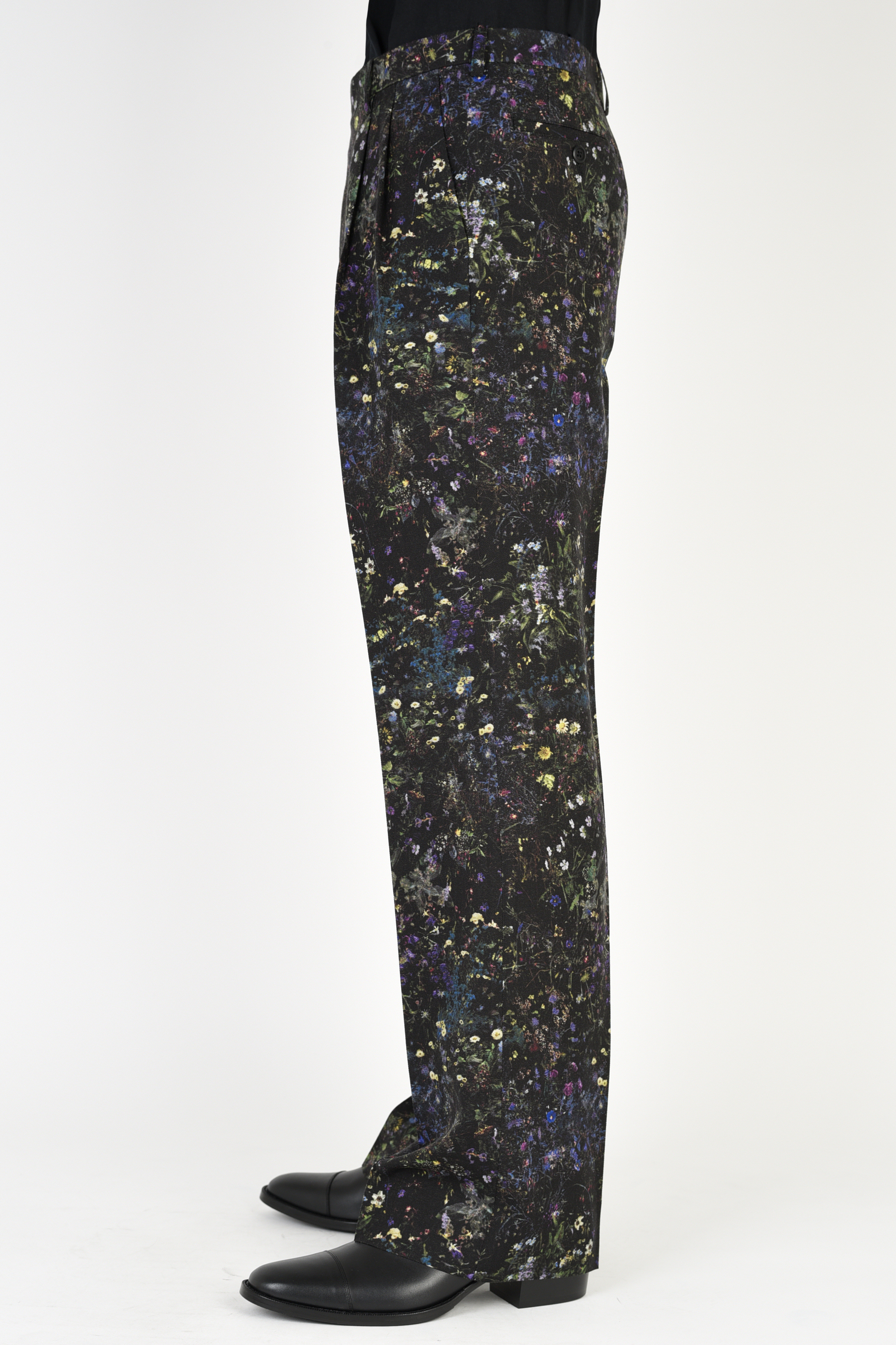 フラワー柄をプリントしたウール素材を使用したスリムフレアスラックス。
