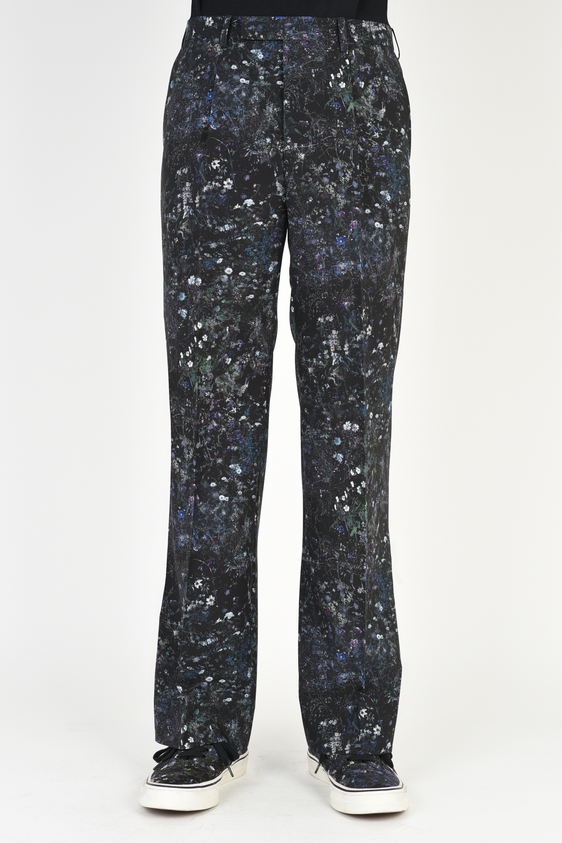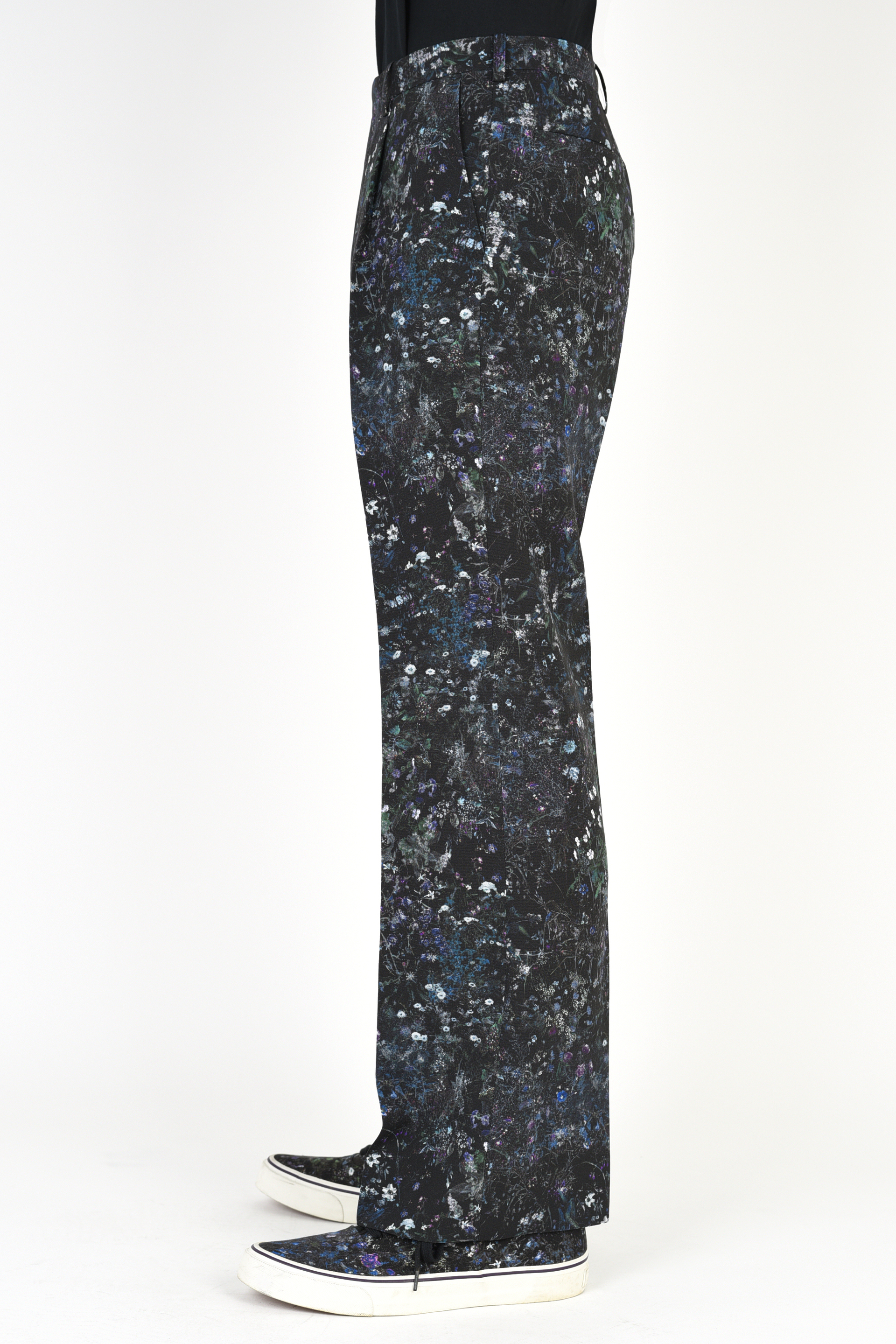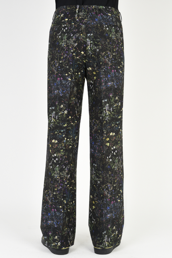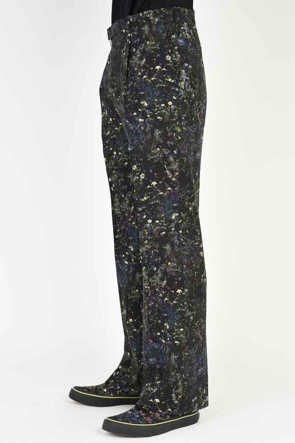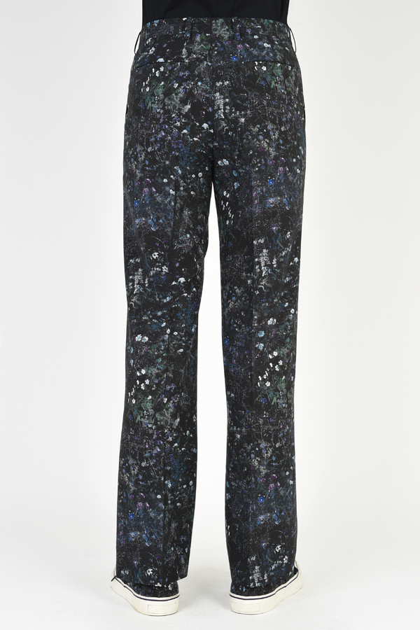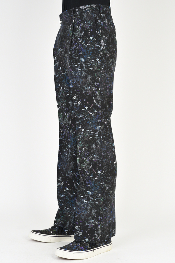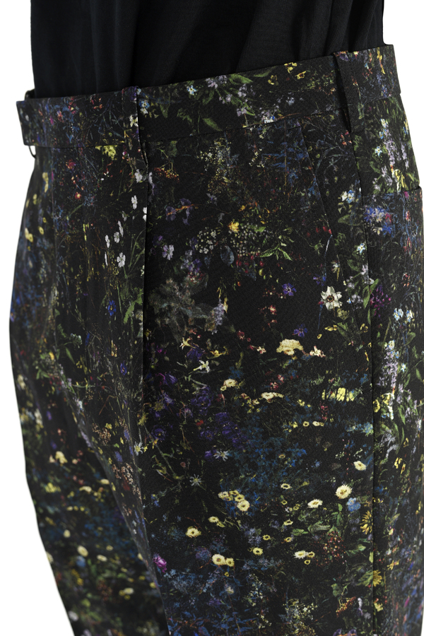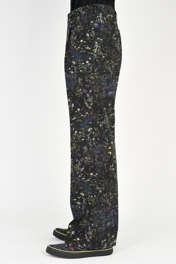 フラワー柄をプリントしたトロピカル素材を使用した1タックスリムフレアスラックス。
