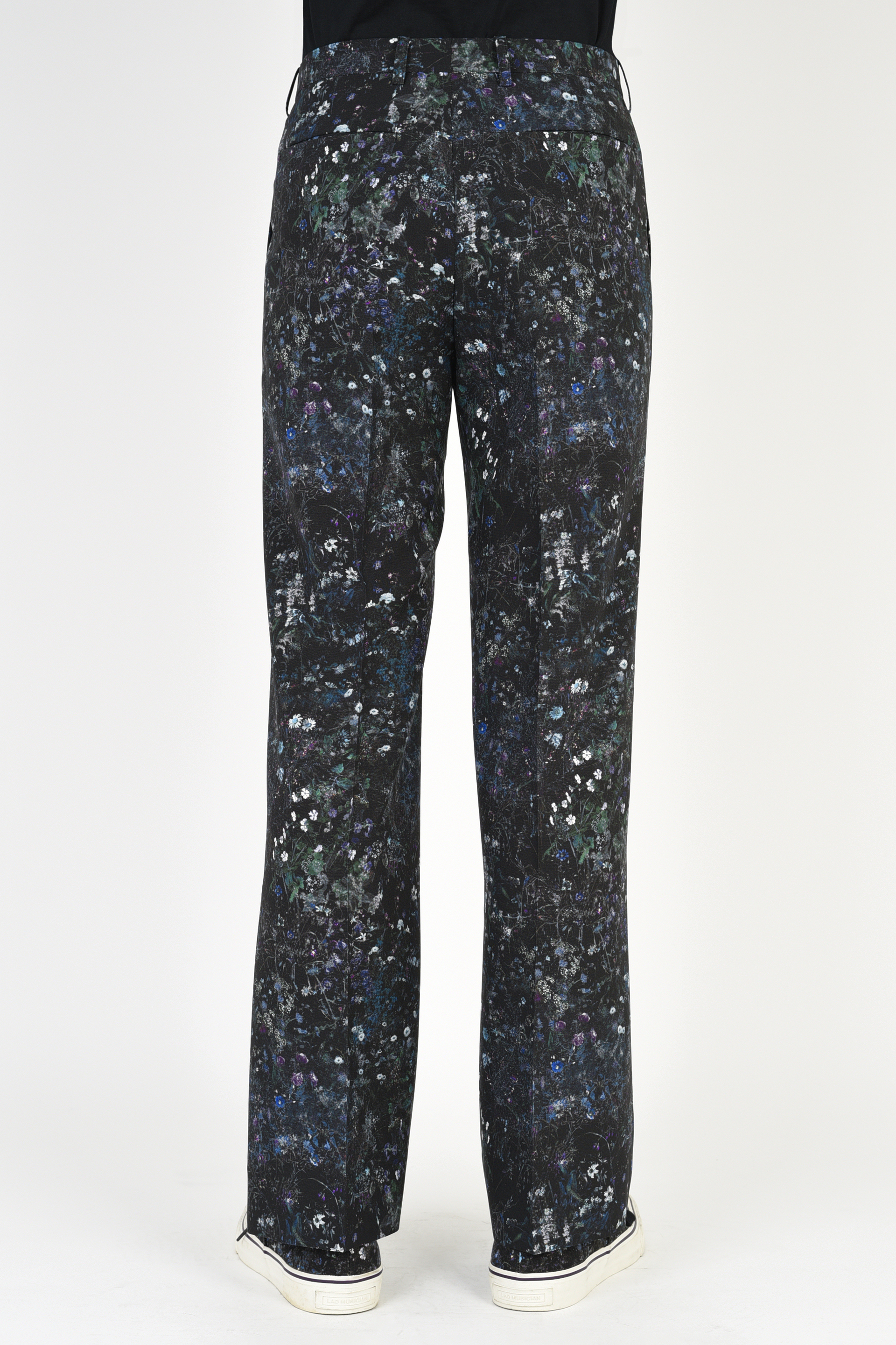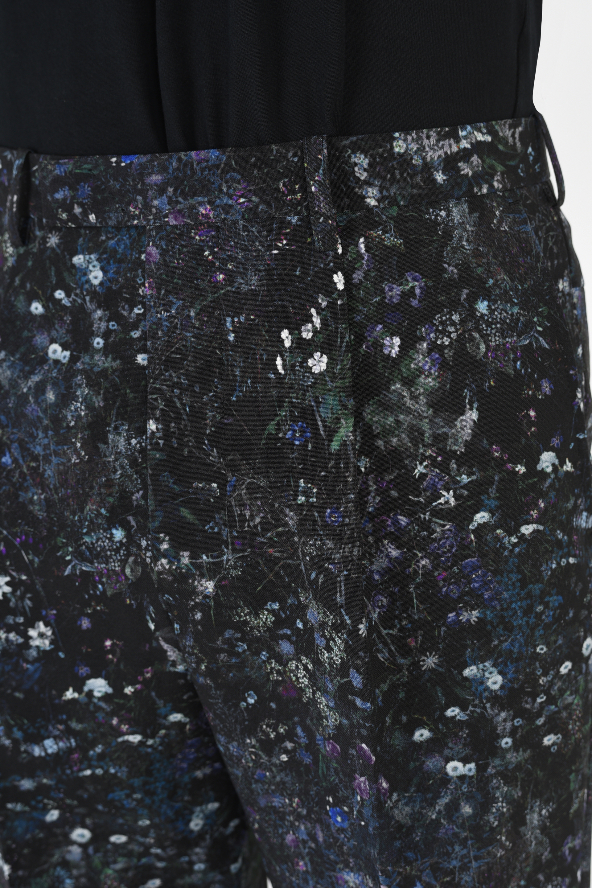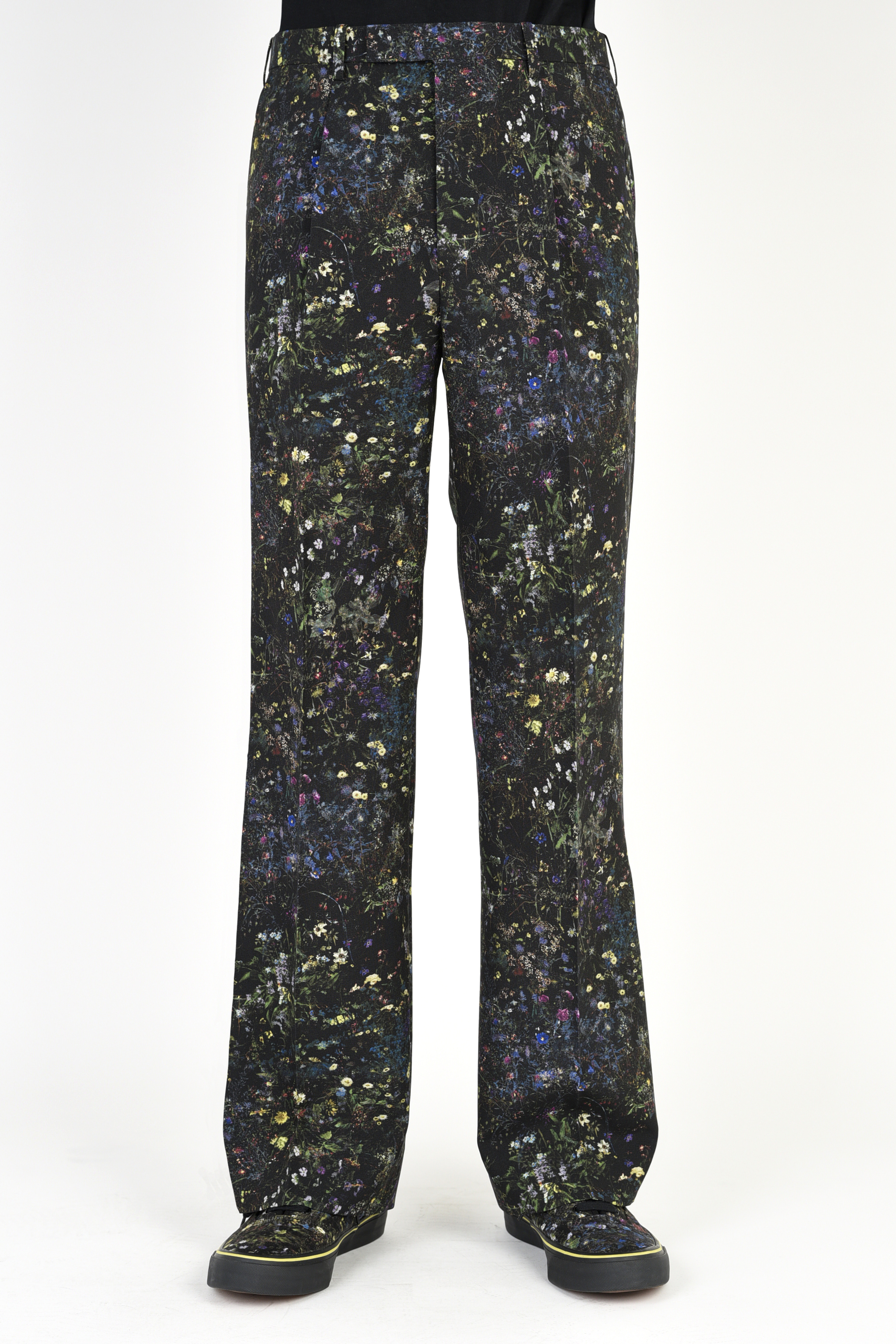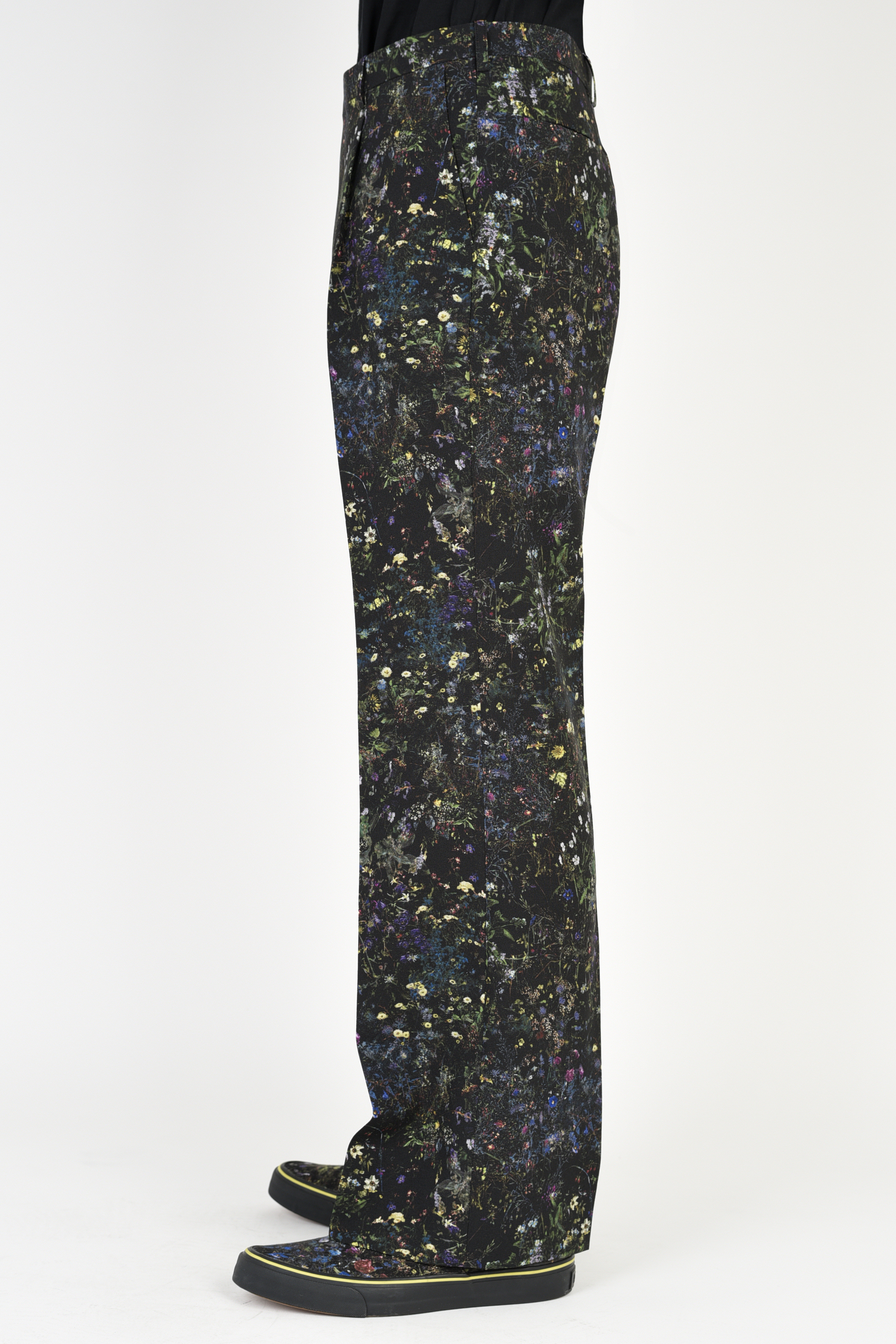 フラワー柄をプリントしたトロピカル素材を使用した1タックスリムフレアスラックス。