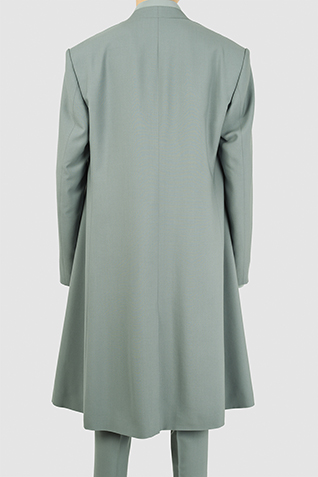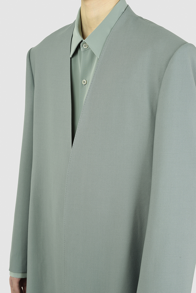 上品な光沢としなやかな風合いを持つウールギャバ素材を使用したロング丈のカラーレスジャケット。