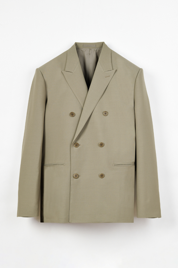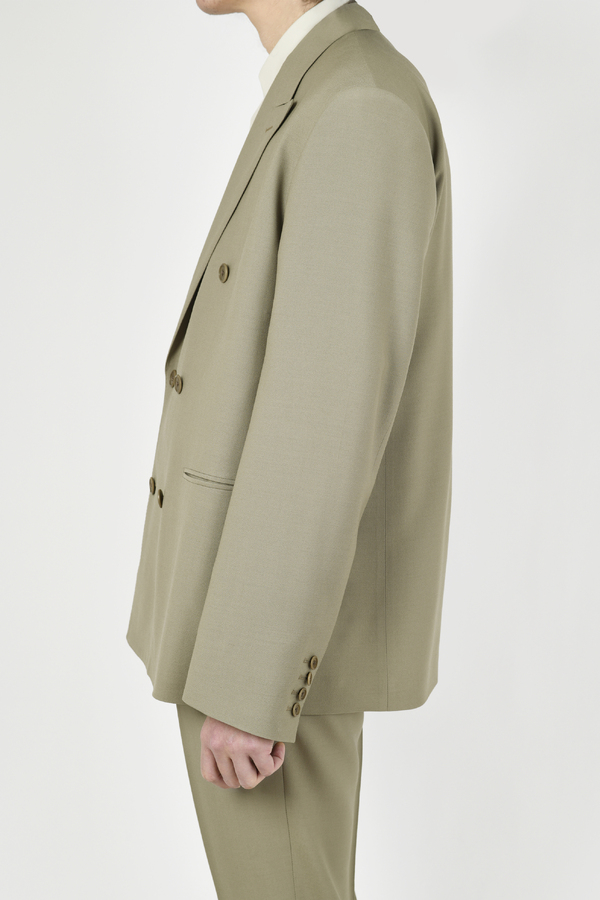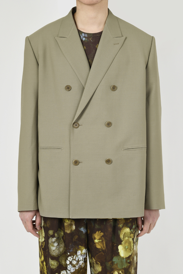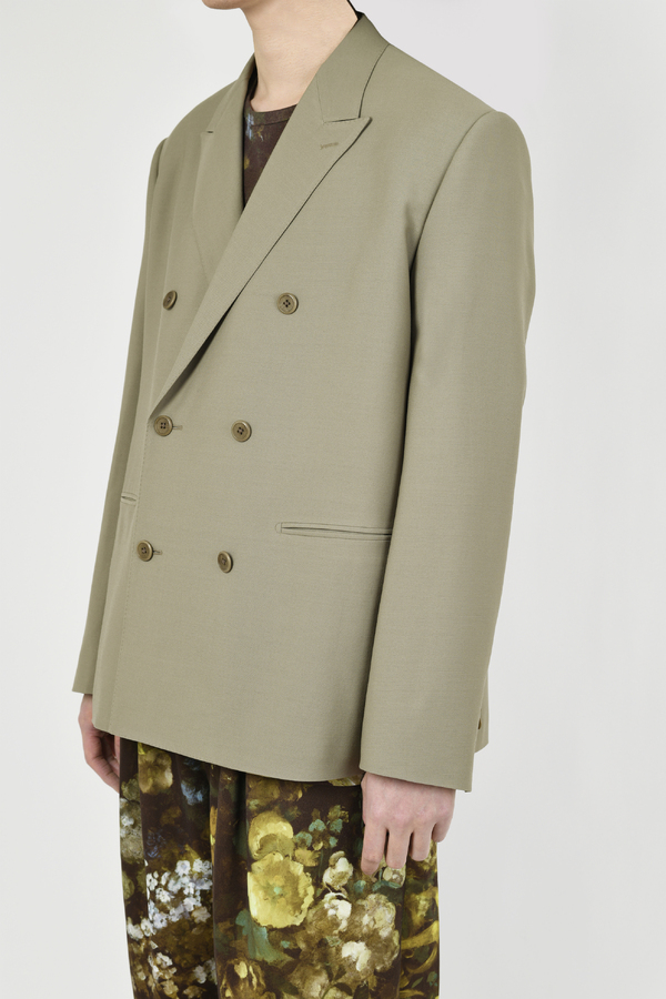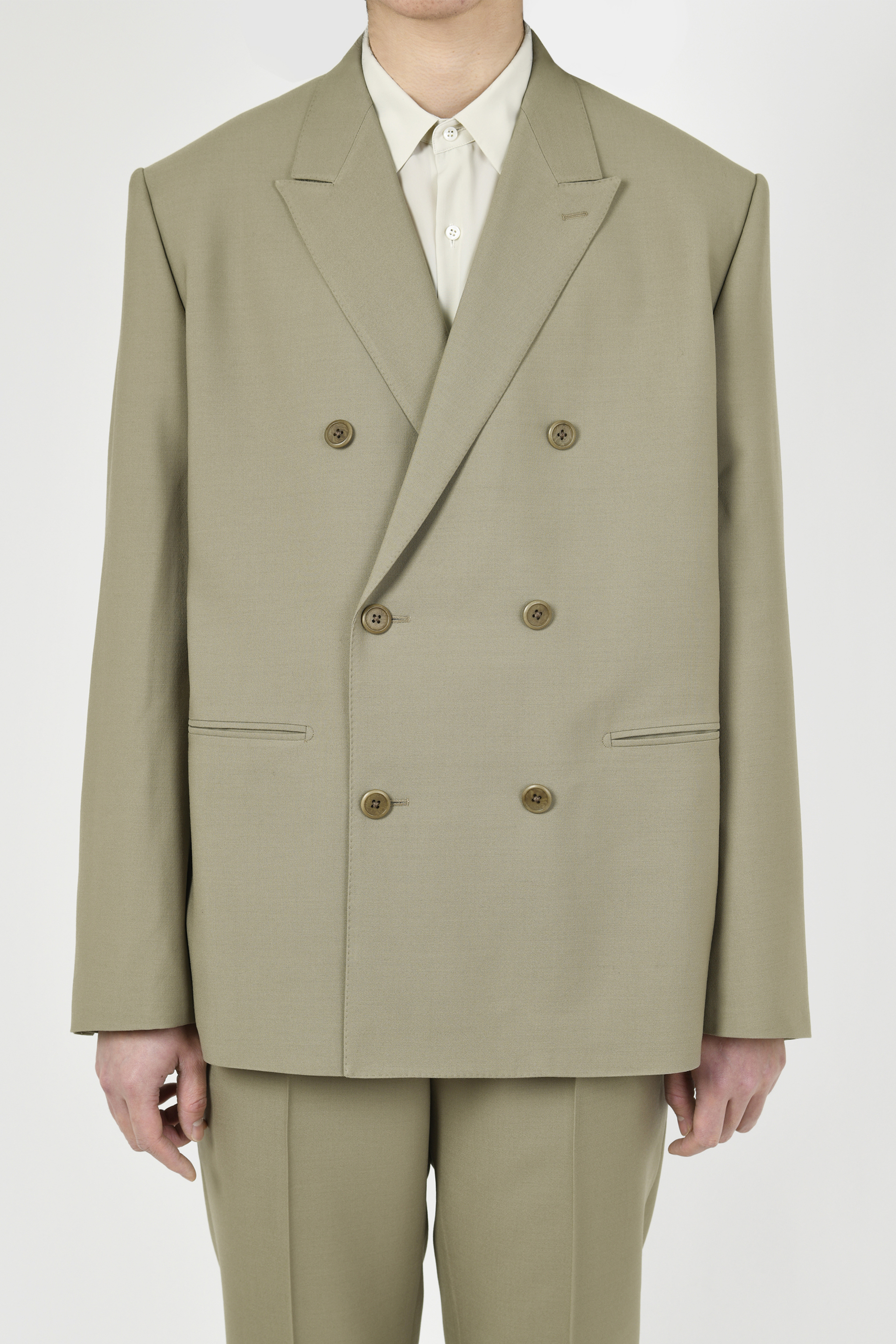 上品な光沢としなやかな風合いを持つウールギャバ素材を使用したダブルブレストジャケット。
