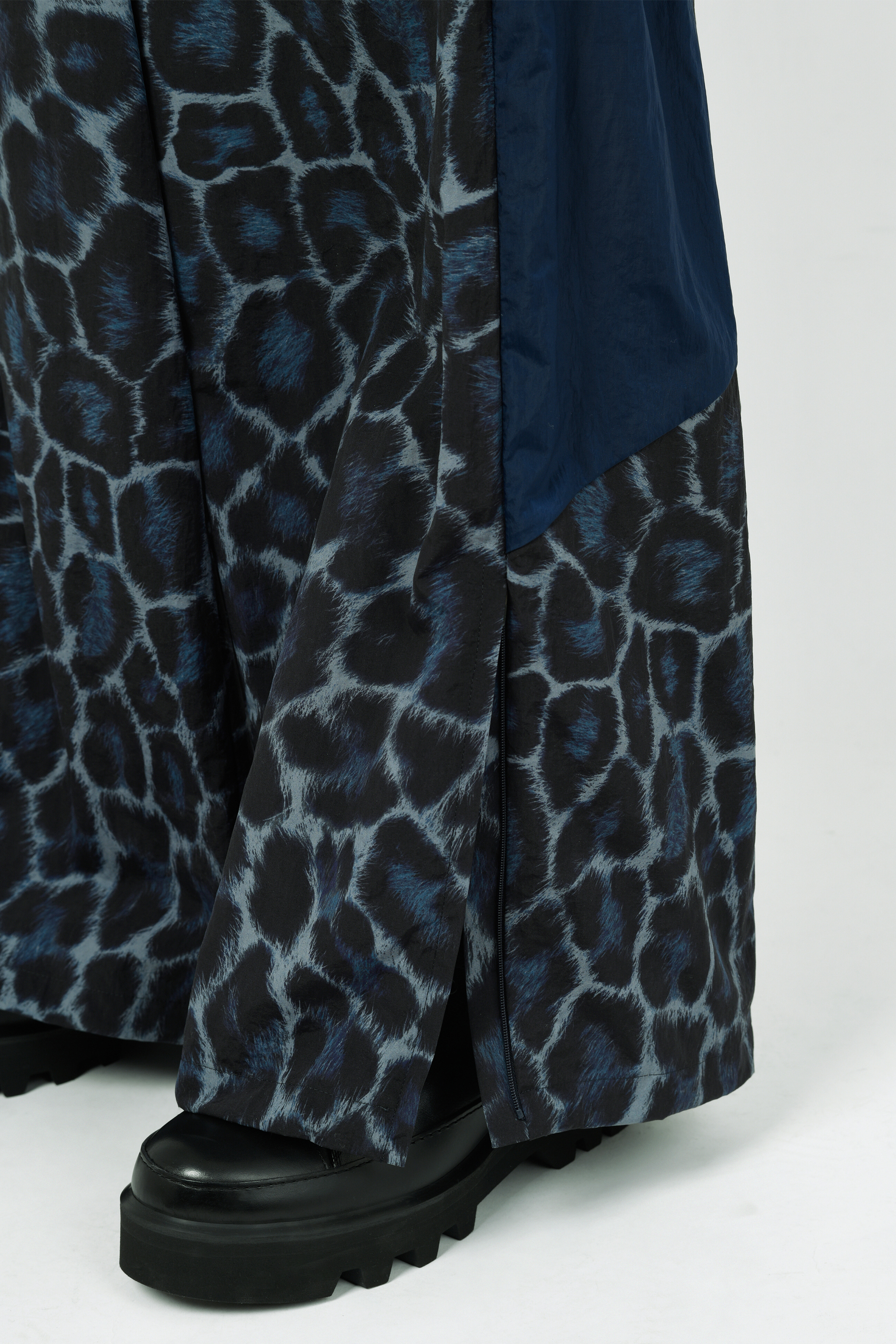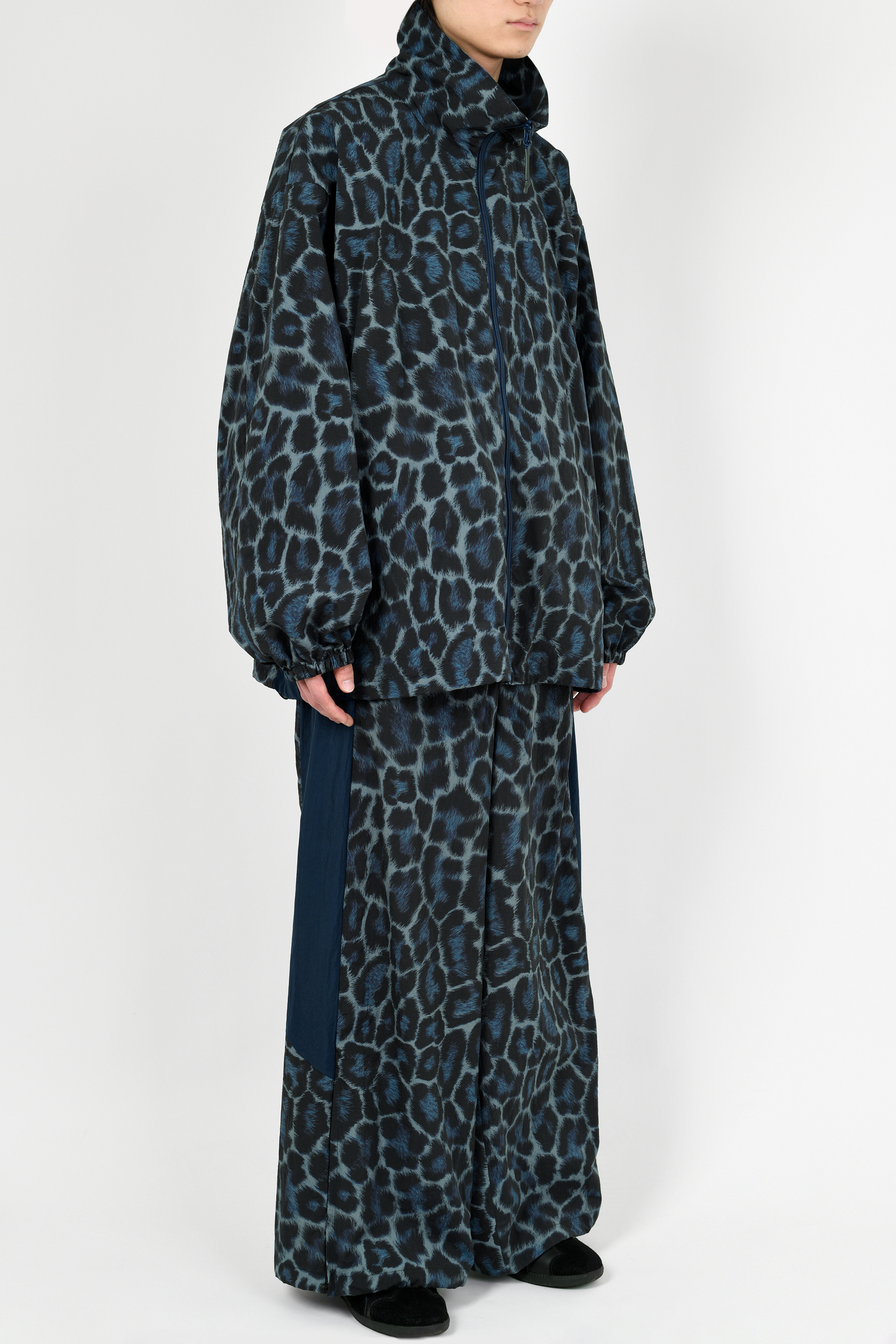 レオパード柄をプリントした高密度ナイロン素材を使用したオーバーパンツ。