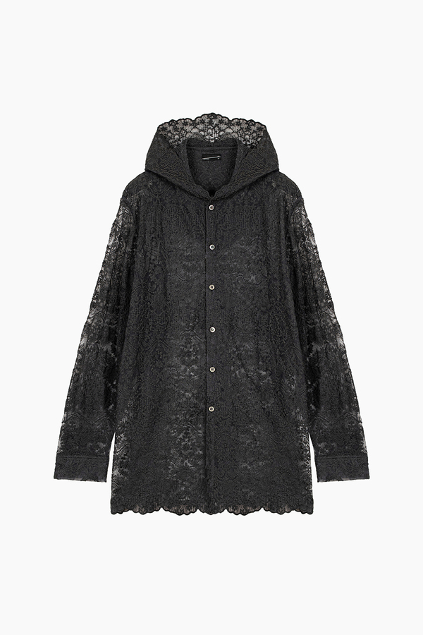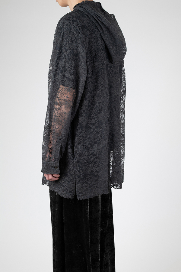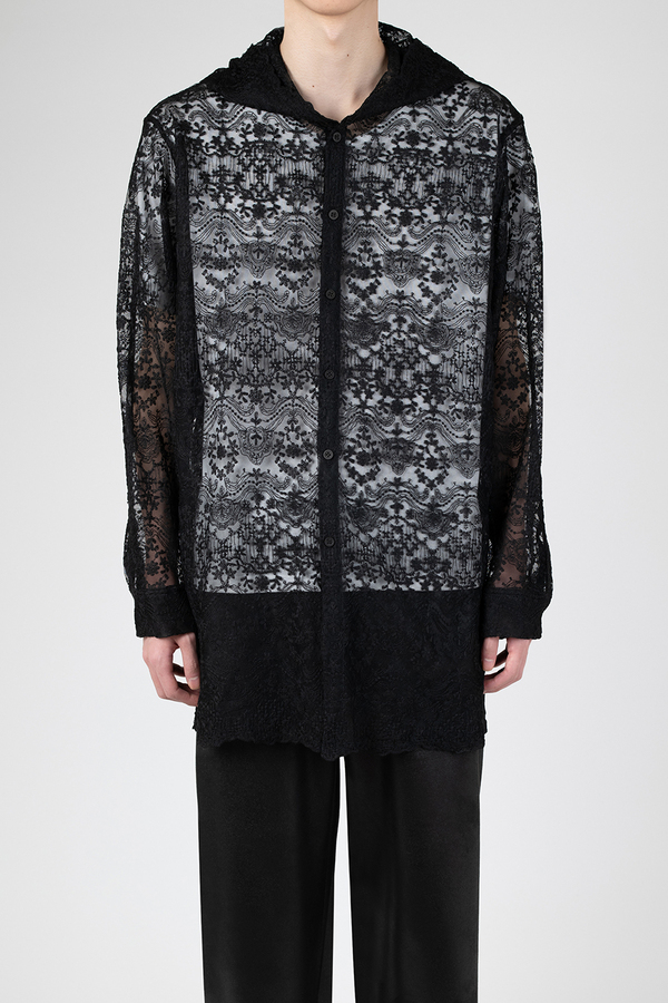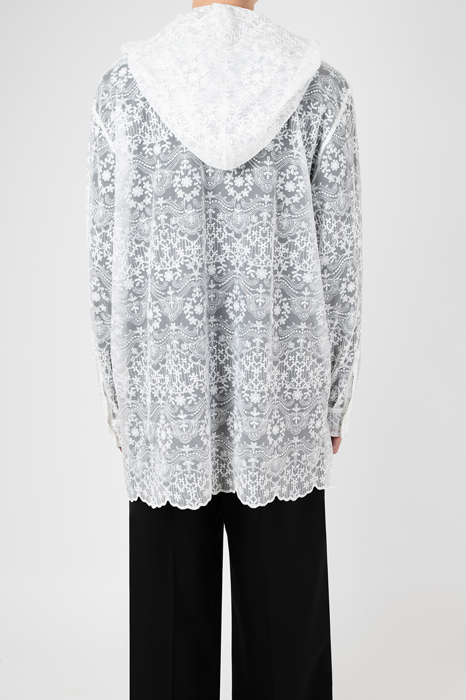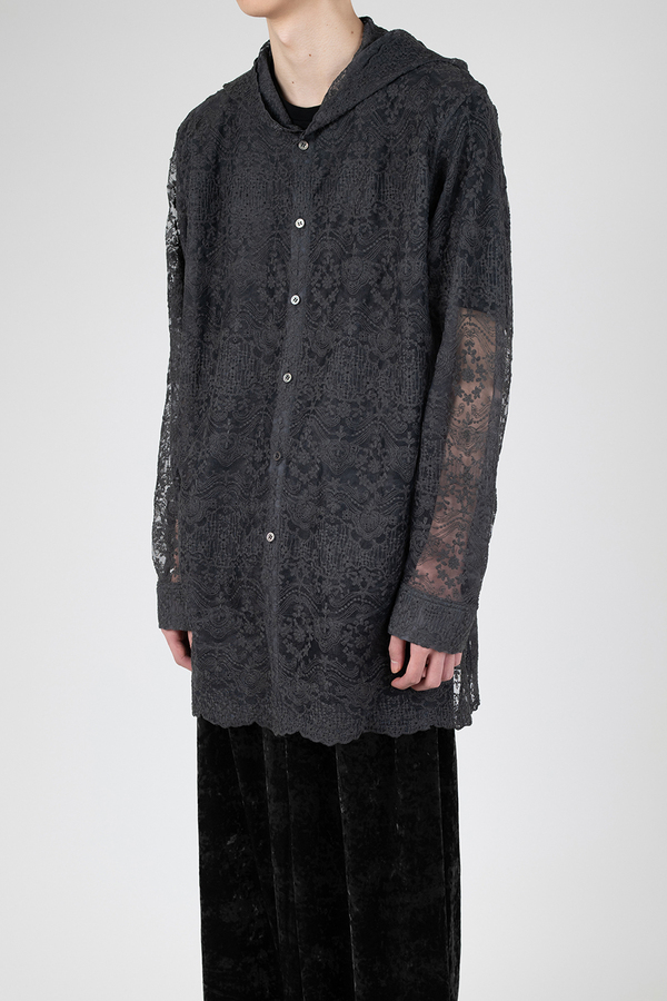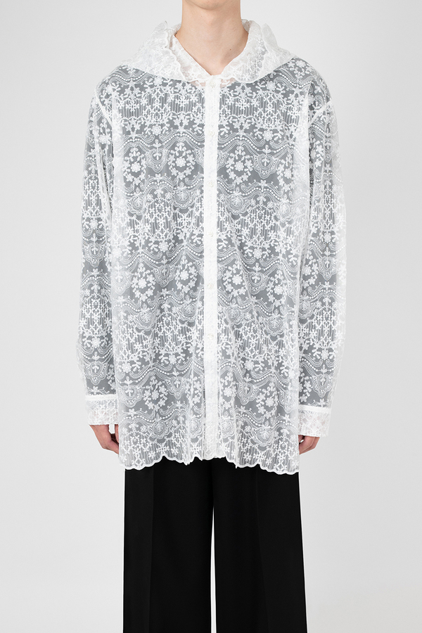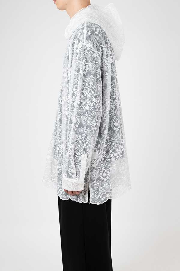 エンブロイダリーレース素材を使用したフーデットビッグシャツ。