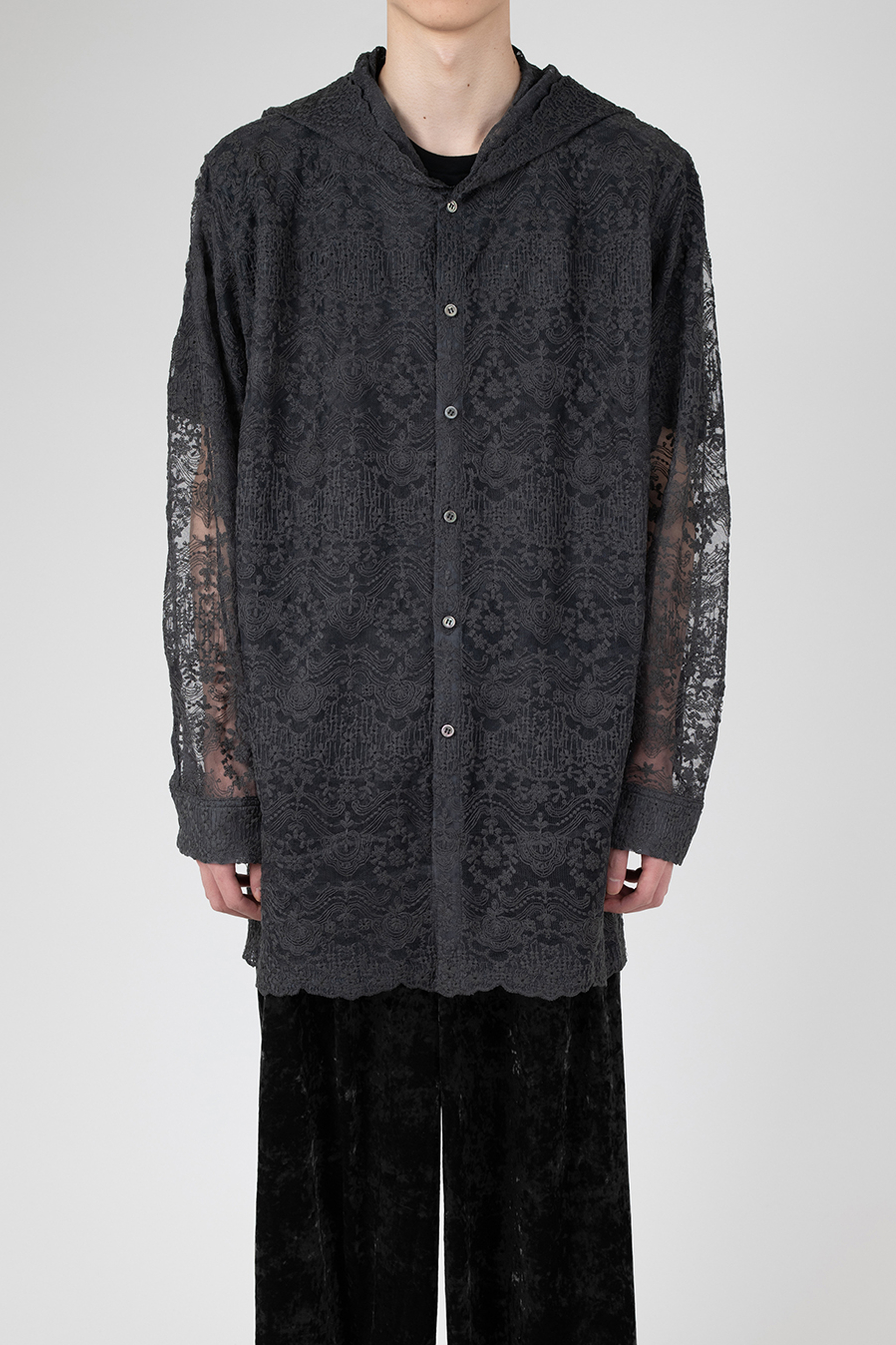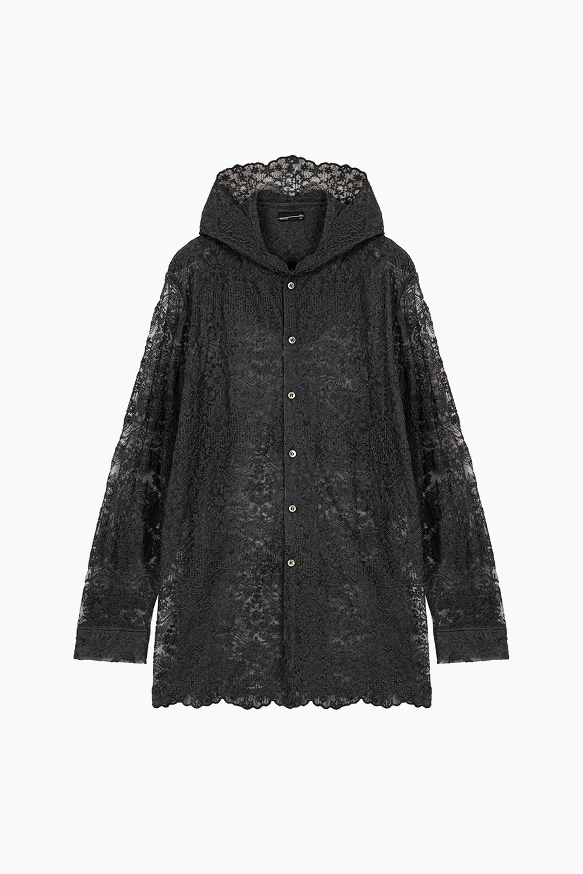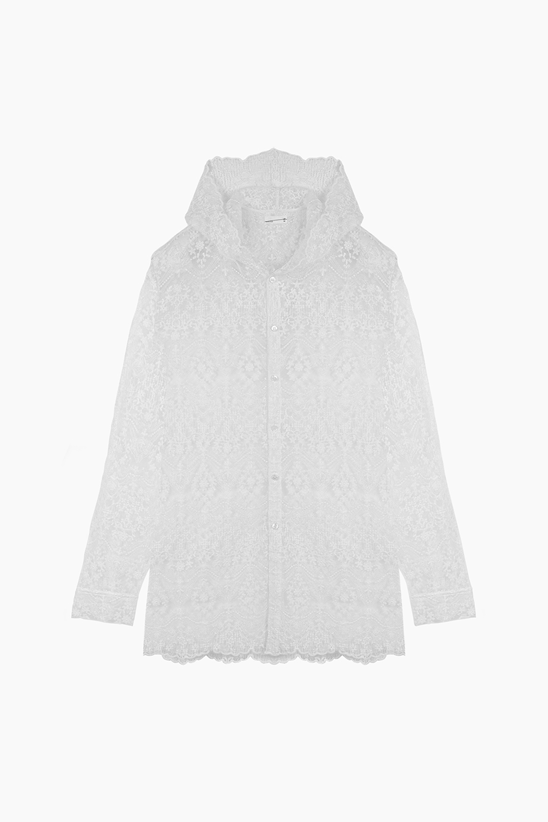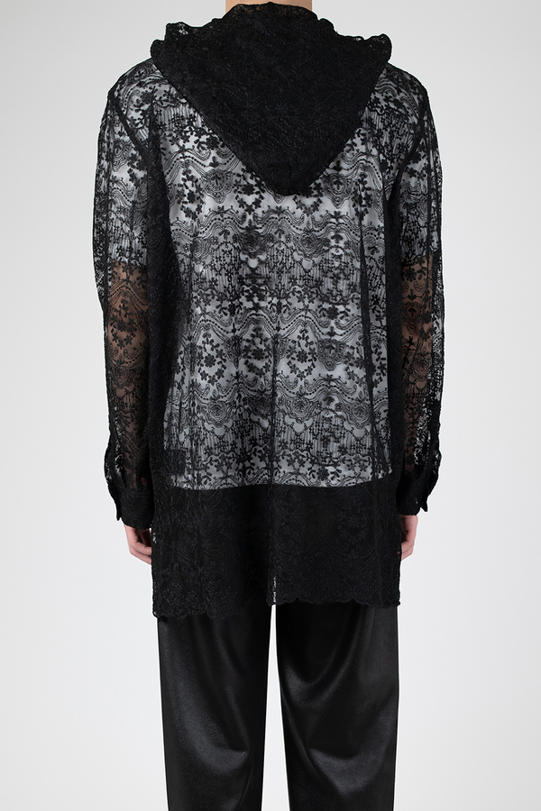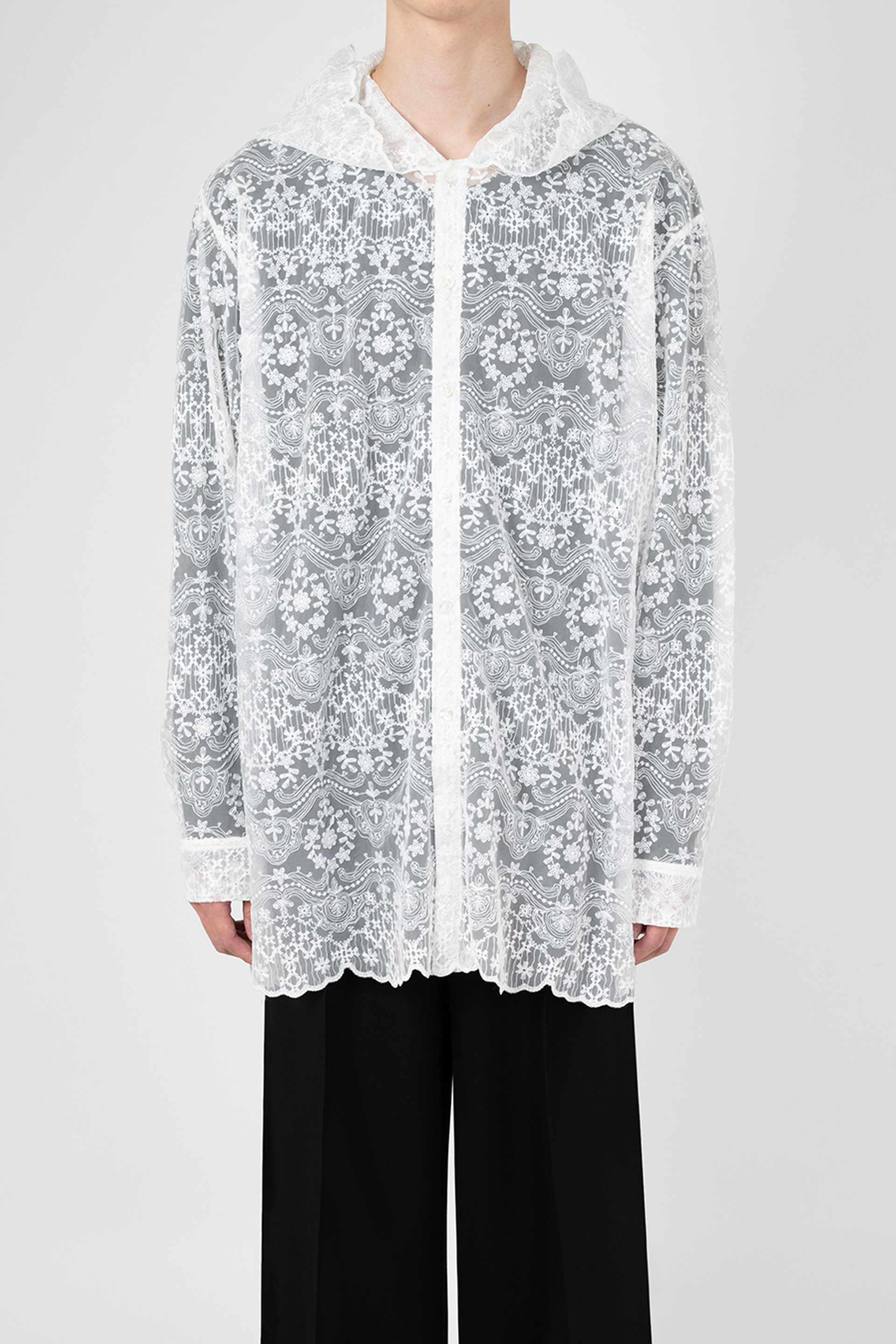 エンブロイダリーレース素材を使用したフーデットビッグシャツ。