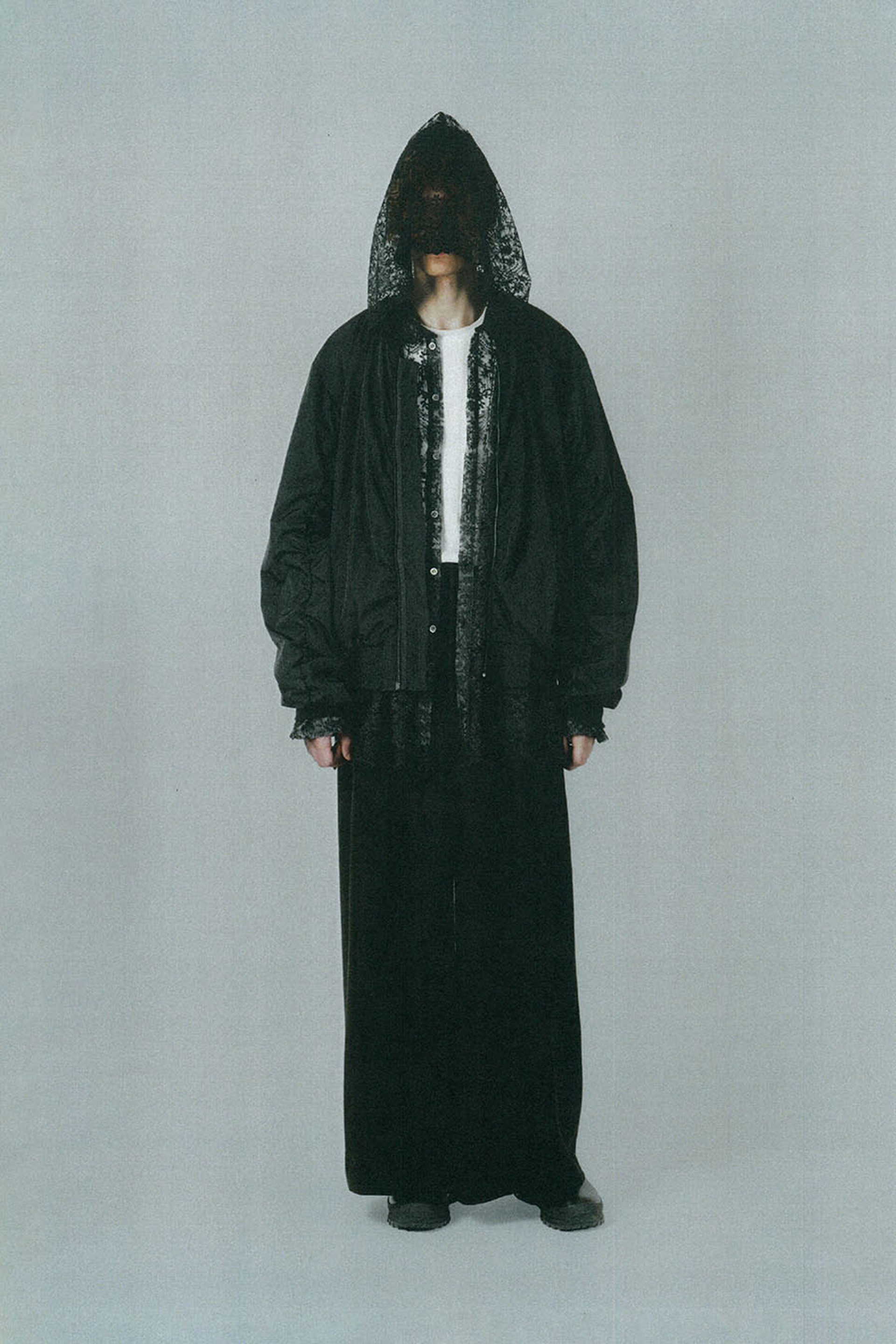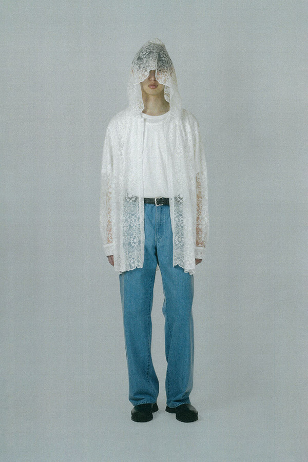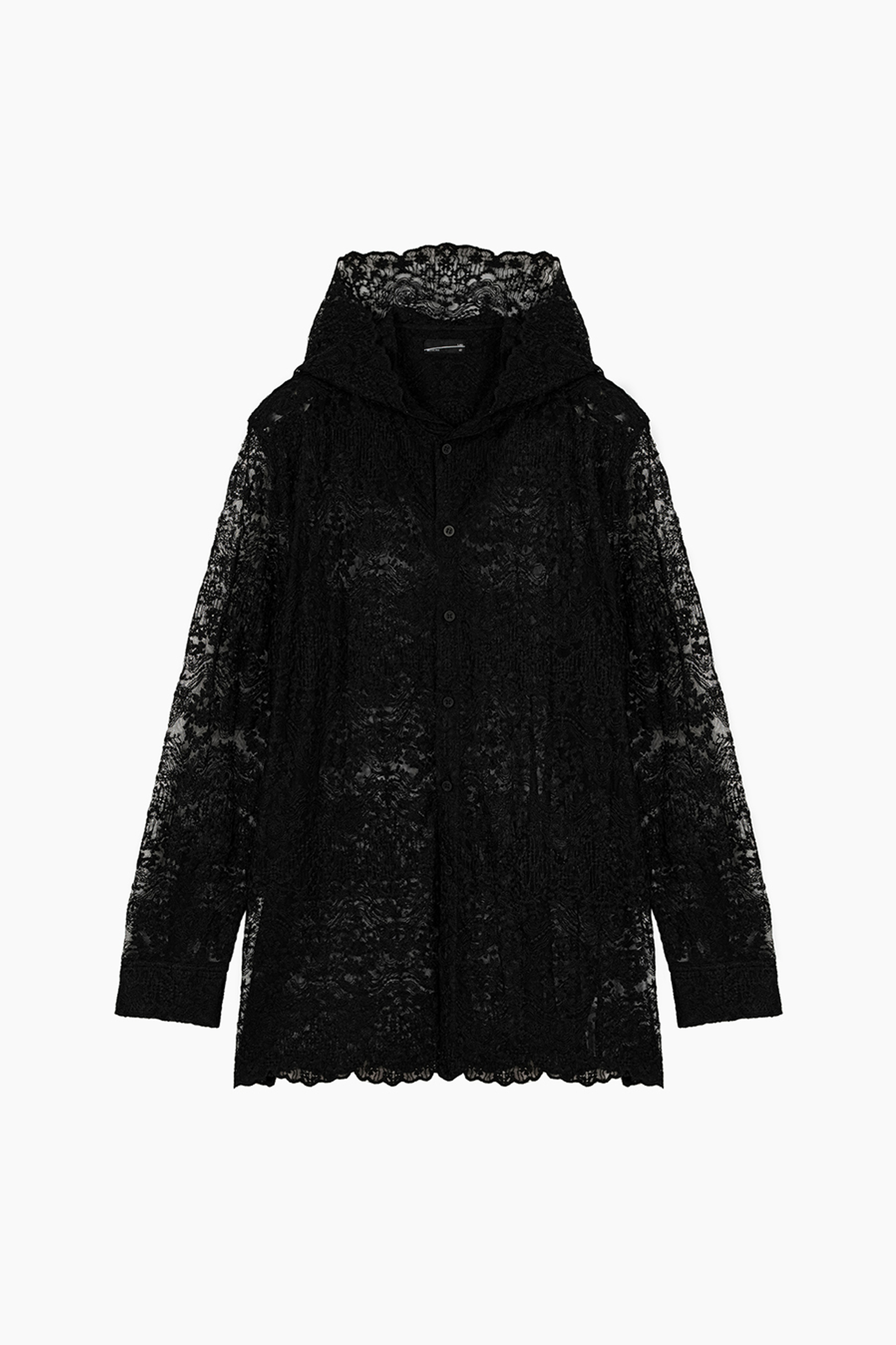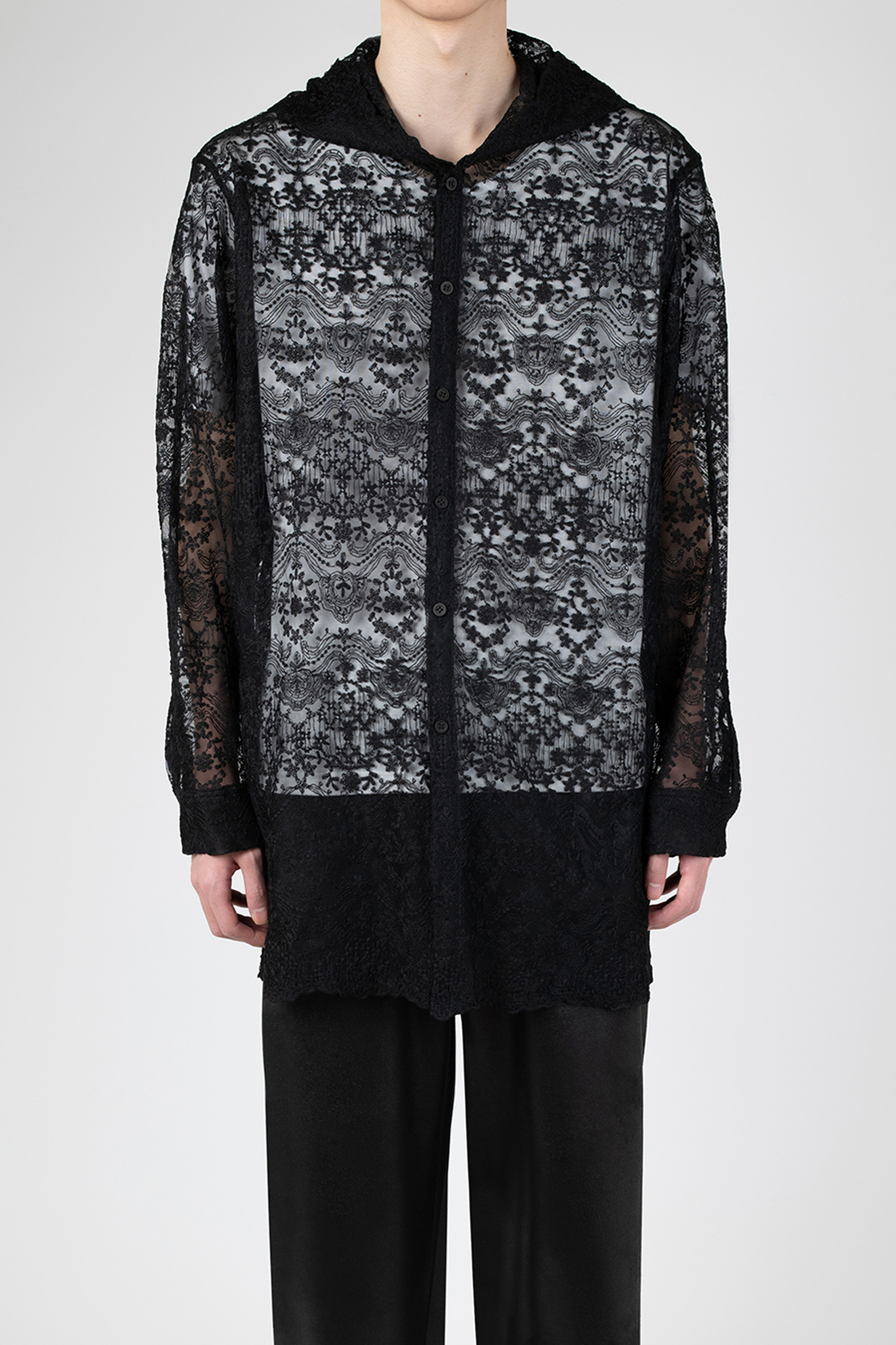 エンブロイダリーレース素材を使用したフーデットビッグシャツ。