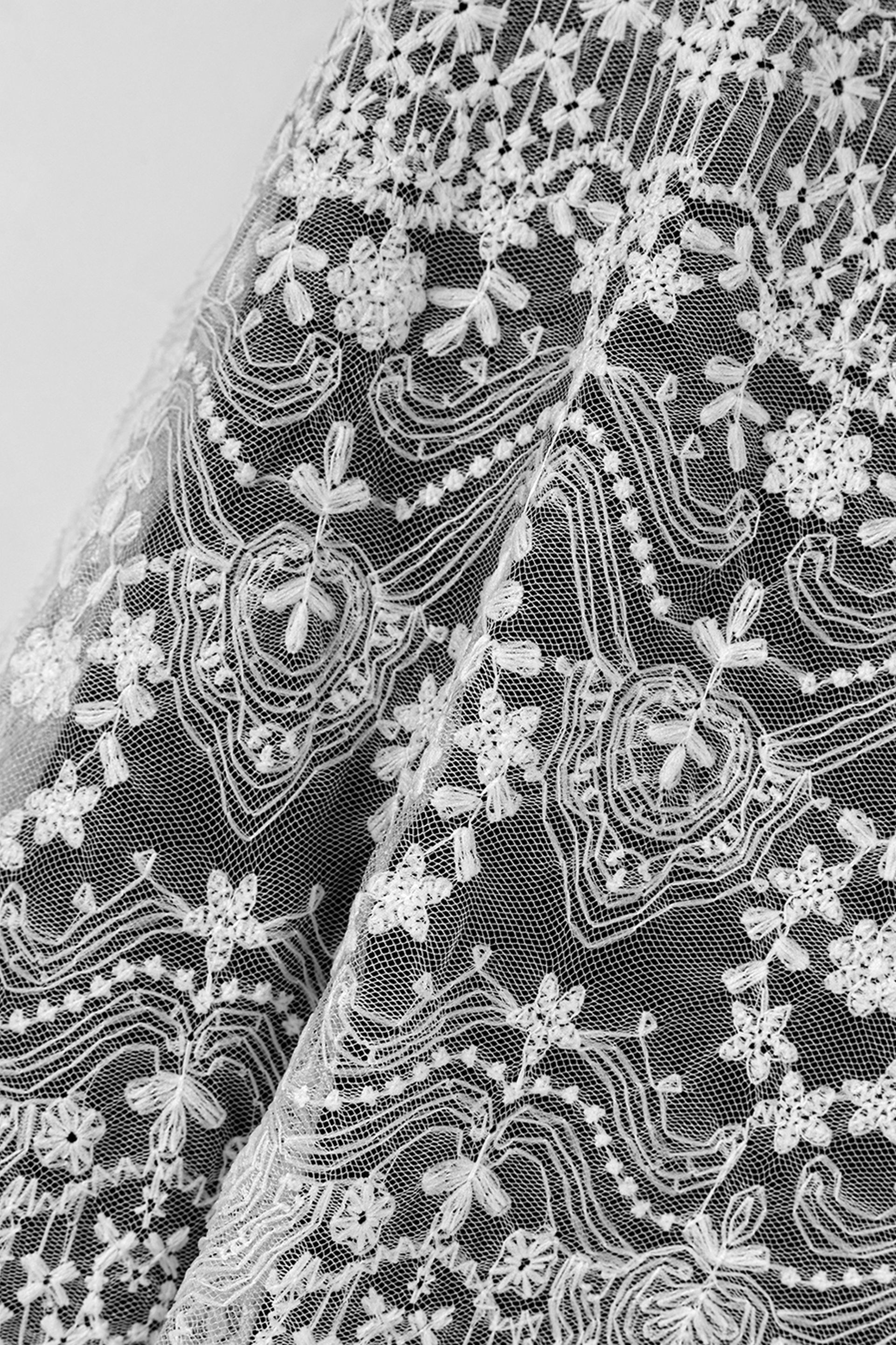 軽やかで柔らかな透け感のあるチュールに、ウーリー糸で緻密で立体的な総柄刺繍を施しています。
