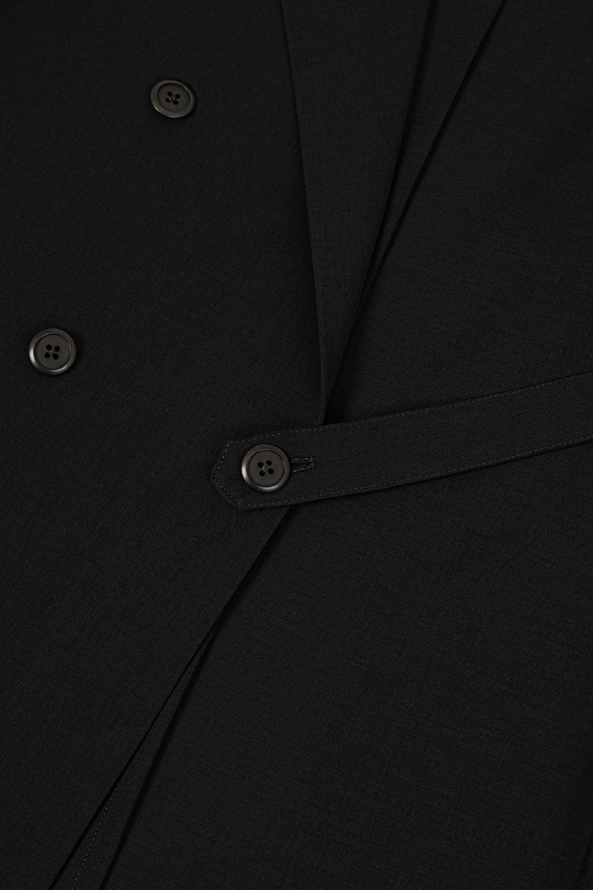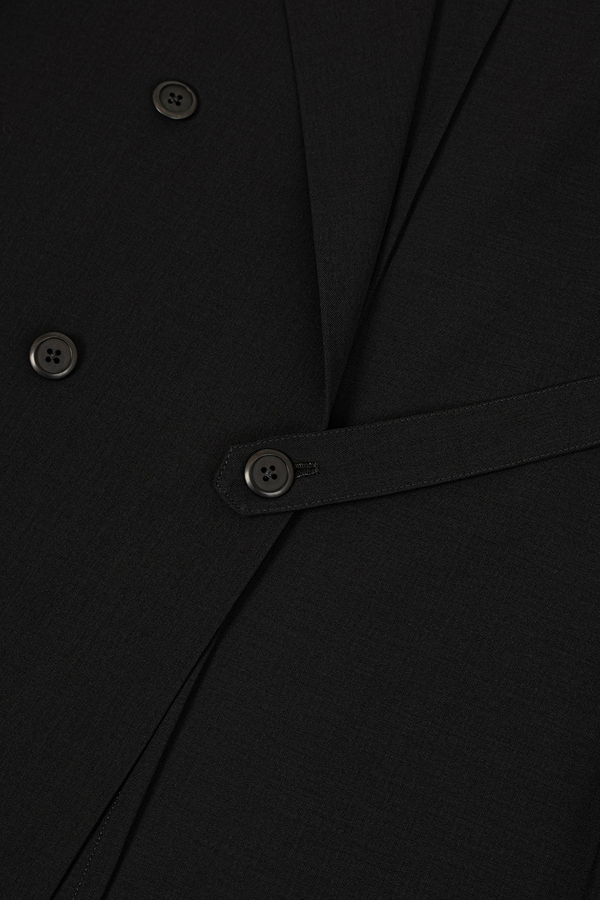 ウールライクなポリエステル素材を使用したダブルブレストジャケット。