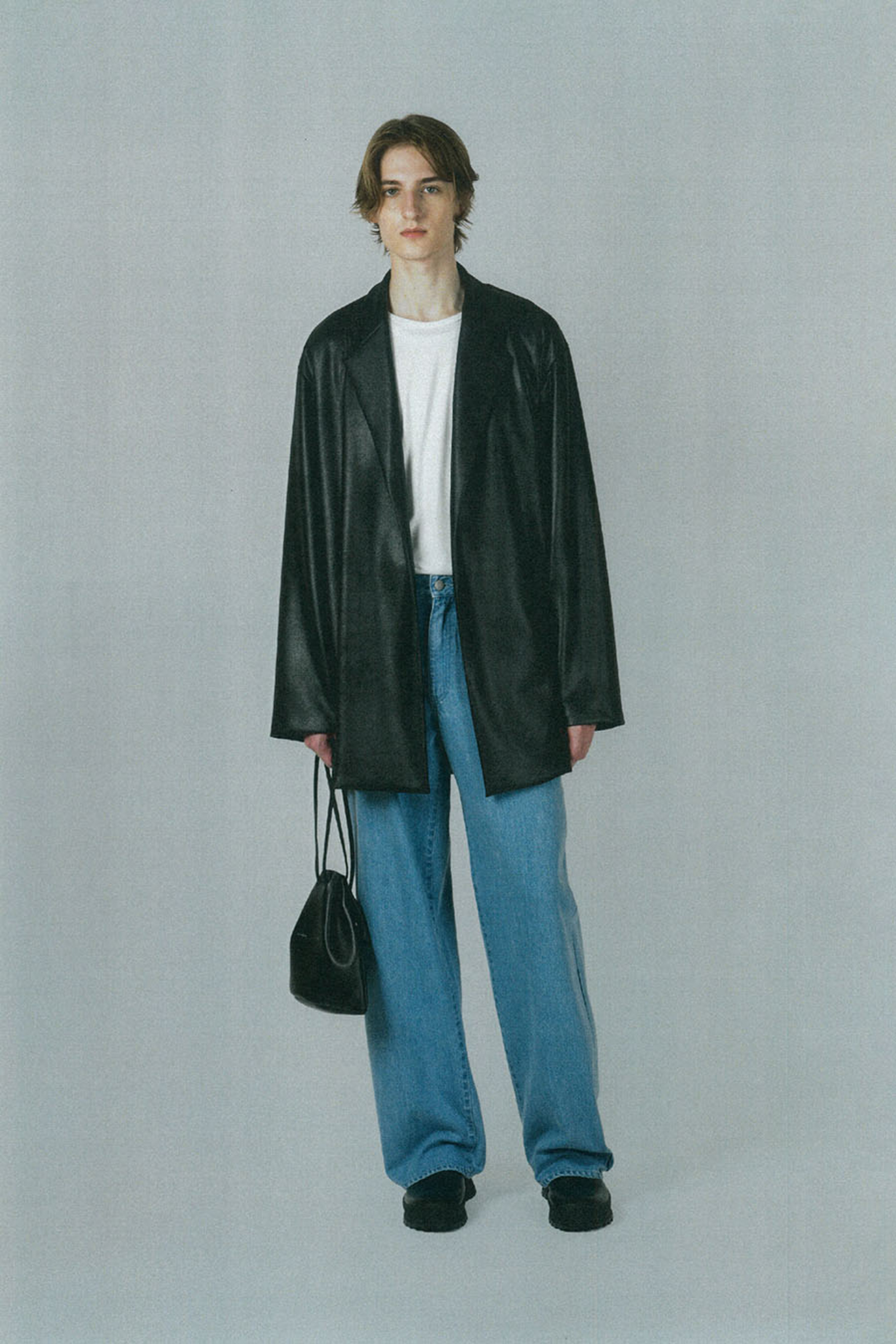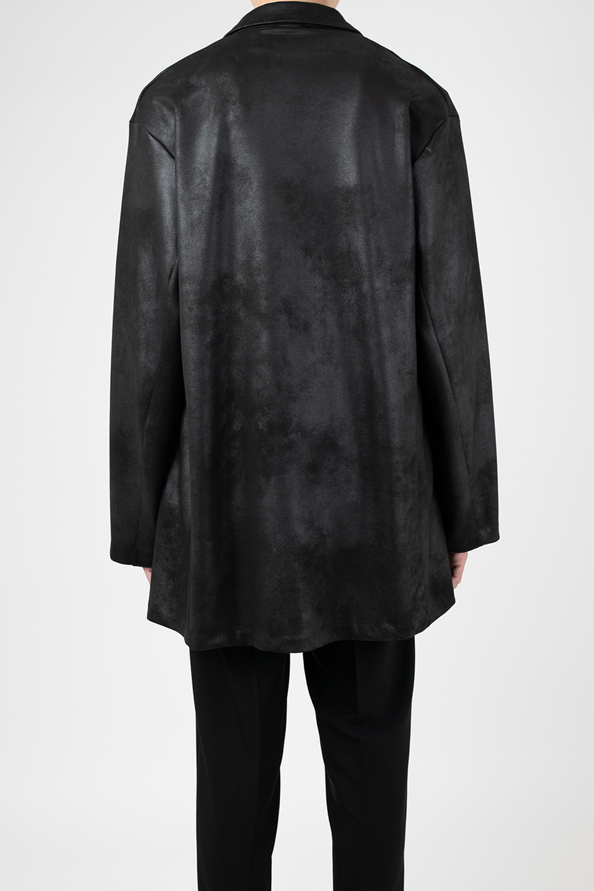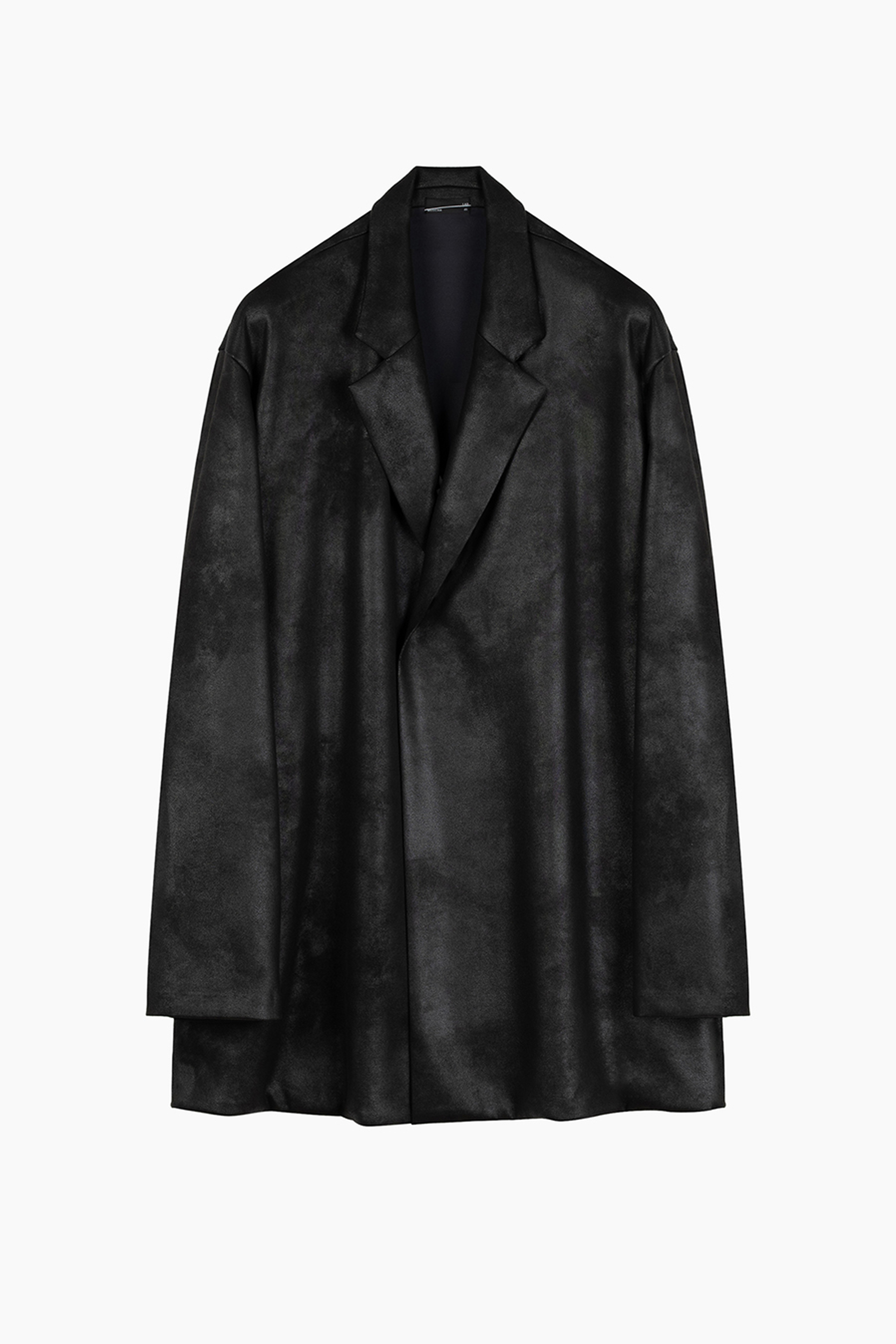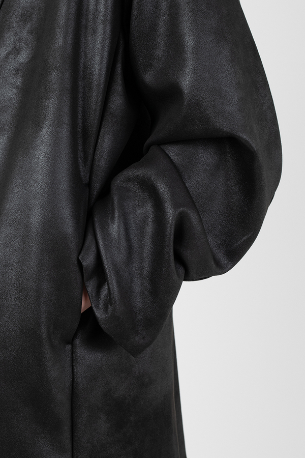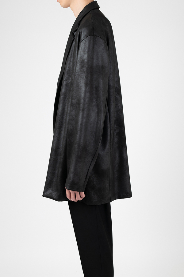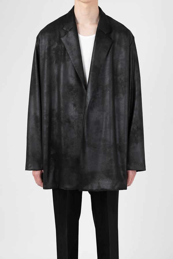レザーライクなジャージ素材を使用したガウンジャケット。