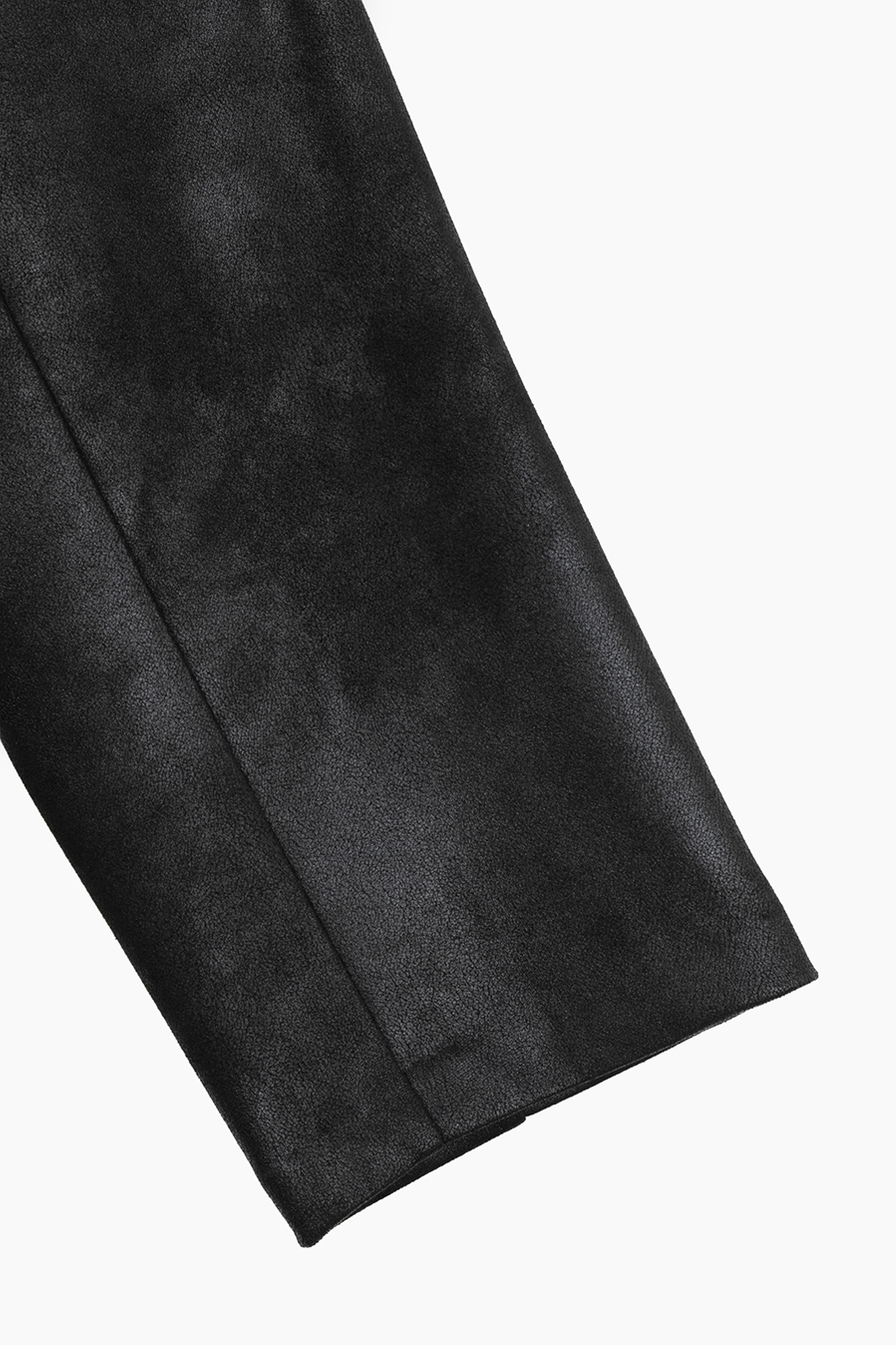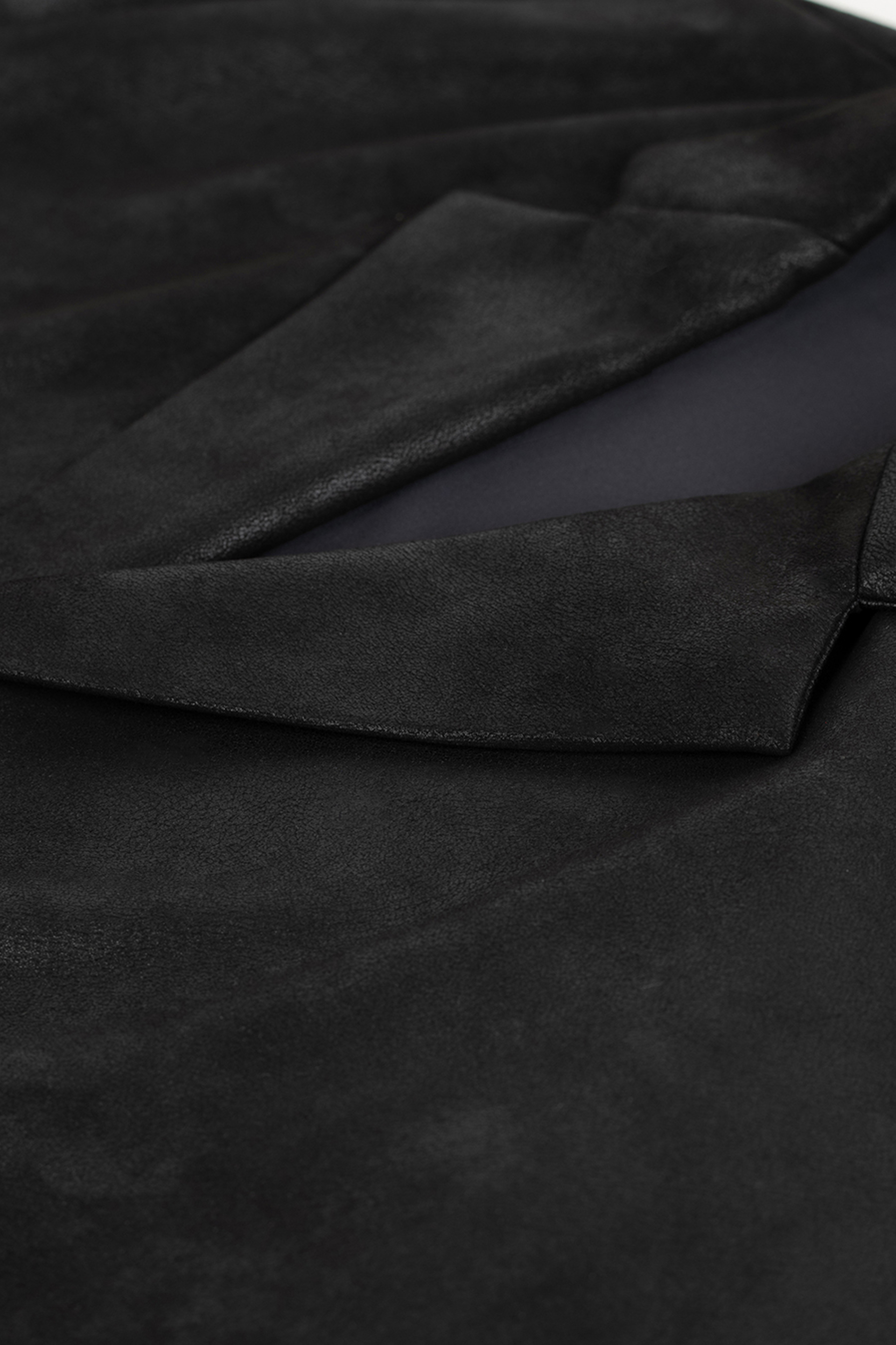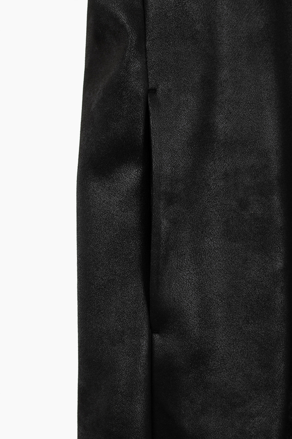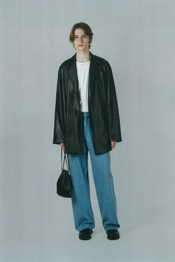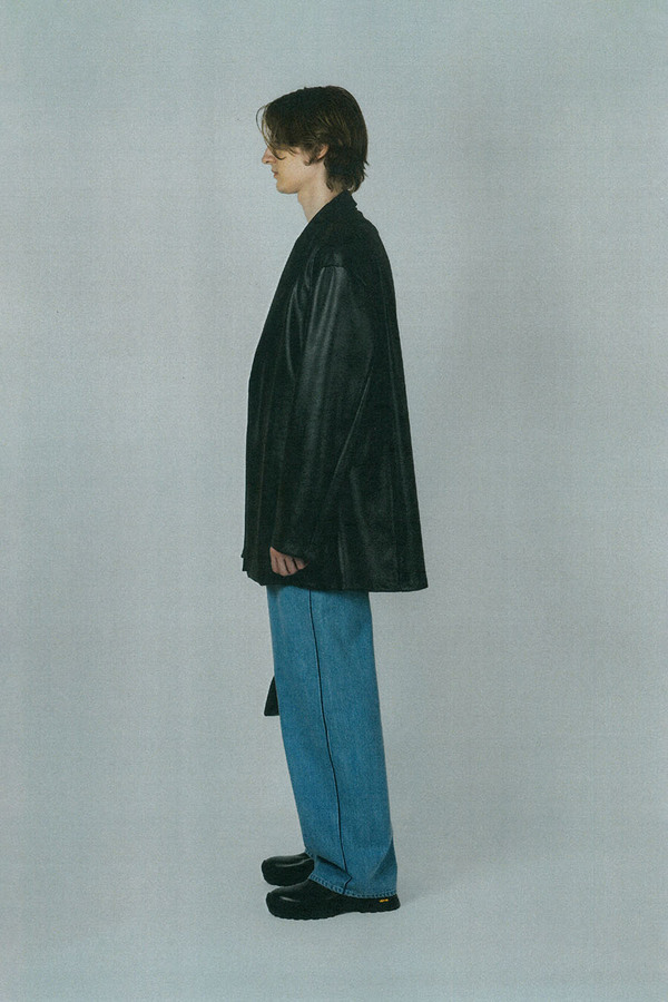 フロントのみ天竺ライナーでソフトに仕立て、素材をまとうように羽織れるガウンジャケットです。- STRETCH FAUX LEATHER JERSEY:POLYESTER 87% POLYURETHANE 13%