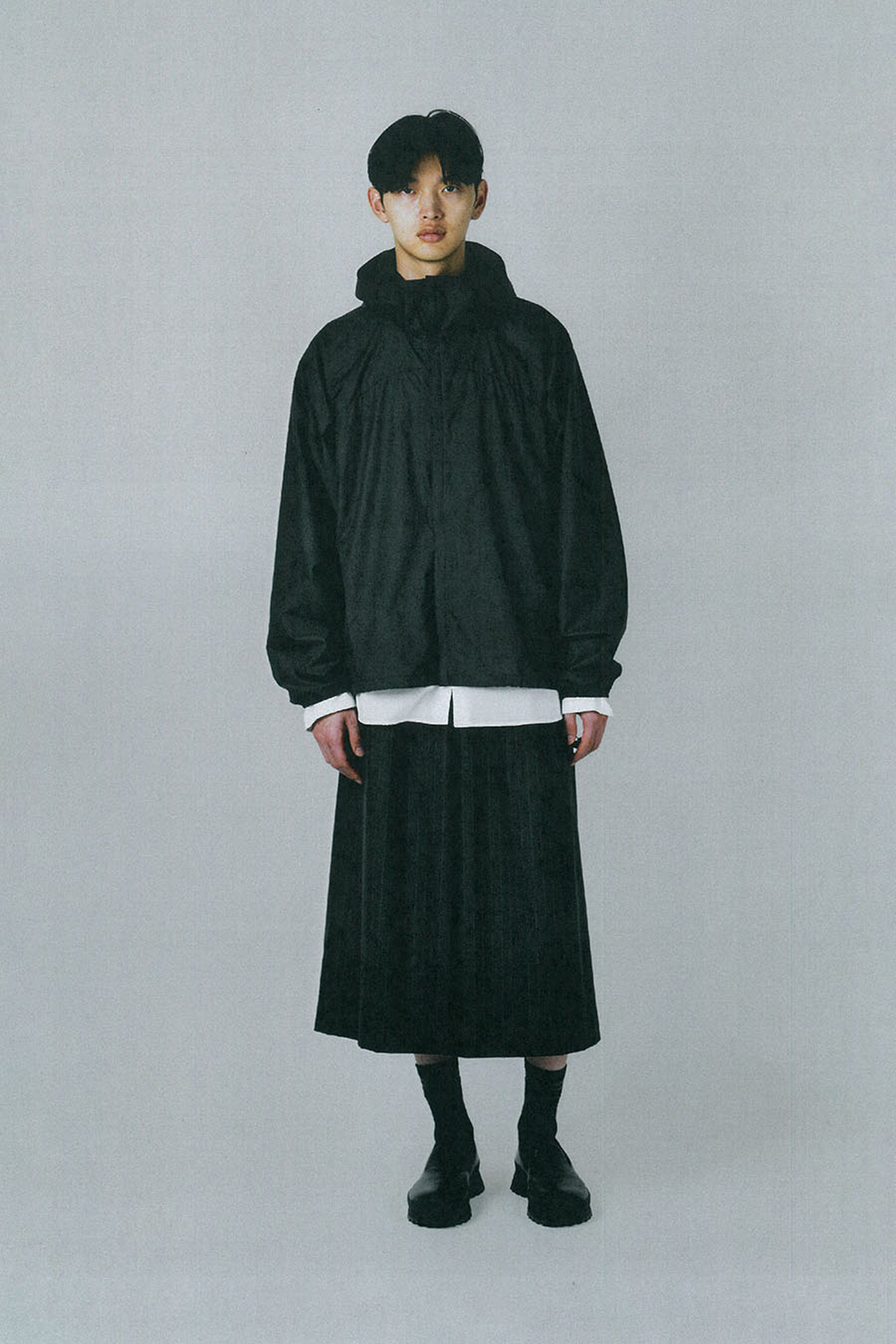前立てとフード口はオーガンジーで補強し、透明感を損なうことなくハリを持たせています。