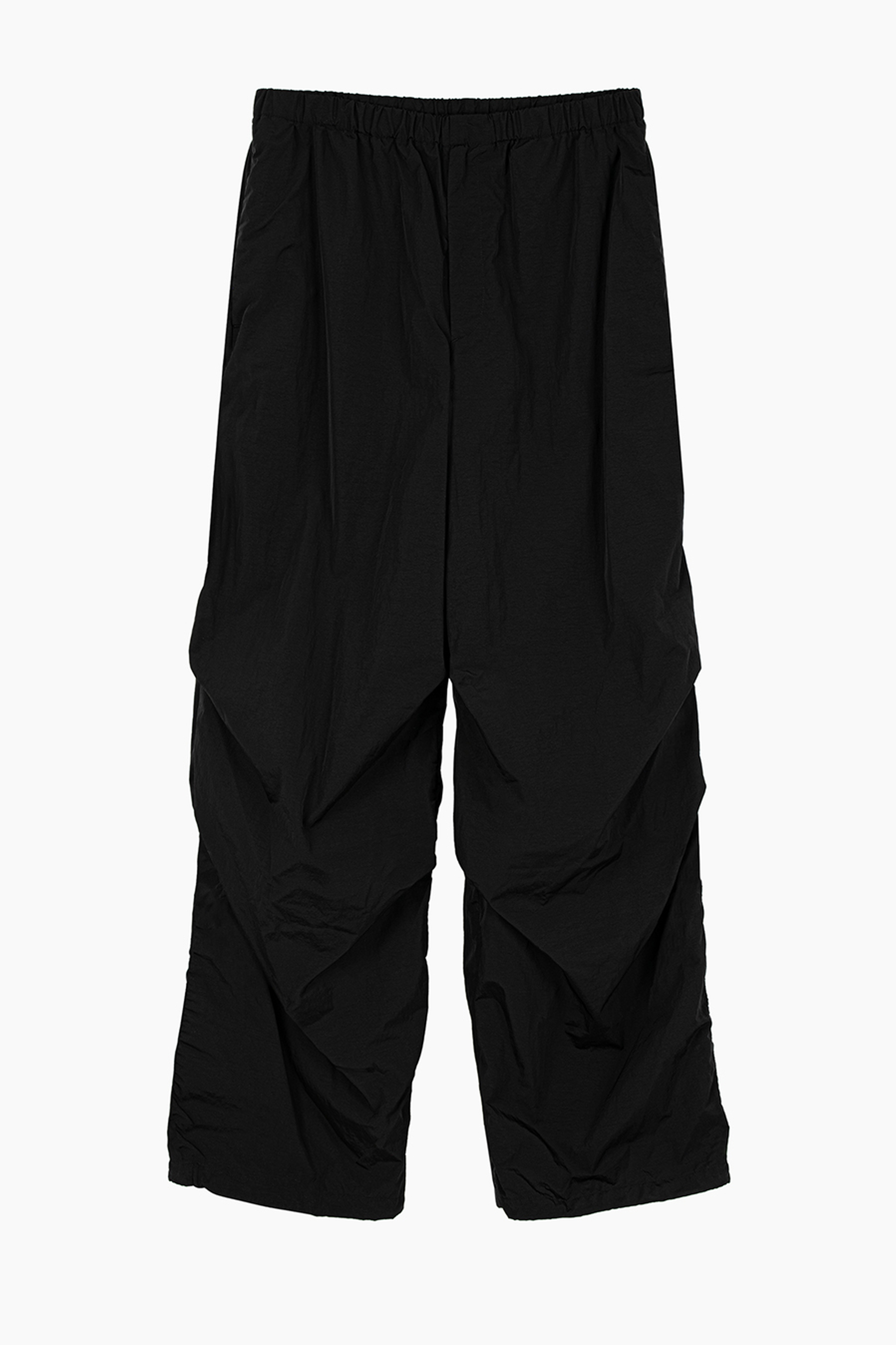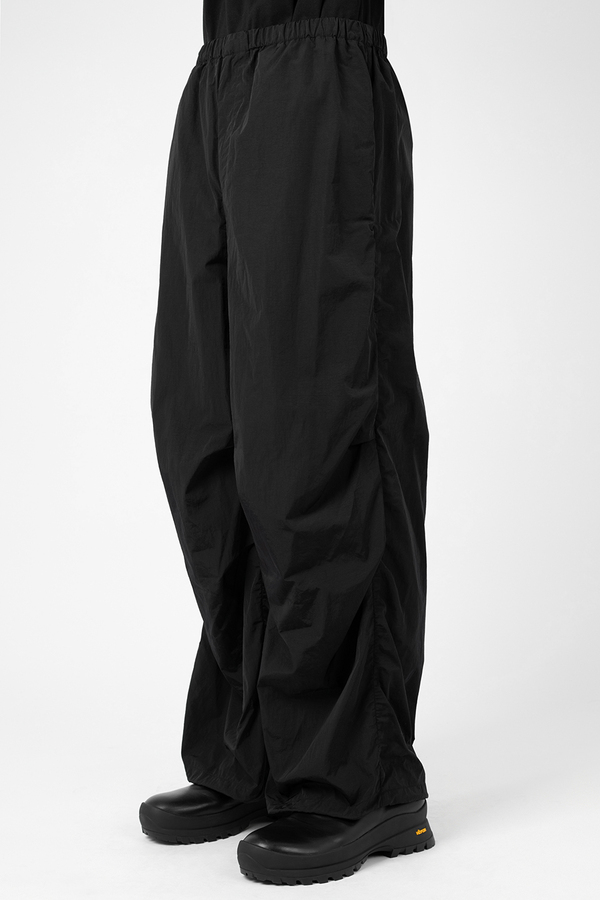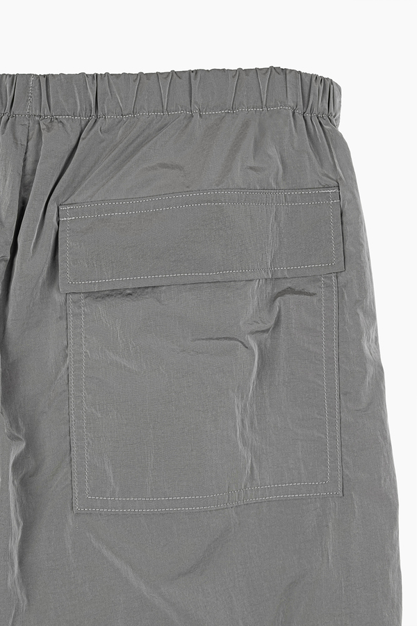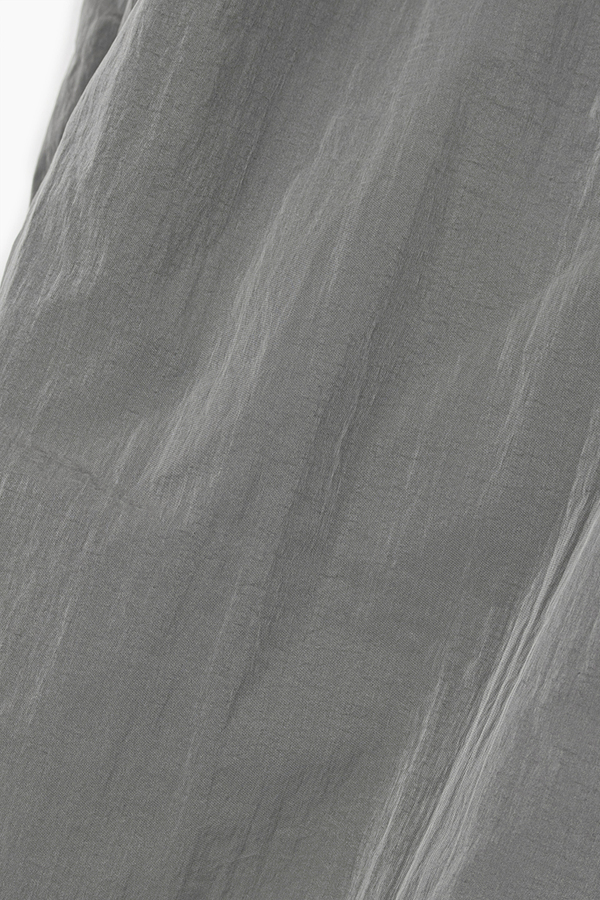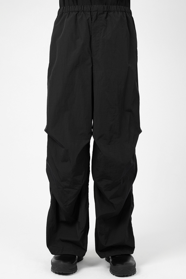 膝のタックとシームのシャーリングで立体的なボリュームを持たせたルーズフィットシルエットです。- VINTAGE NYLON CHAMBRAY:NYLON 100%