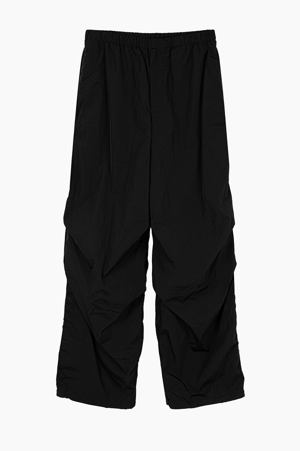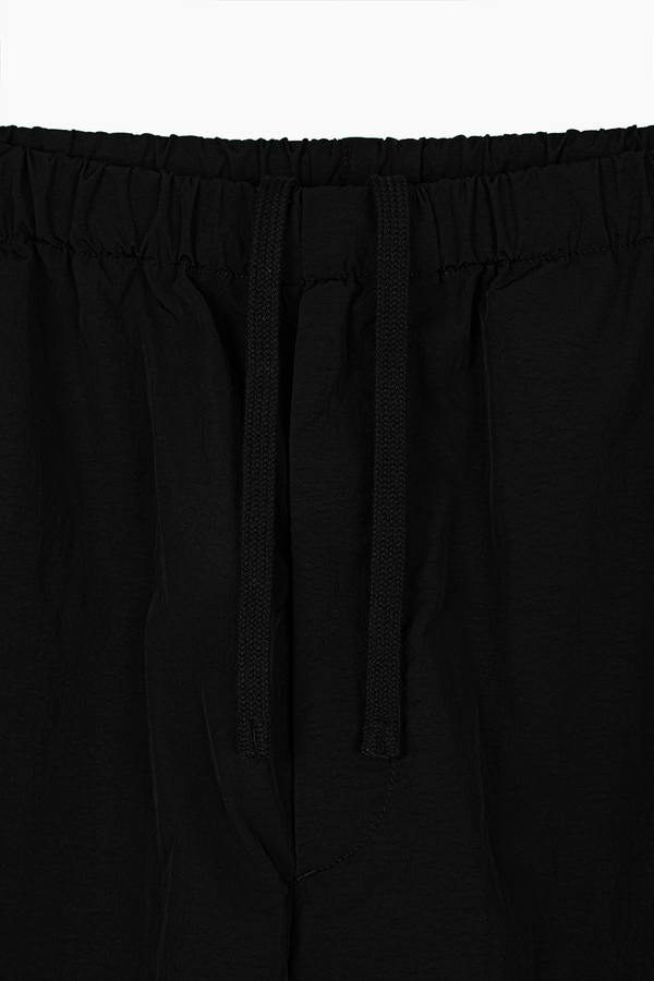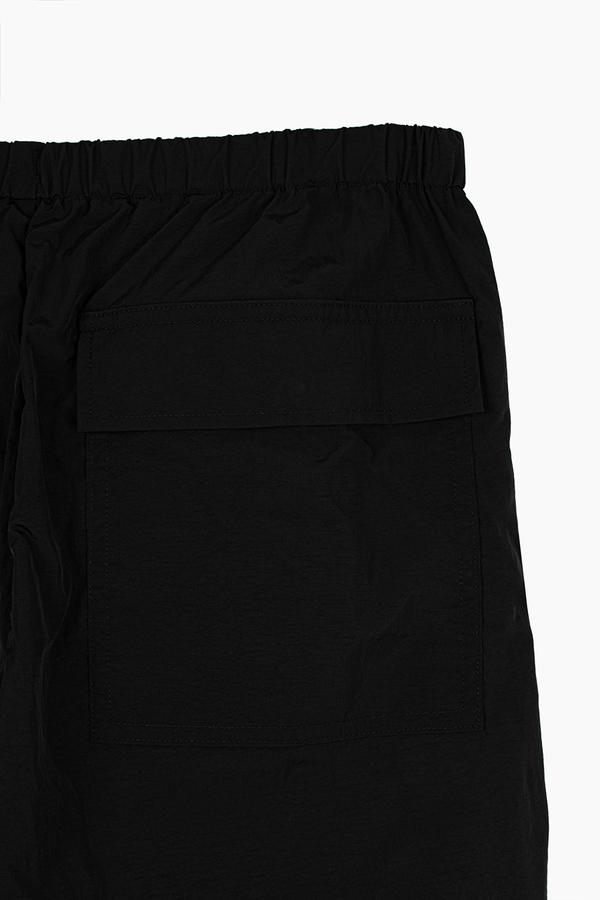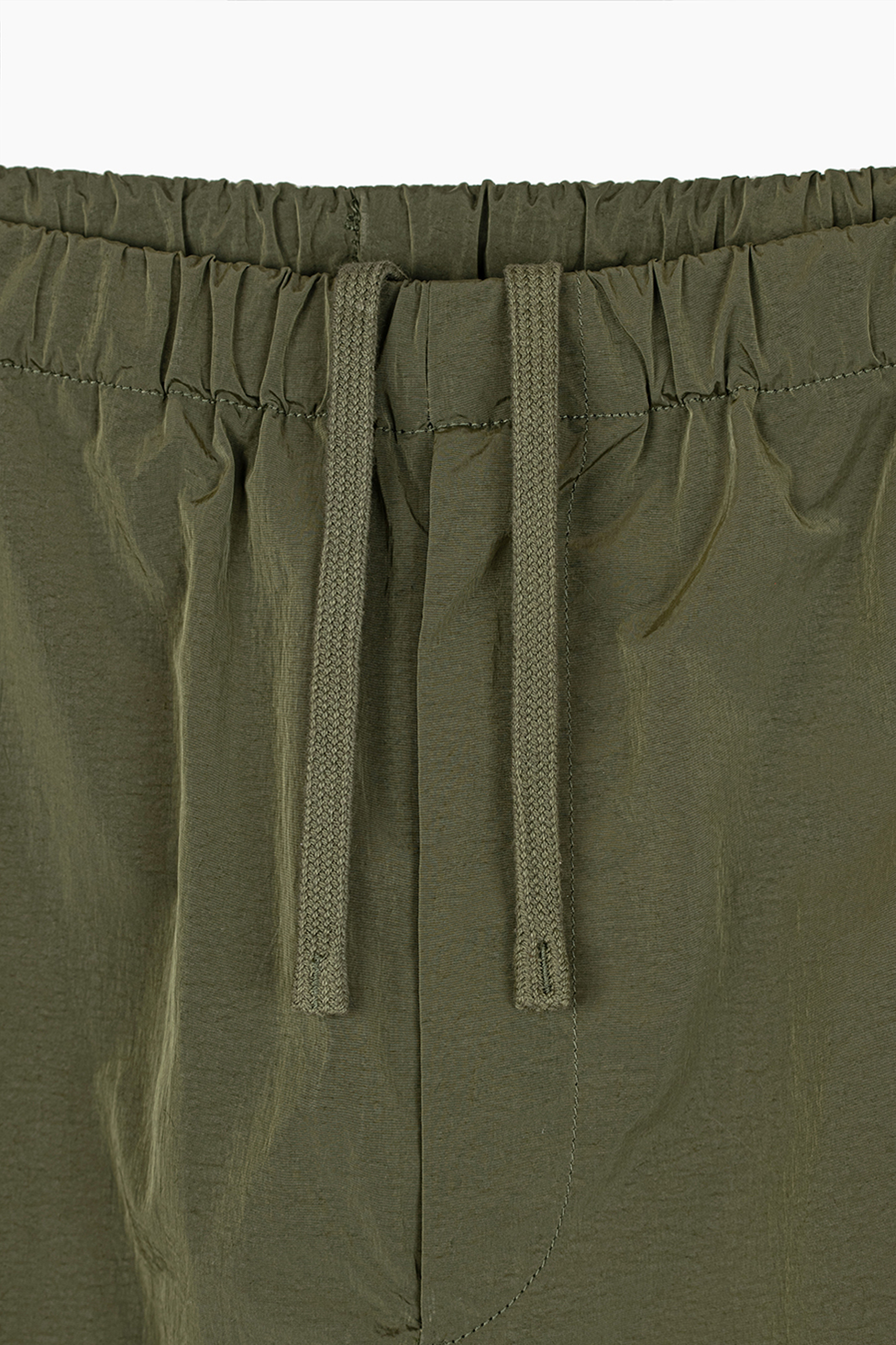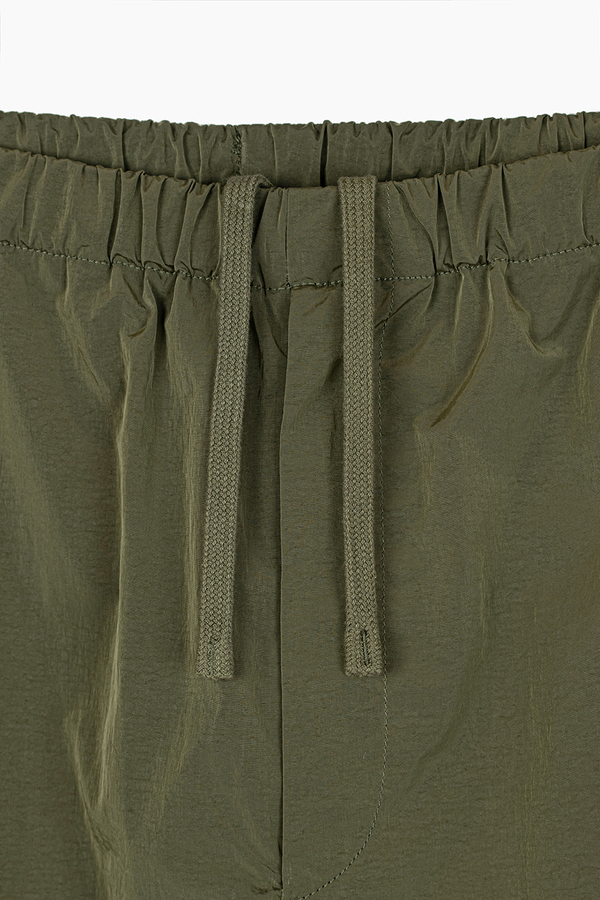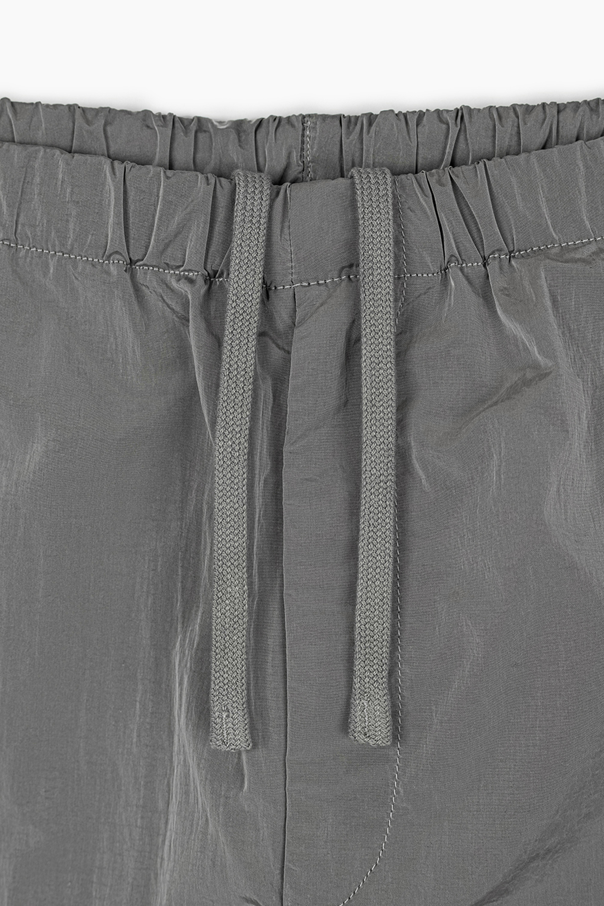 膝のタックとシームのシャーリングで立体的なボリュームを持たせたルーズフィットシルエットです。- VINTAGE NYLON CHAMBRAY:NYLON 100%