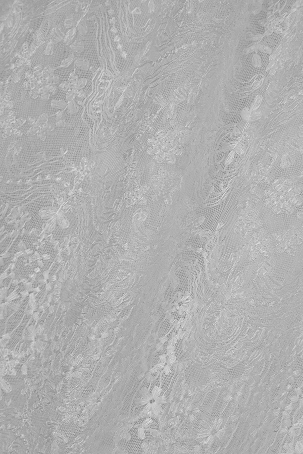 軽やかで柔らかい透け感のあるチュールに、ウーリー糸で緻密で立体的な総柄刺繍を施しています。