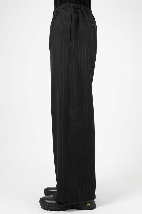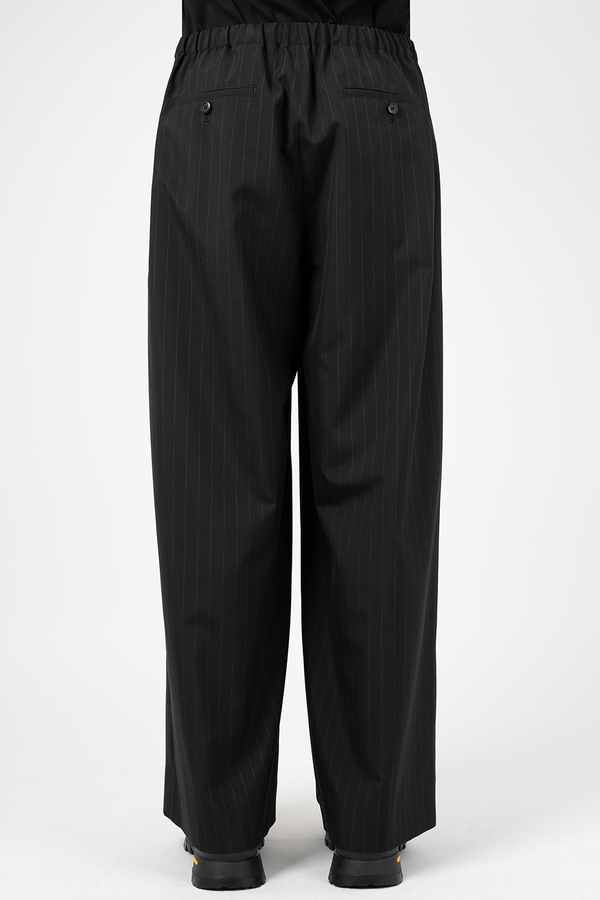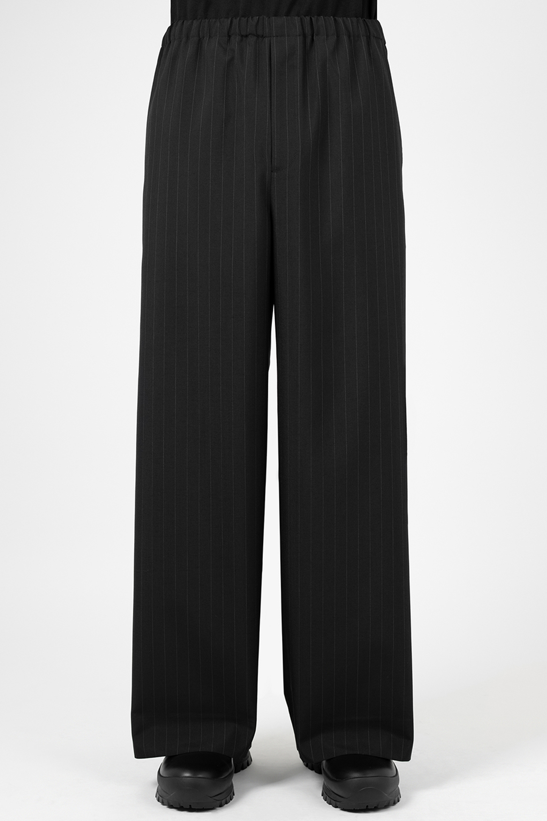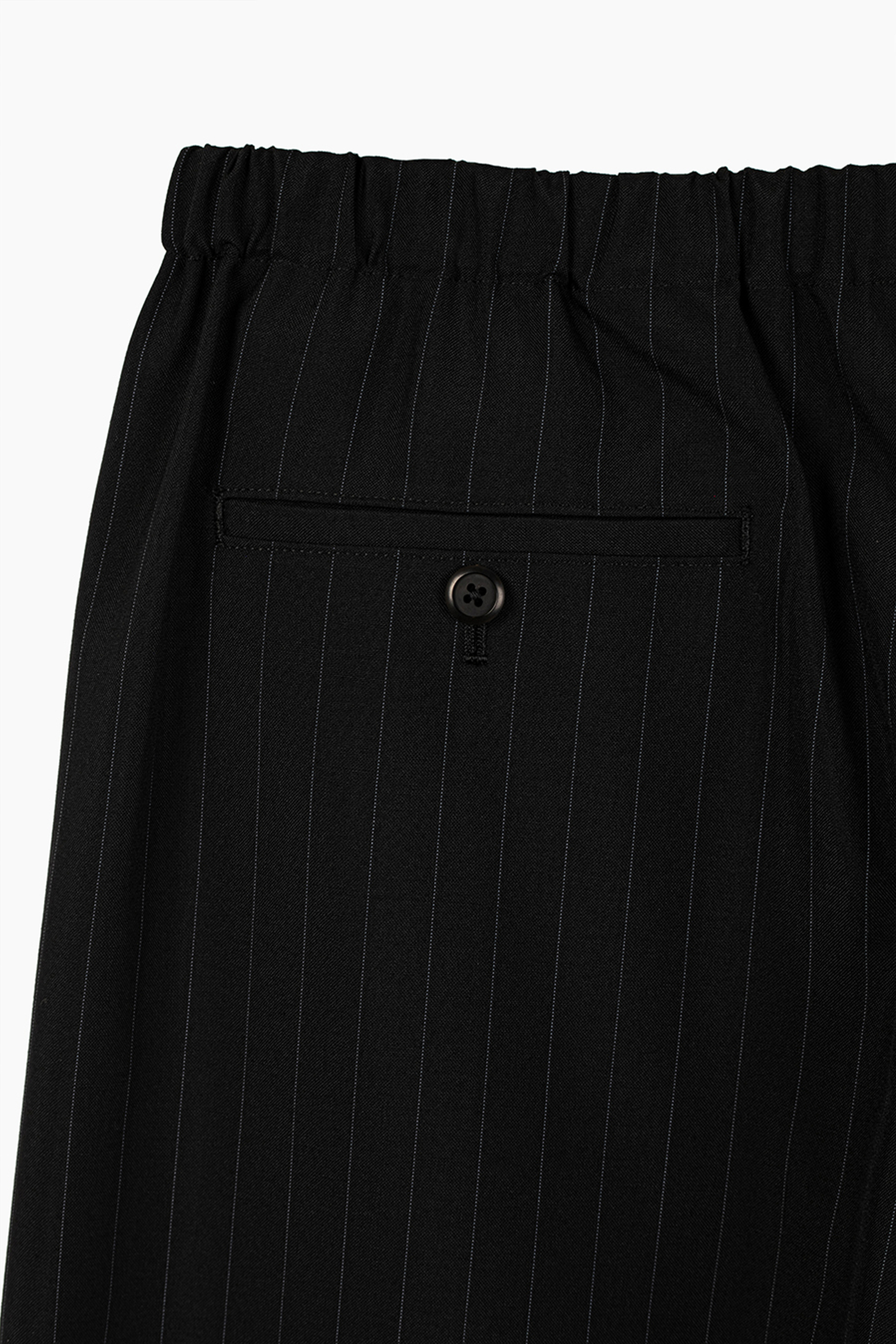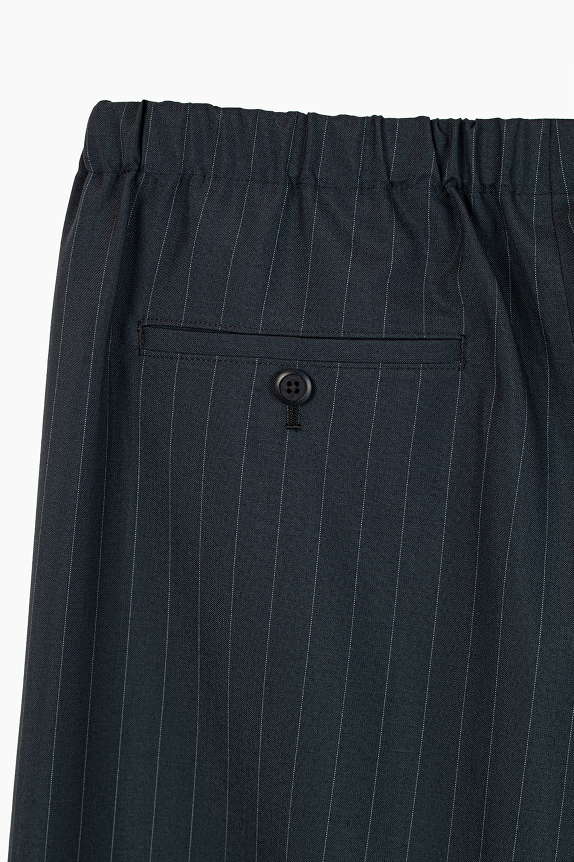 ミニマルなディテールで素材の特徴を活かした、ゆとりのあるルーズフィットパンツです。- T/W POPLIN PINSTRIPE:POLYESTER 85% WOOL 15%