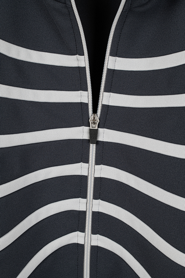 フロントのスケルトン柄と袖のラインは、共地配色のパーツを縫い合わせて、立体的に表現しています。