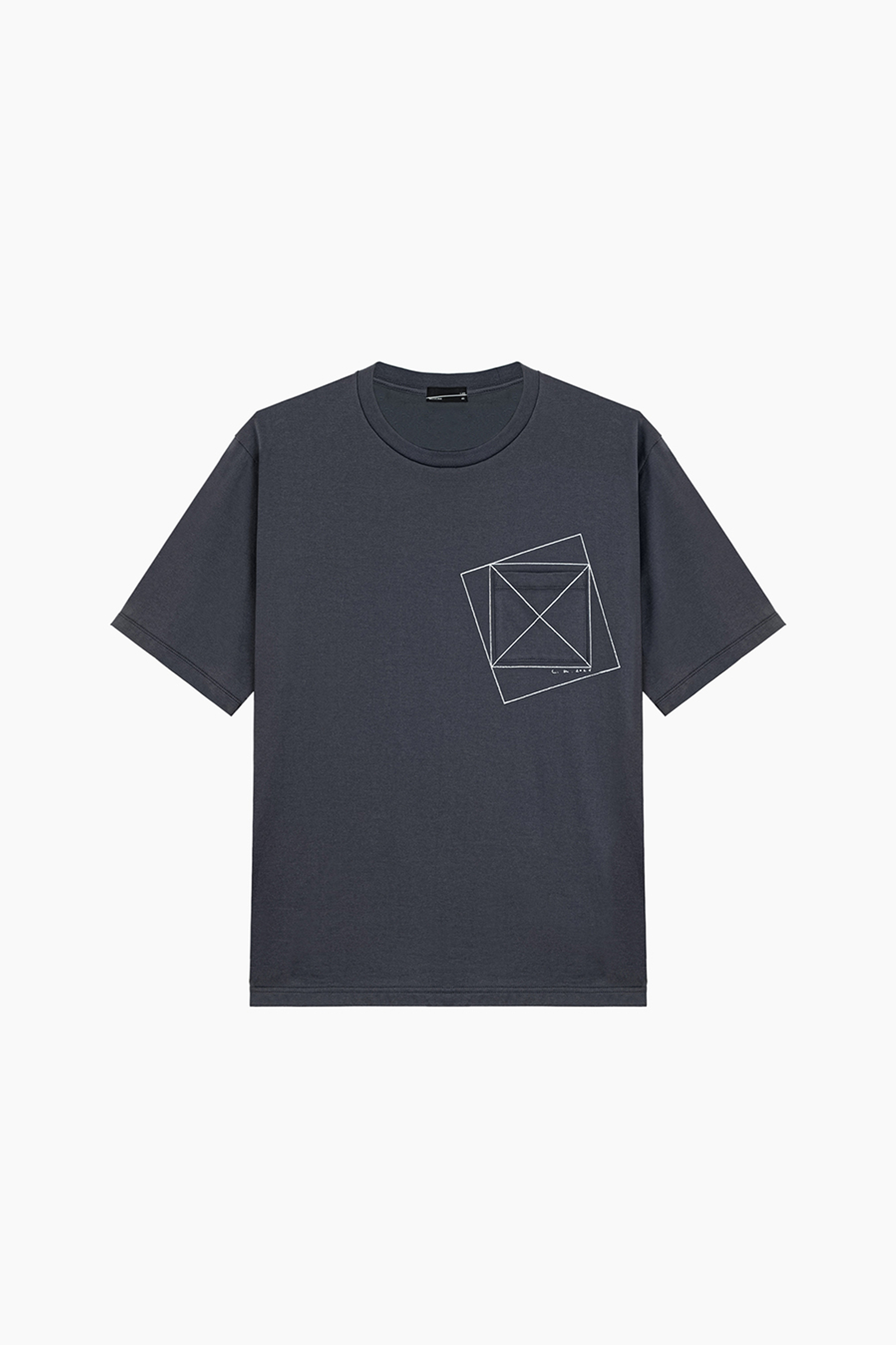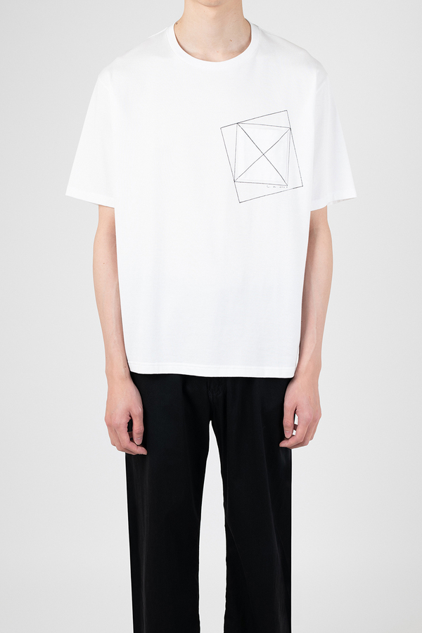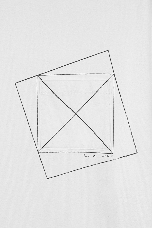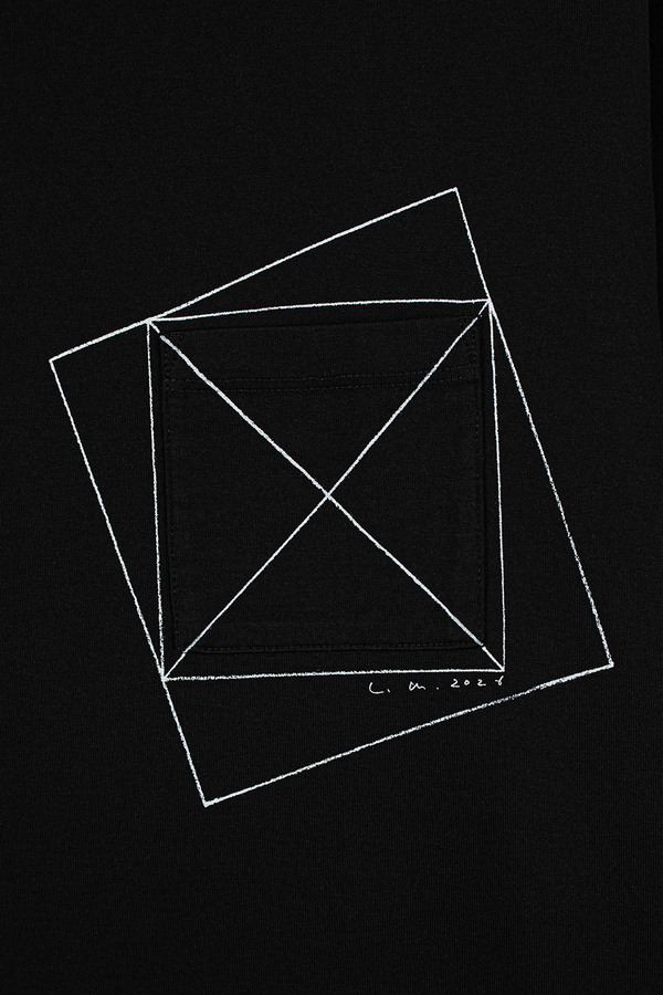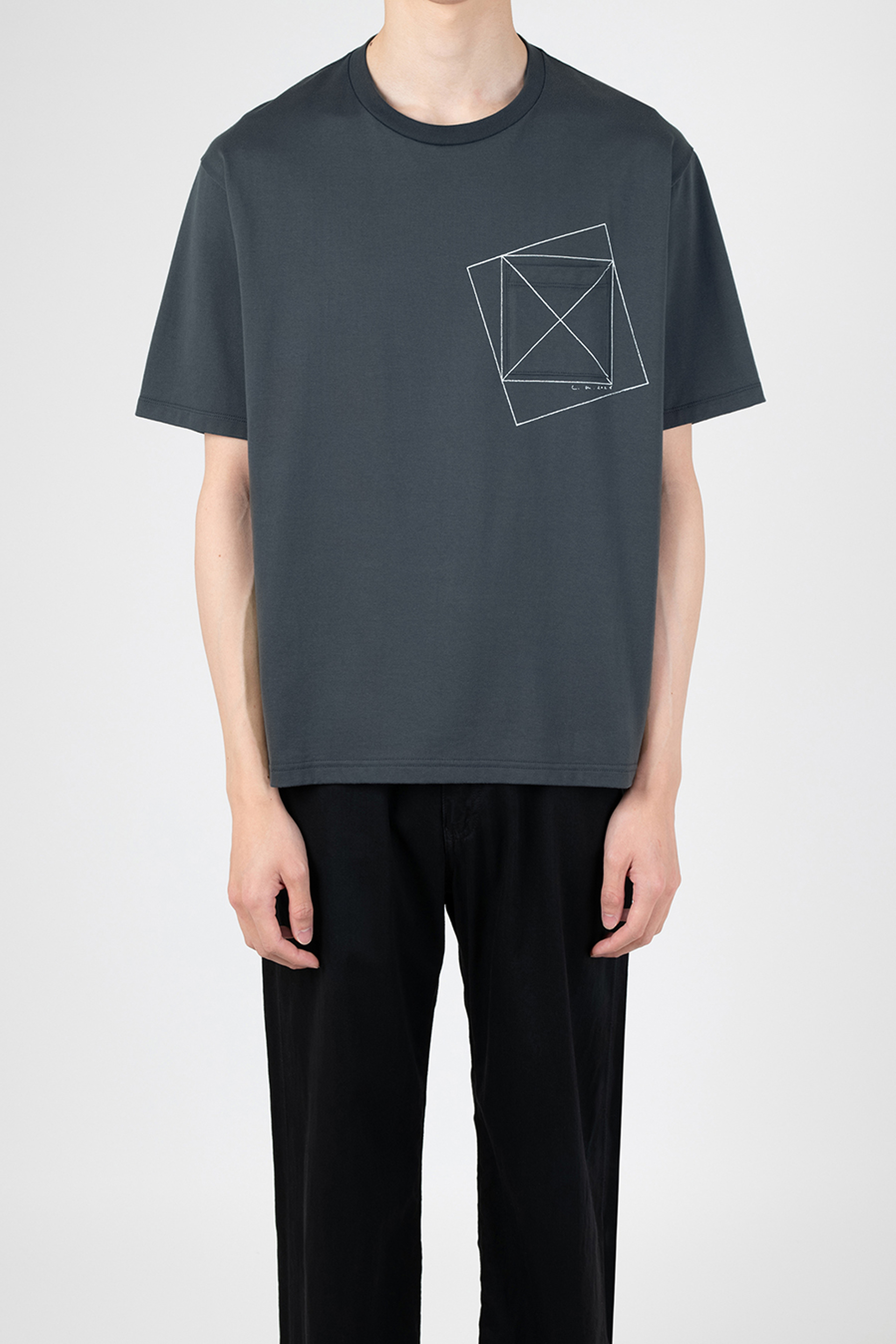 左胸には、グラフィックプリントとパッチポケットを重ねて配置。