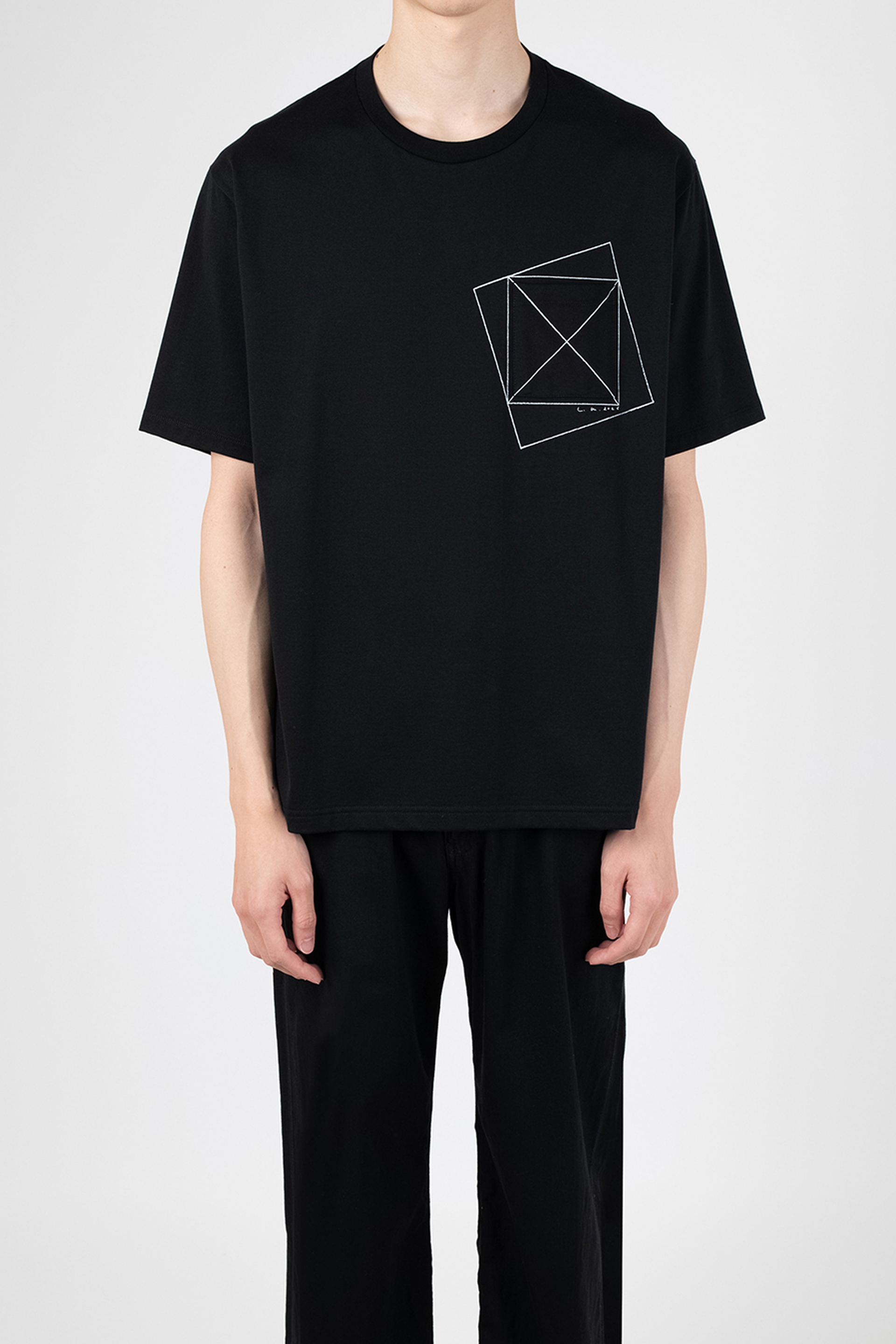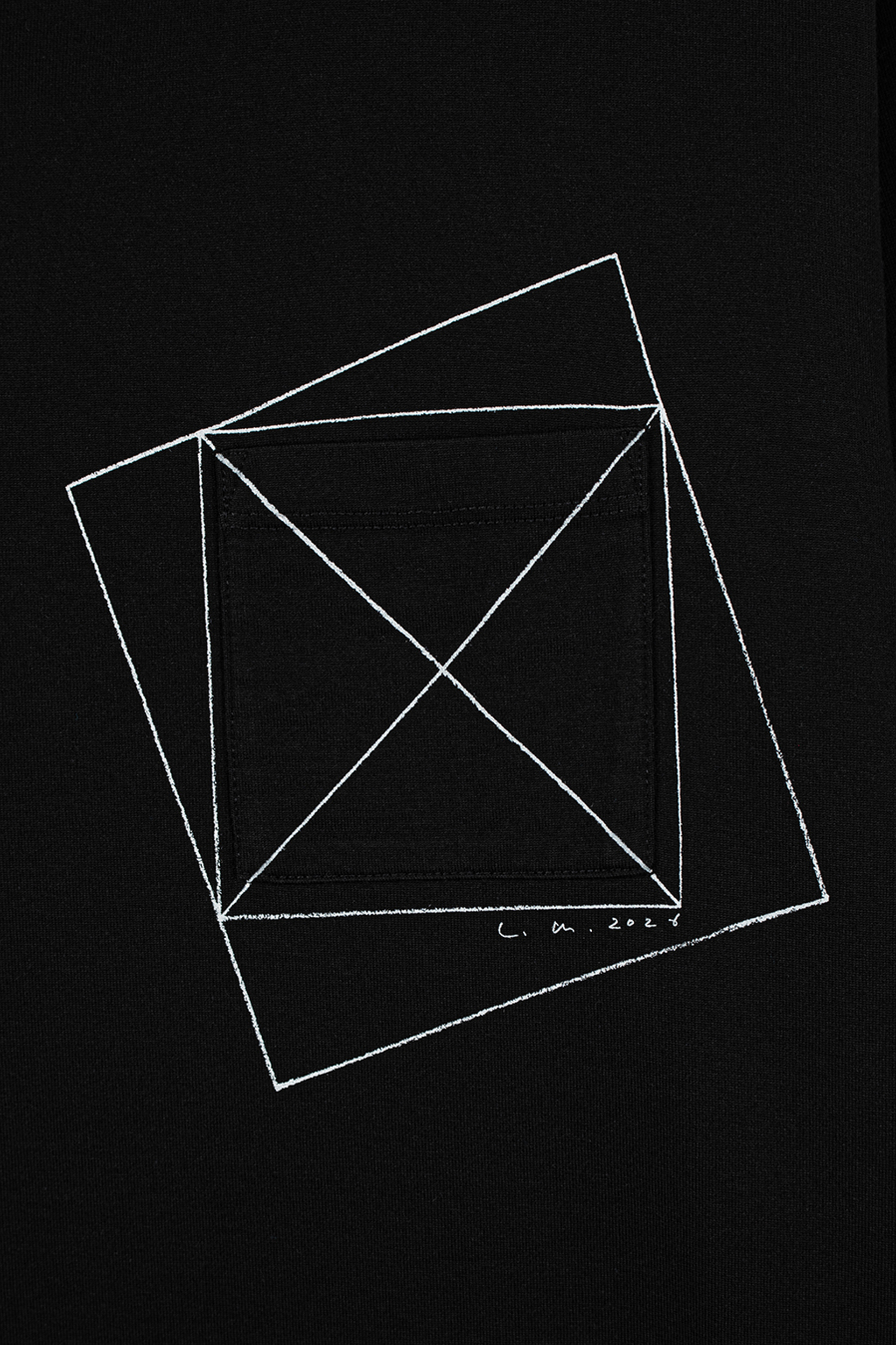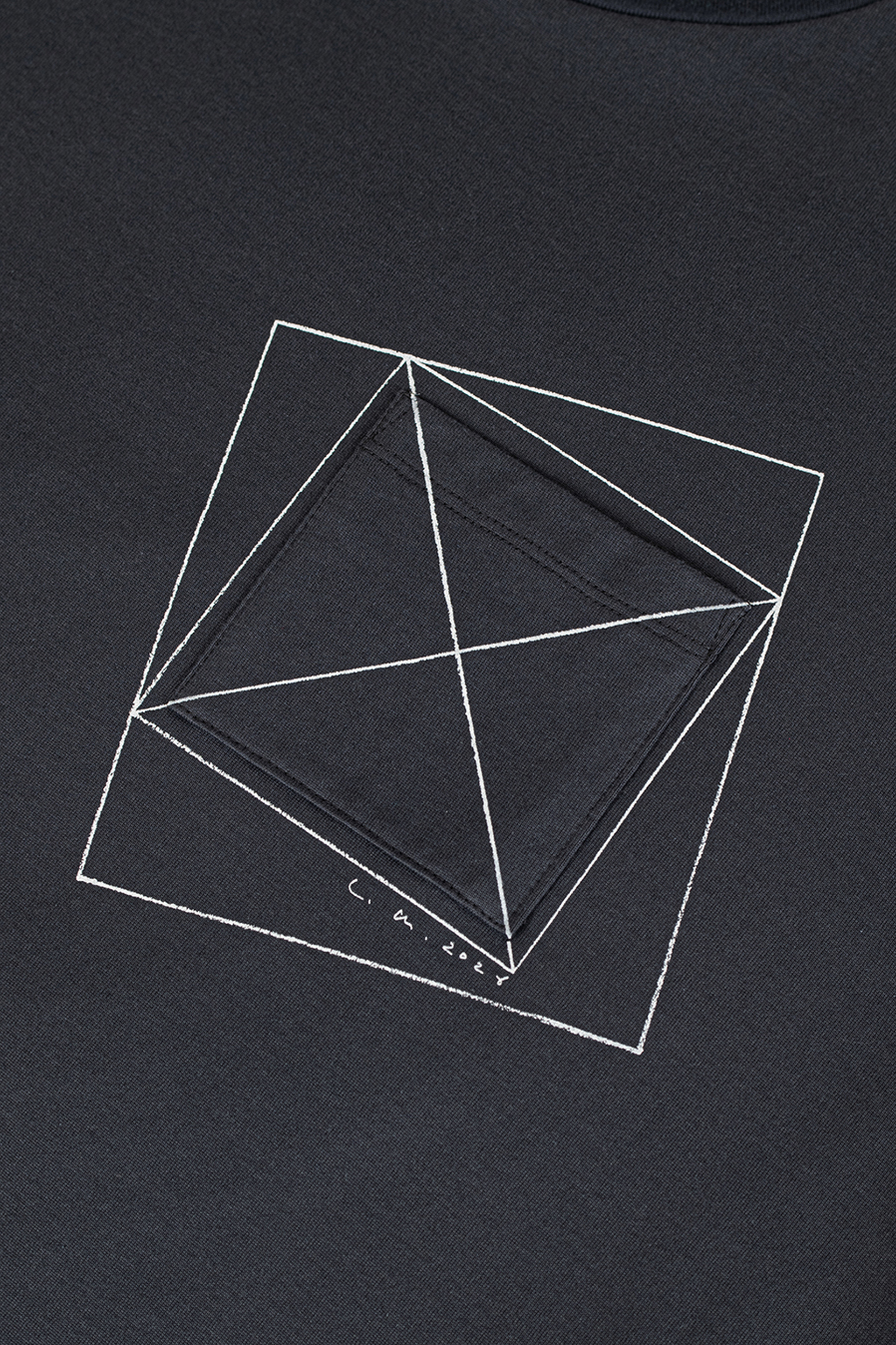 左胸には、グラフィックプリントとパッチポケットを重ねて配置。