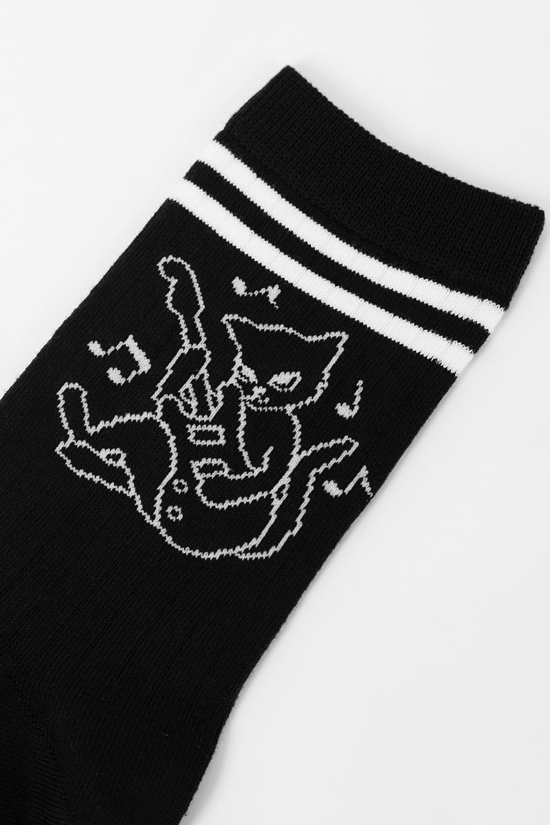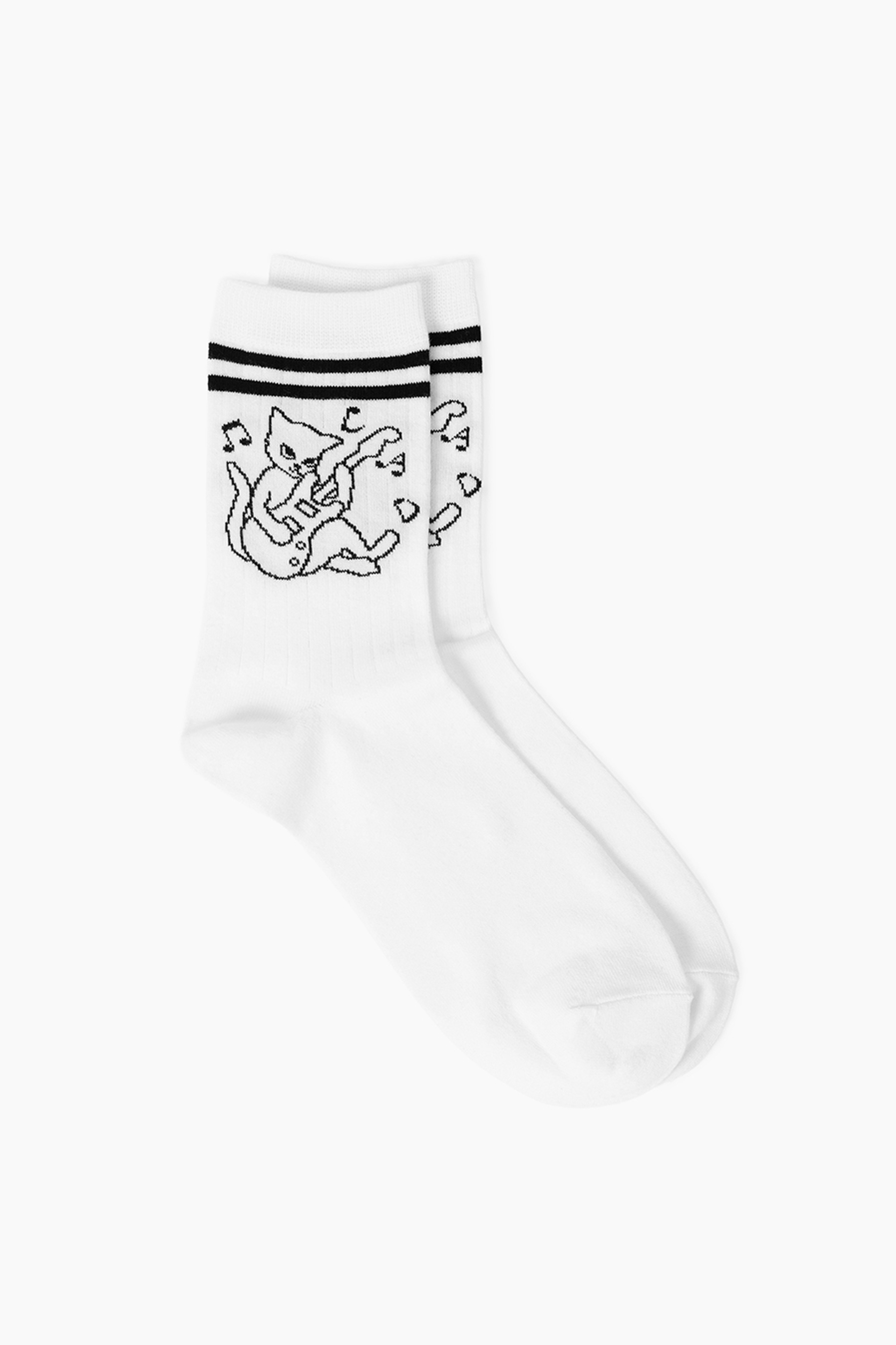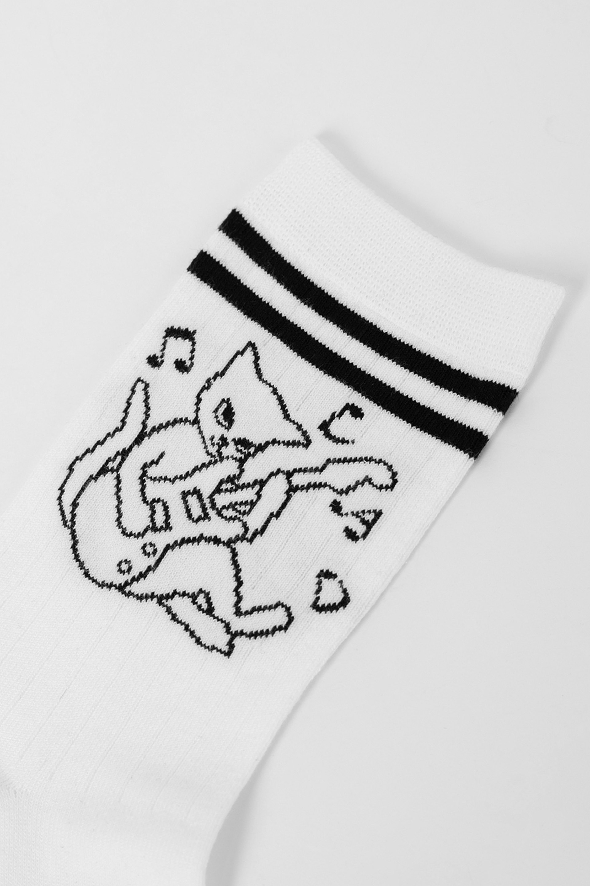 ギターを弾く猫のモチーフをジャガードで繊細に表現しています。
