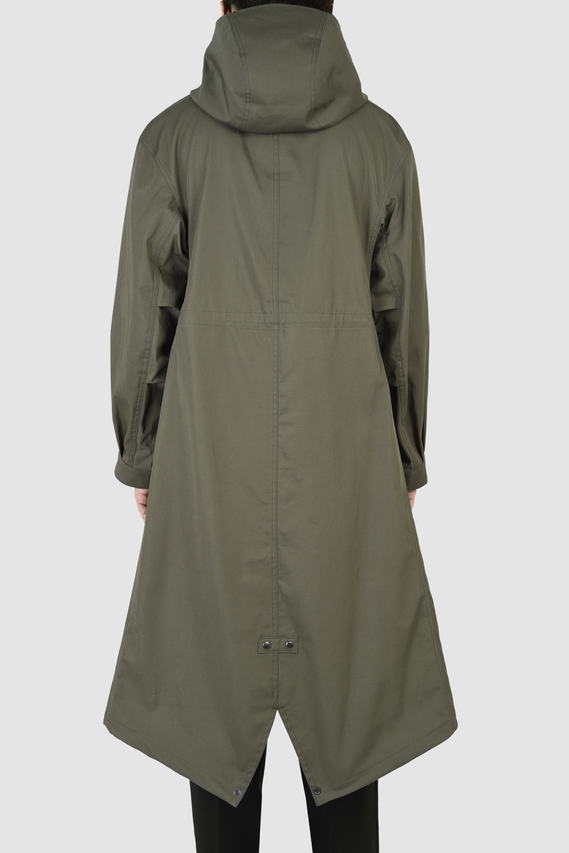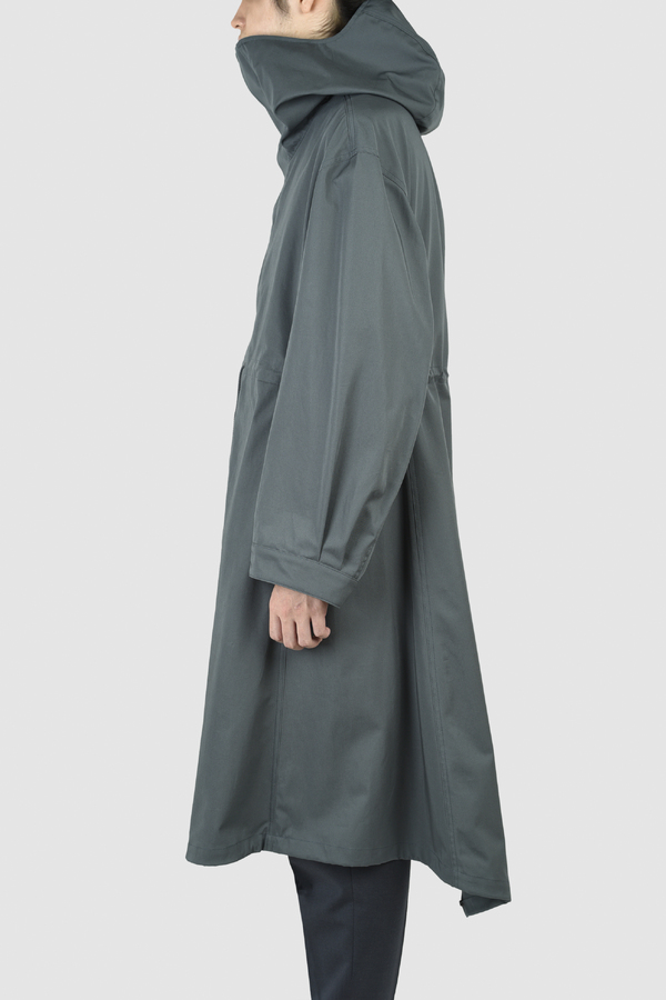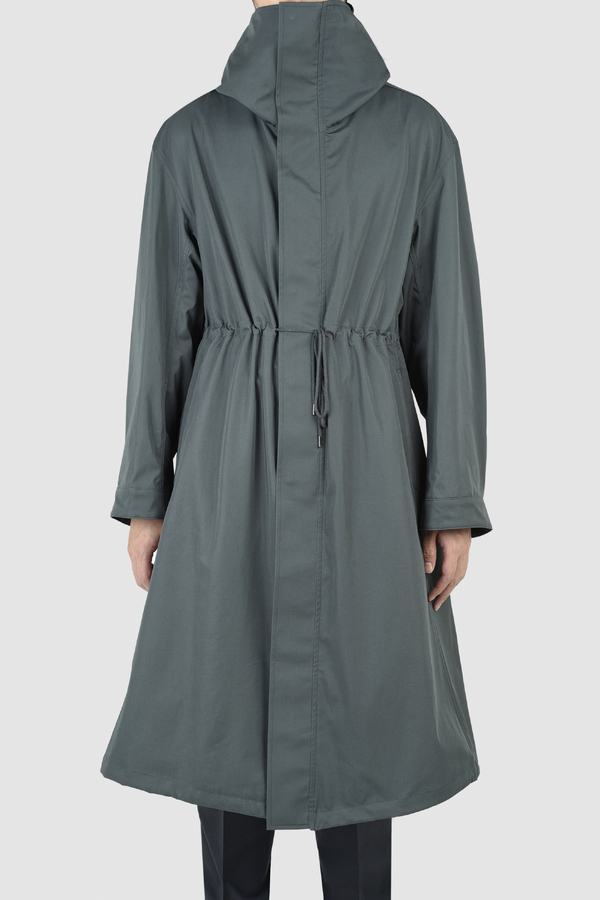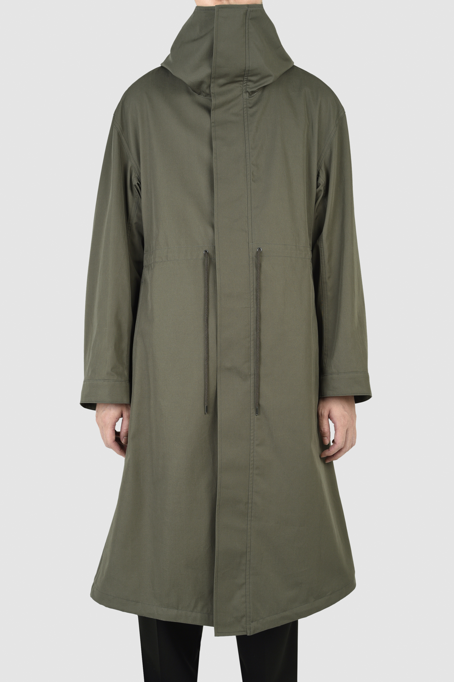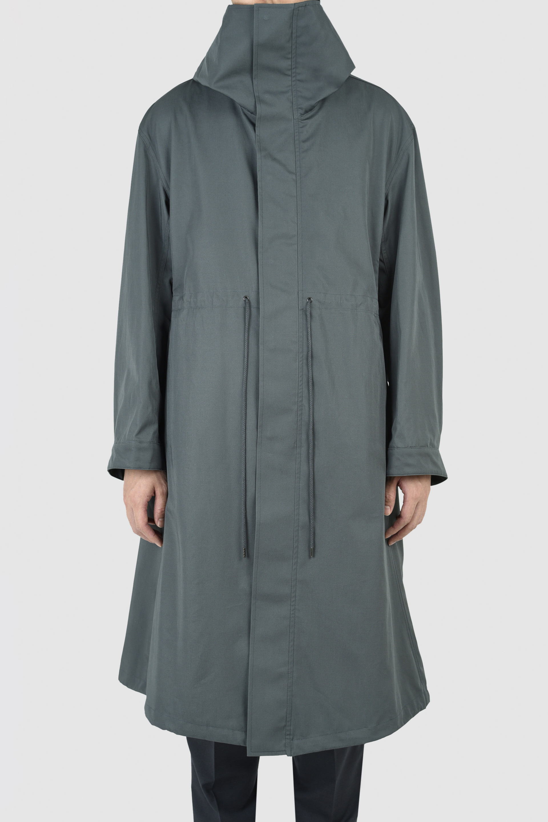 ハリのある質感と滑らかな肌触りのギャバ素材を使用した一重仕立てのビッグモッズコート。