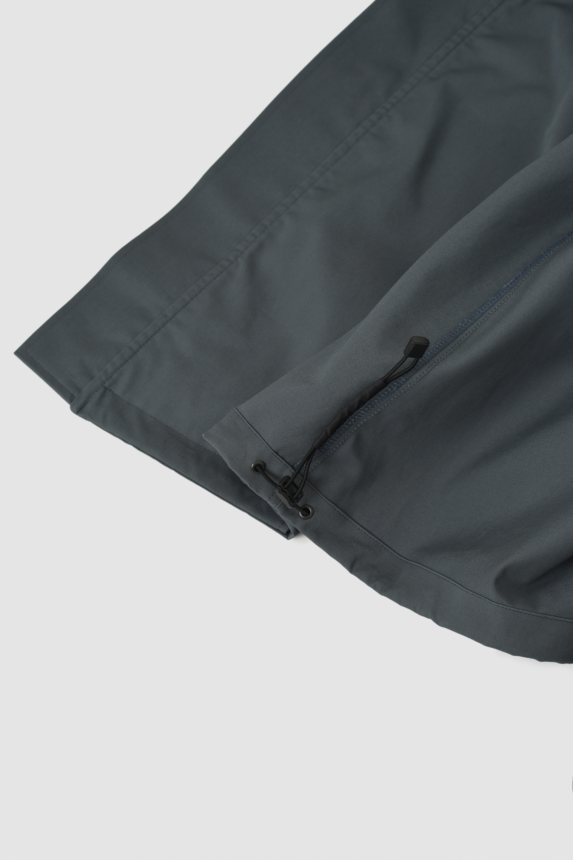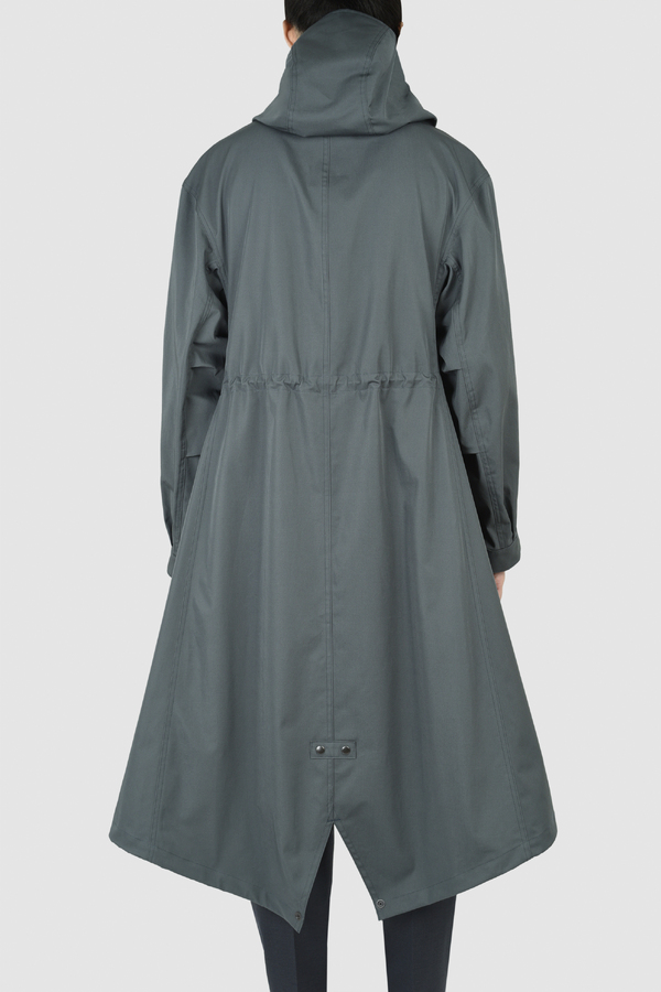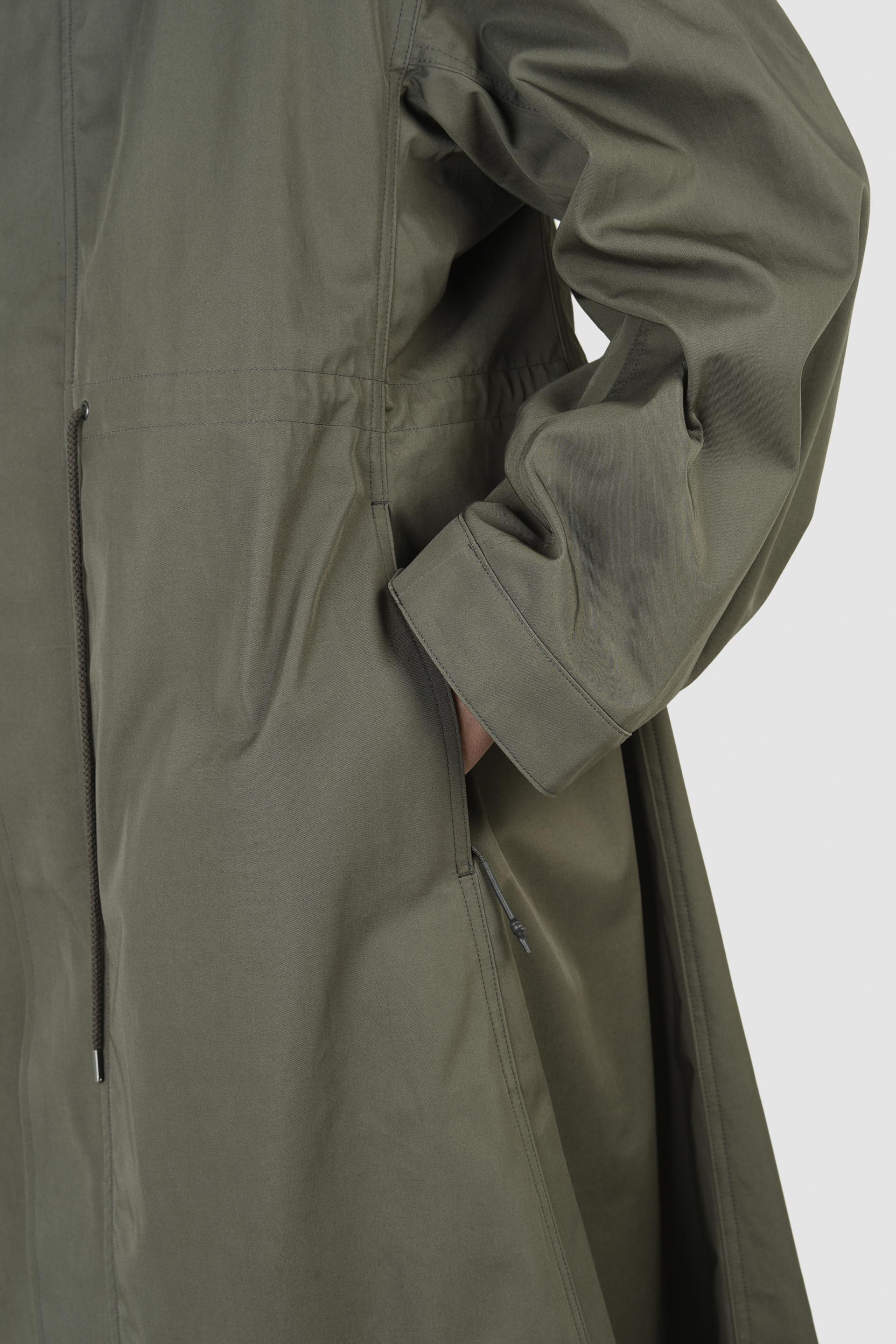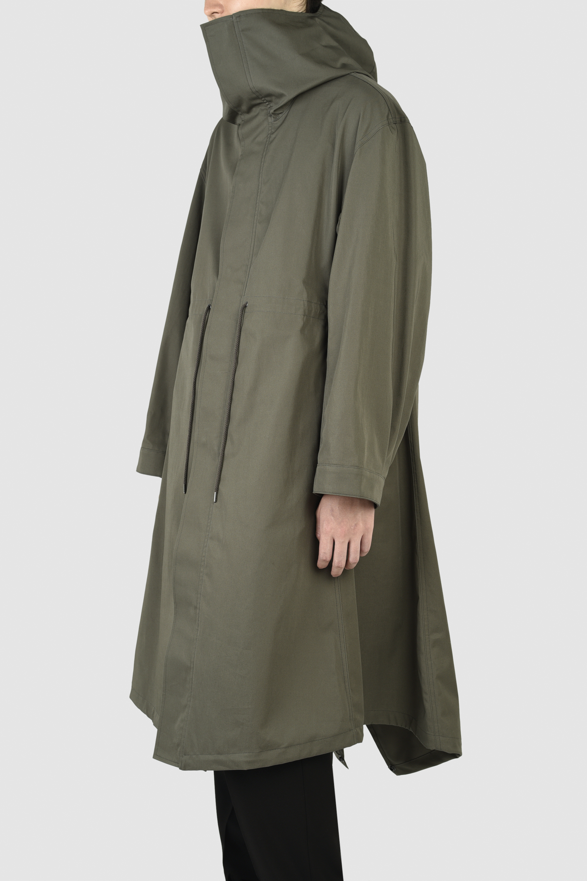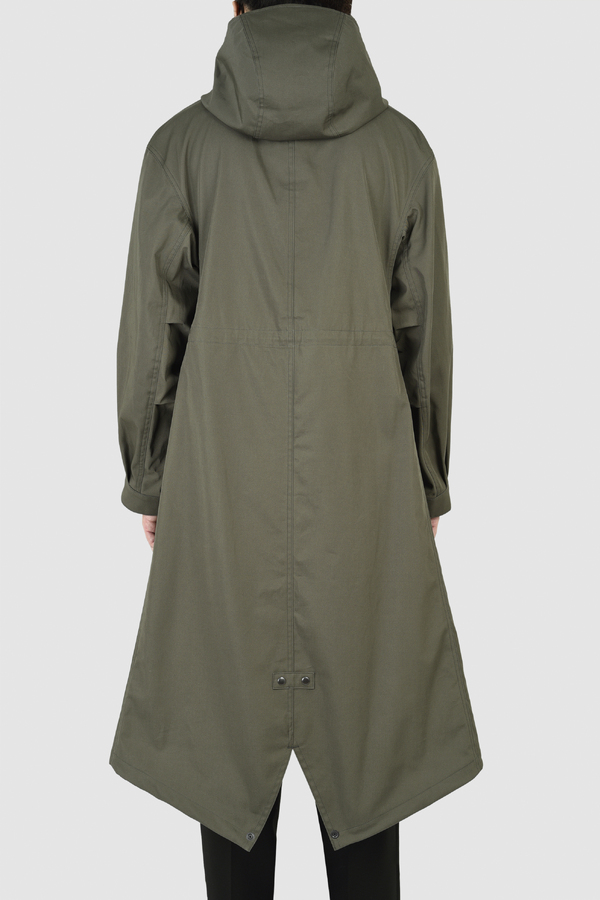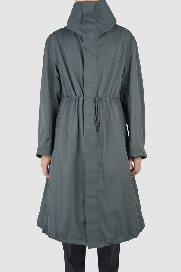 ハリのある質感と滑らかな肌触りのギャバ素材を使用した一重仕立てのビッグモッズコート。