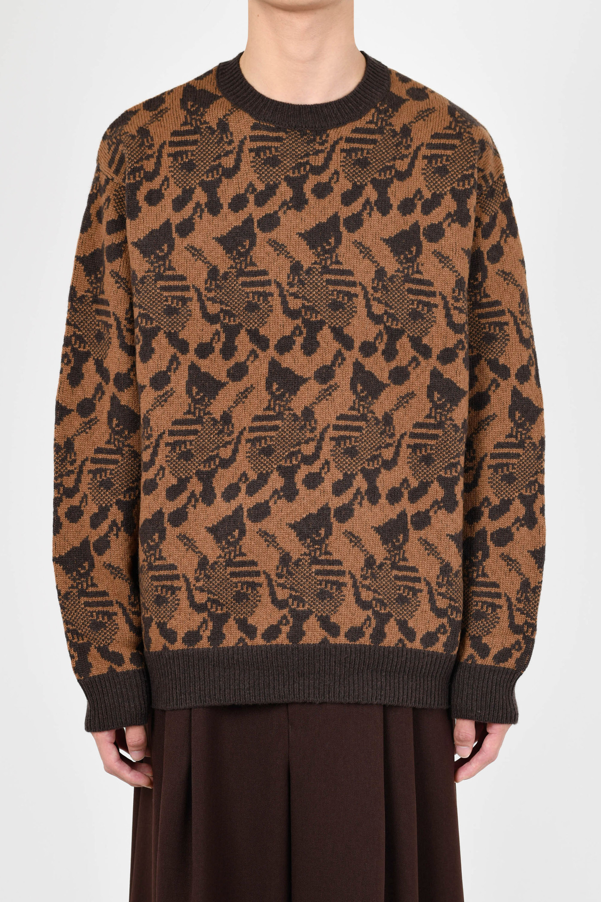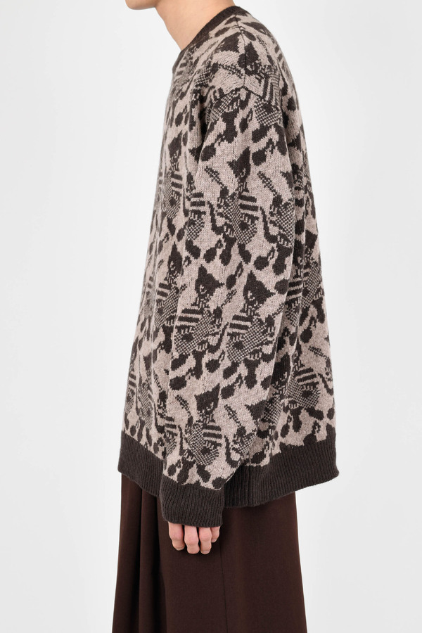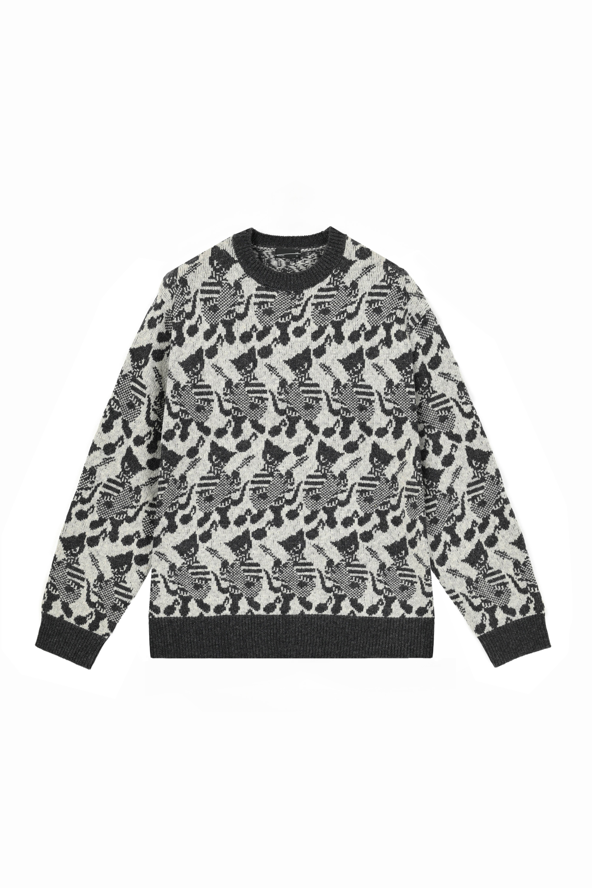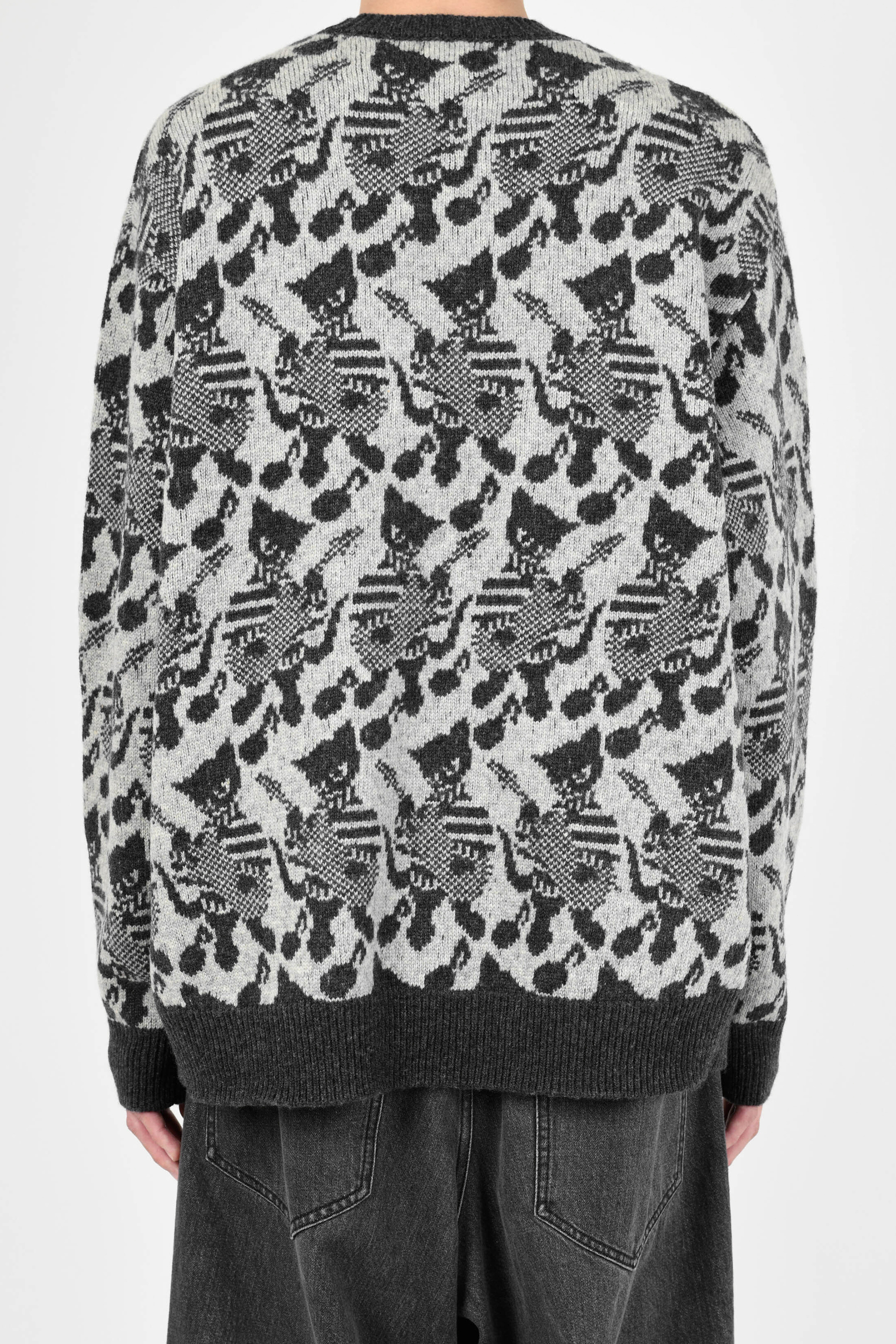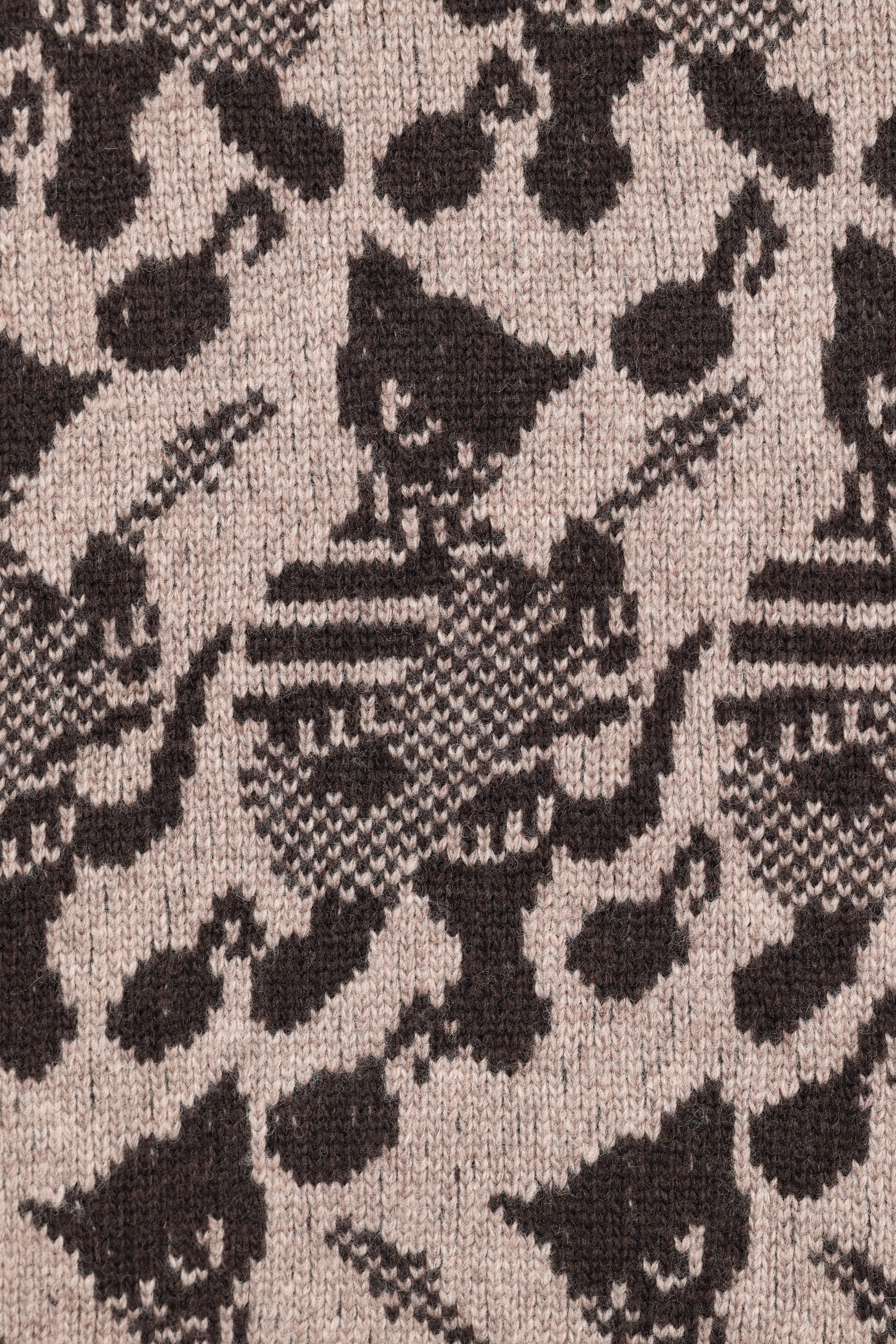 ラムウールの混紡糸を使用したギターを弾く猫の柄のニットプルオーバー。