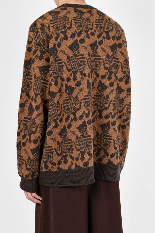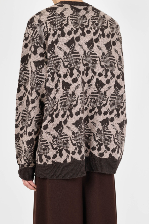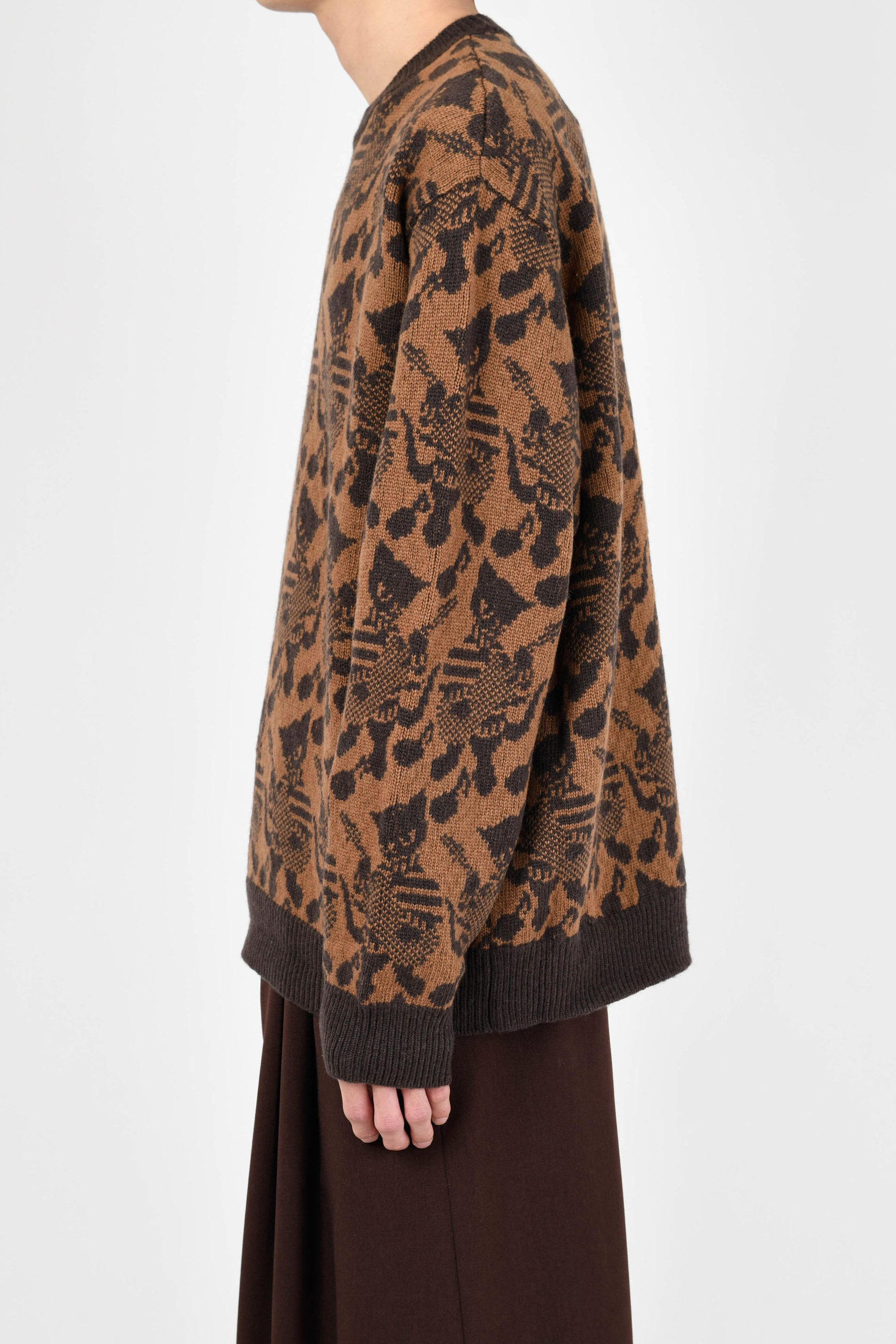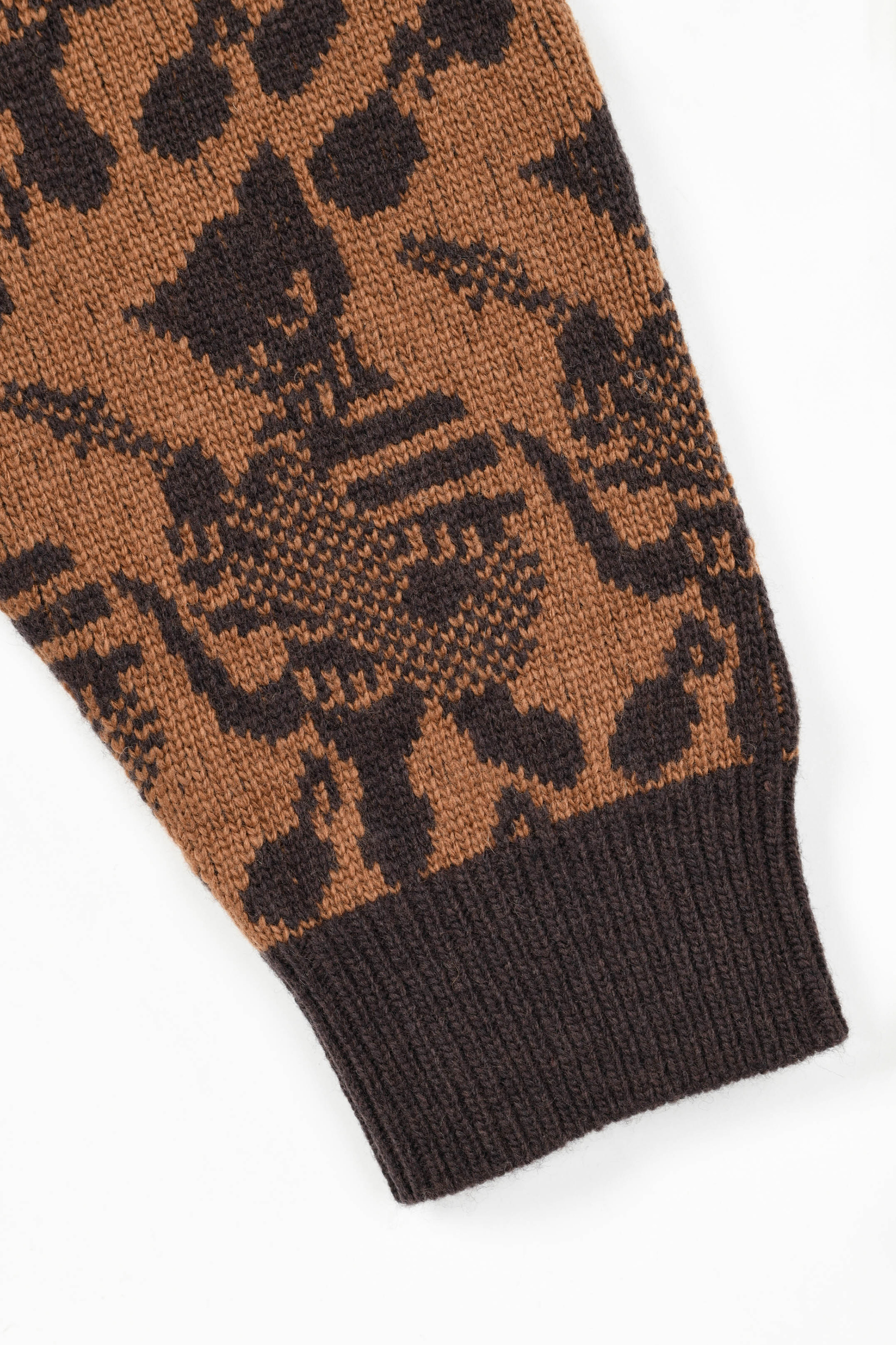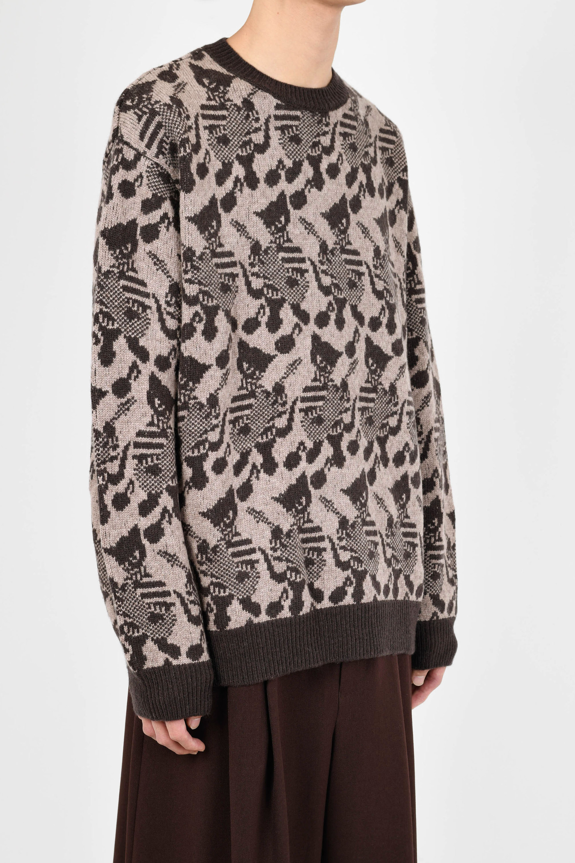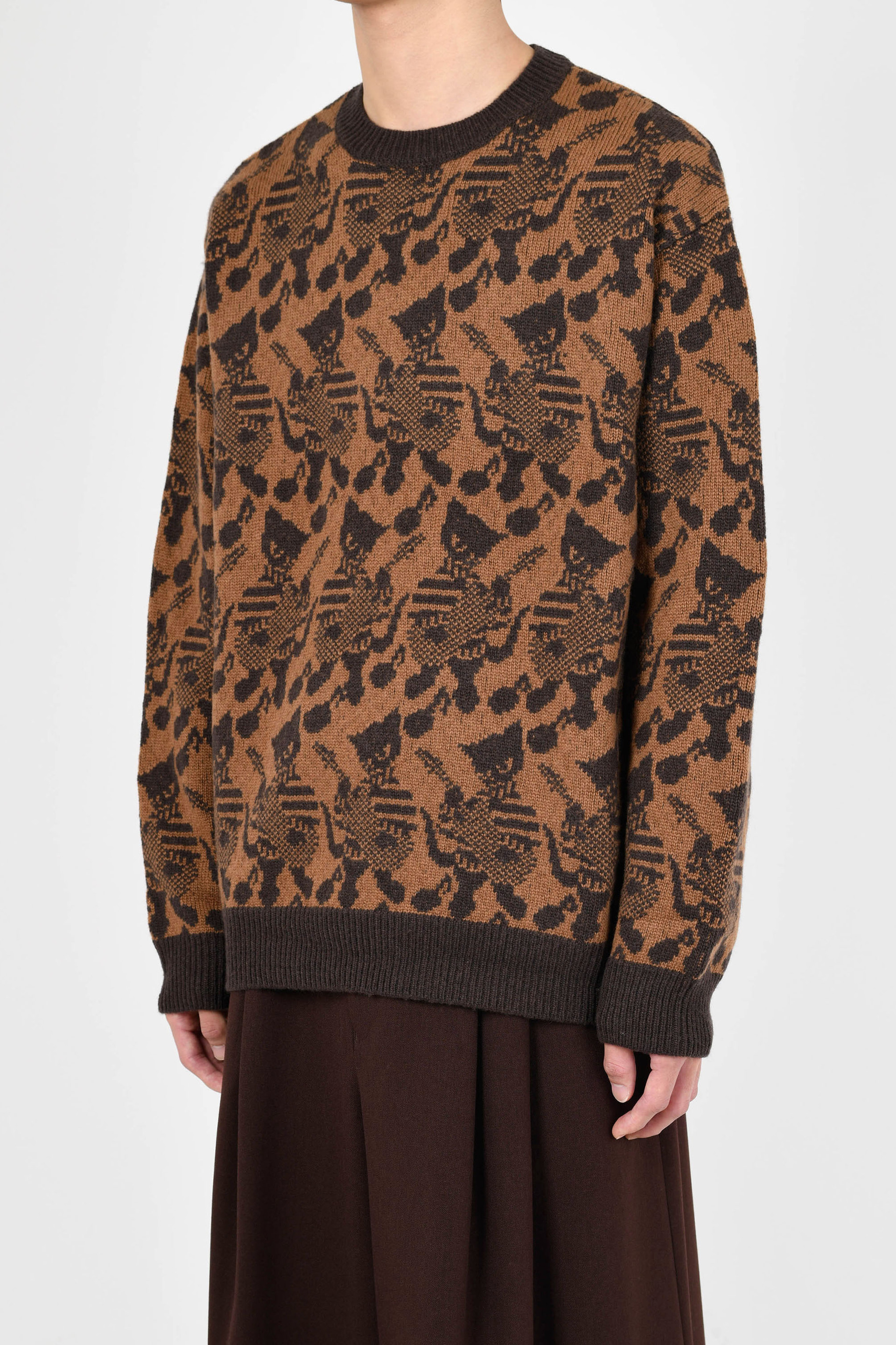 ラムウールの混紡糸を使用したギターを弾く猫の柄のニットプルオーバー。