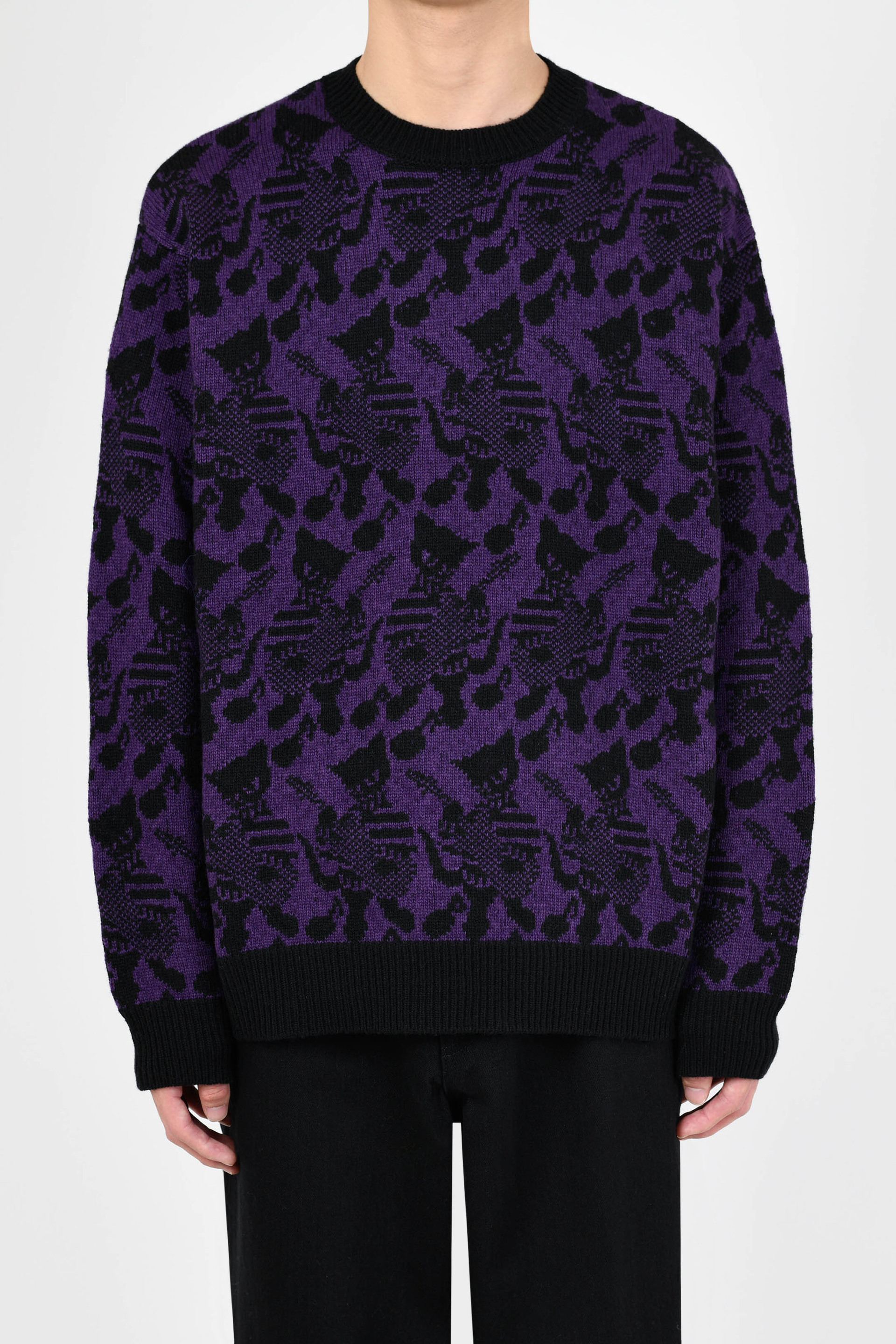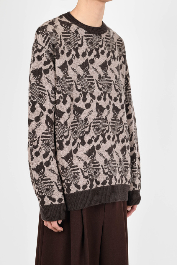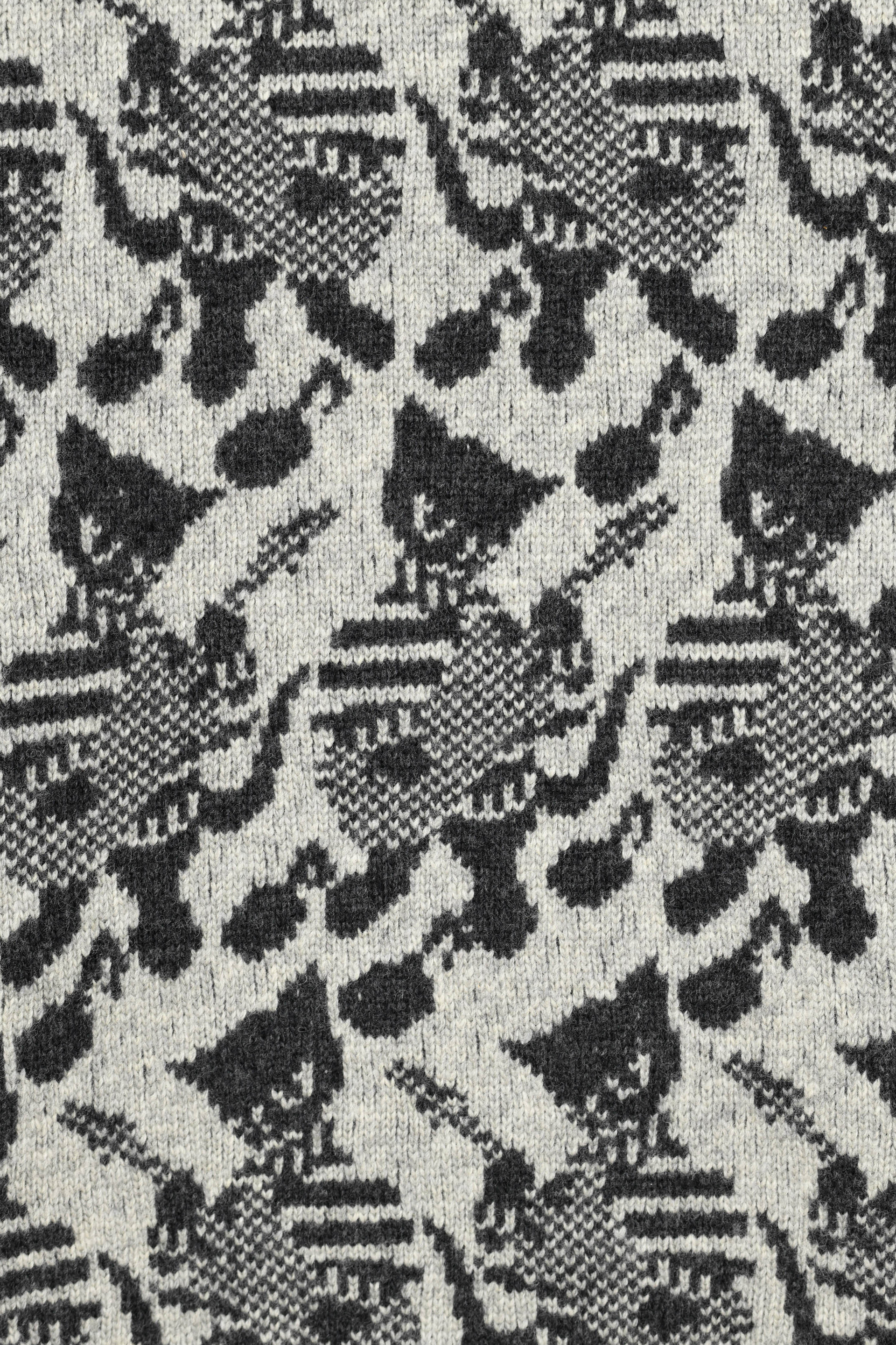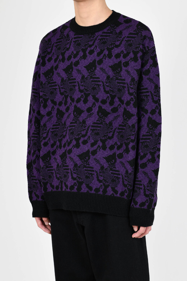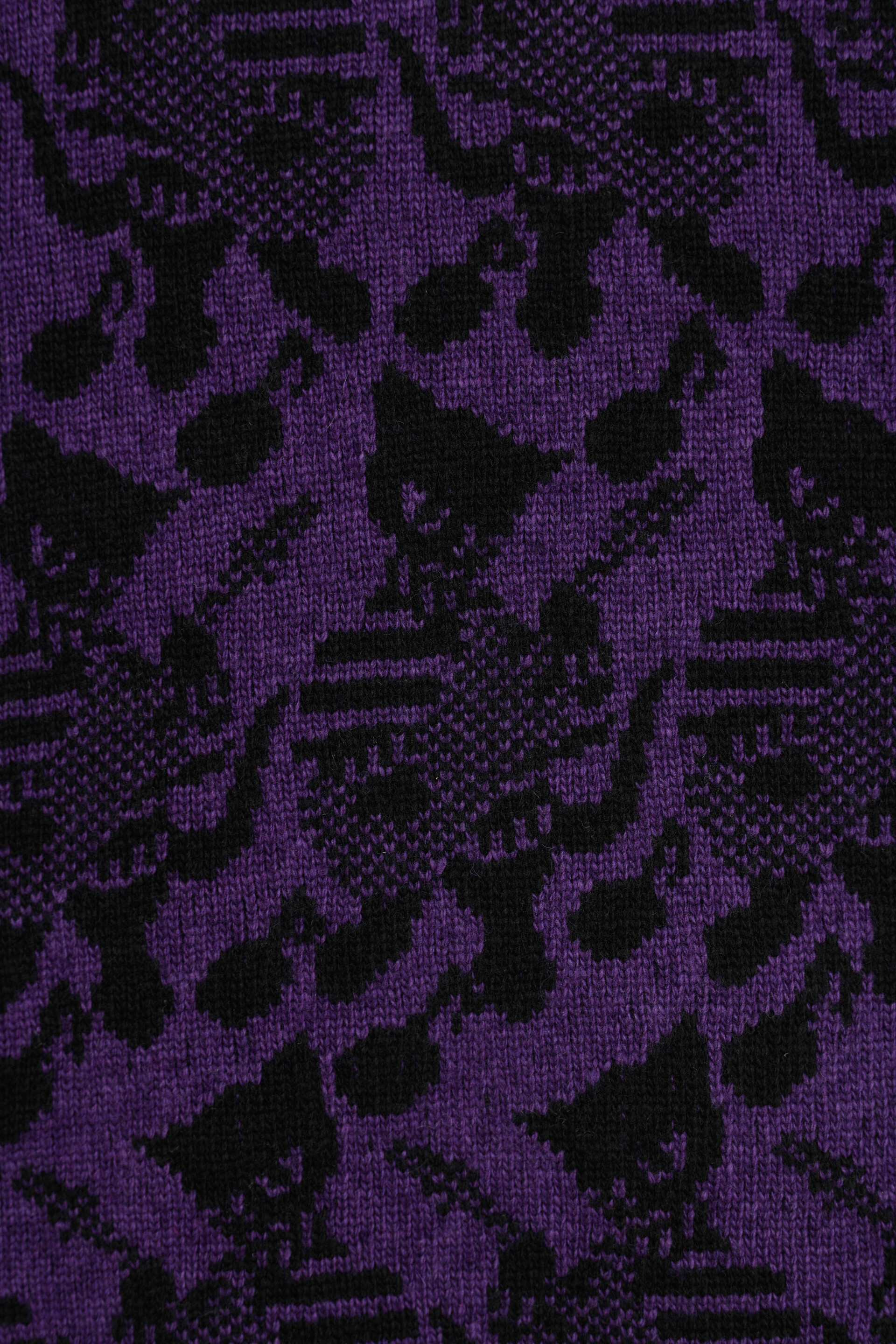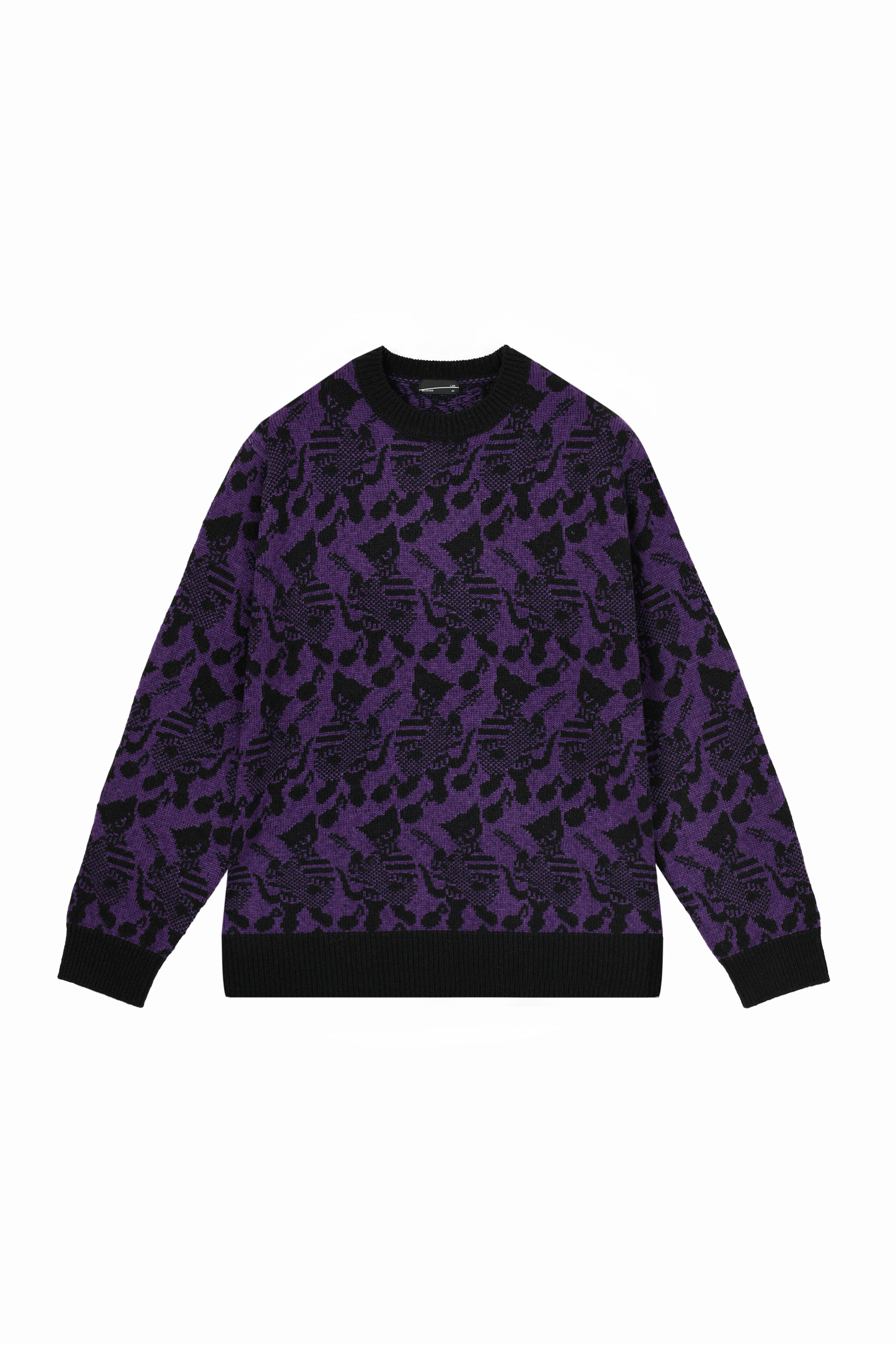 ラムウールの混紡糸を使用したギターを弾く猫の柄のニットプルオーバー。