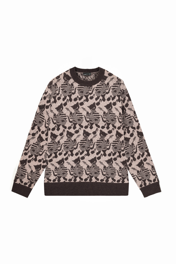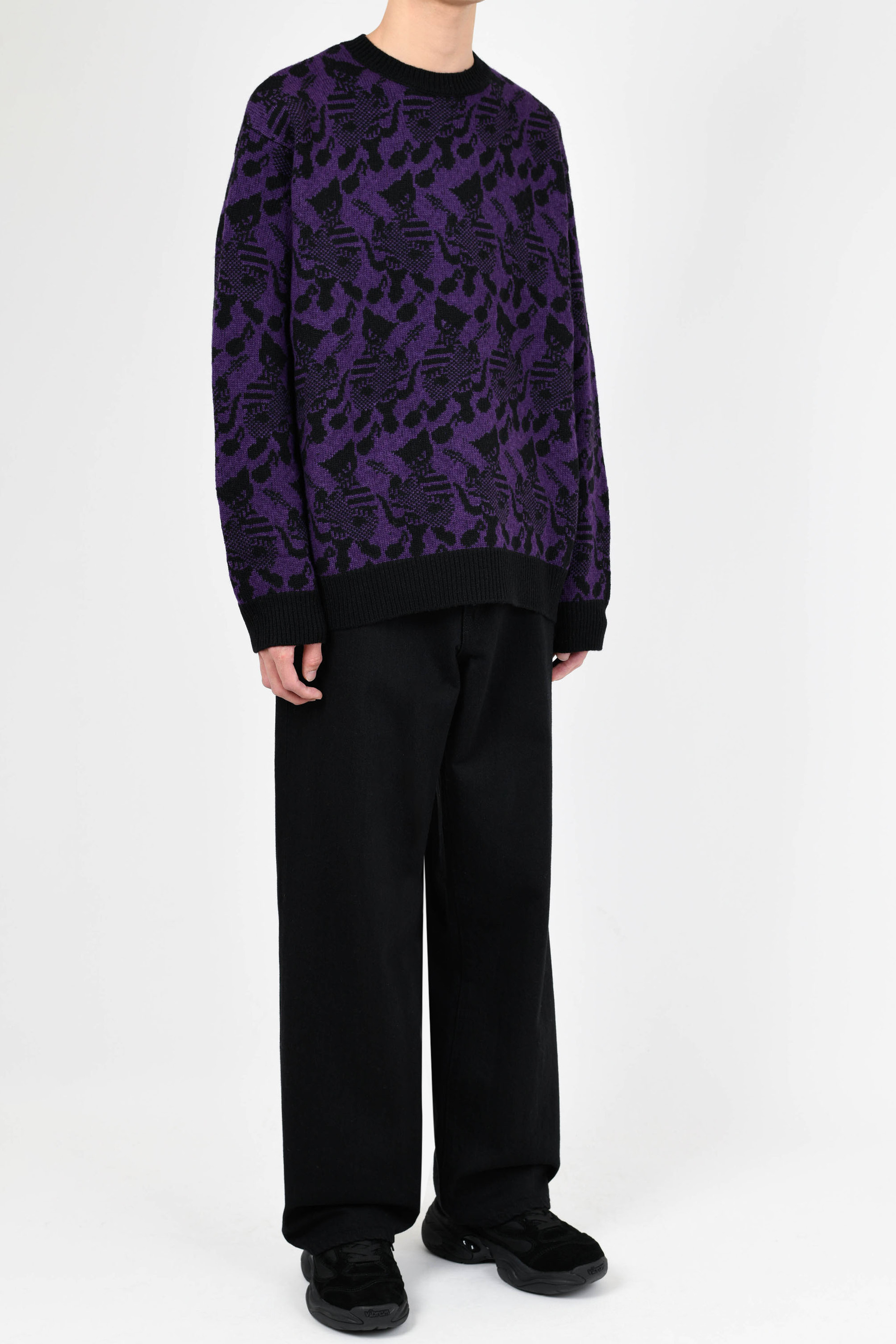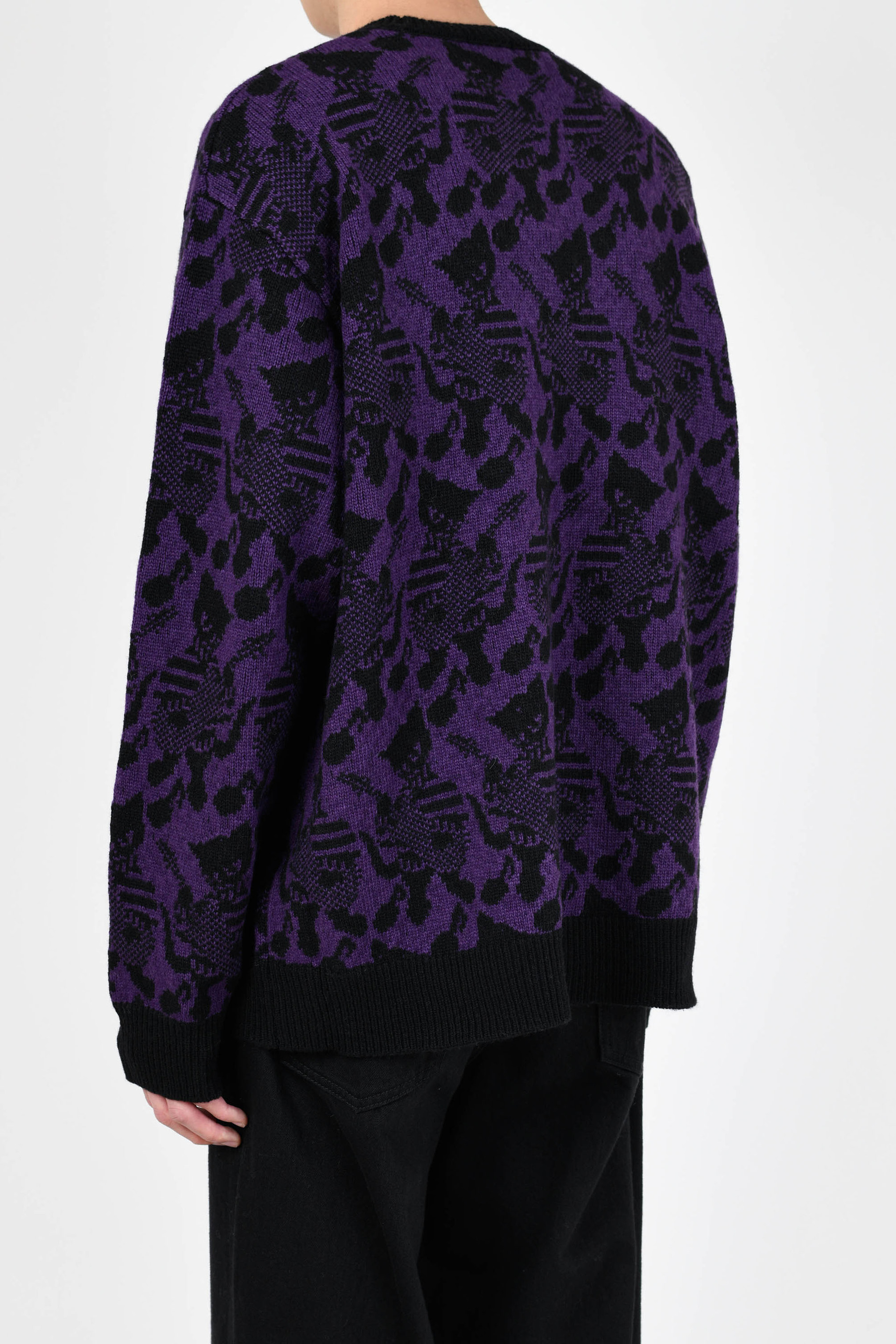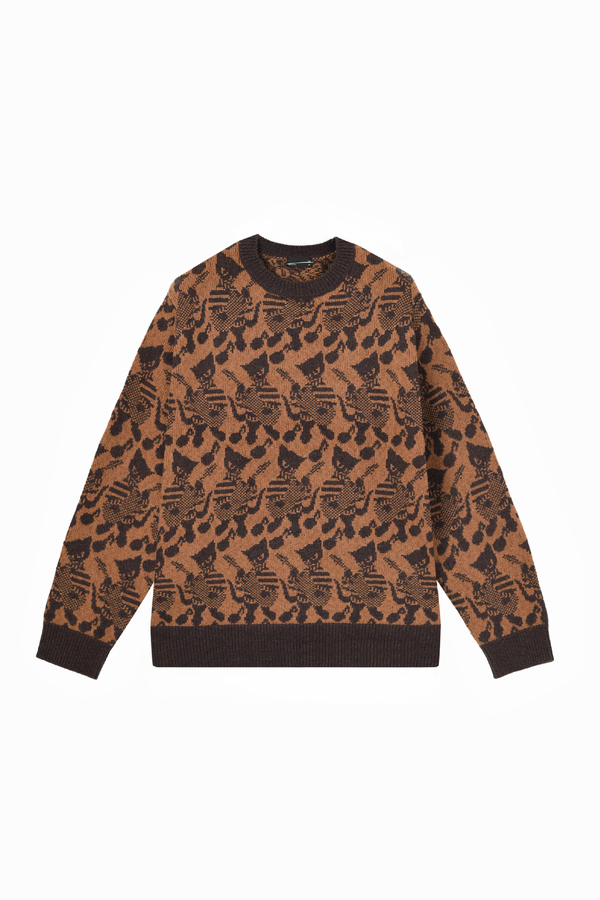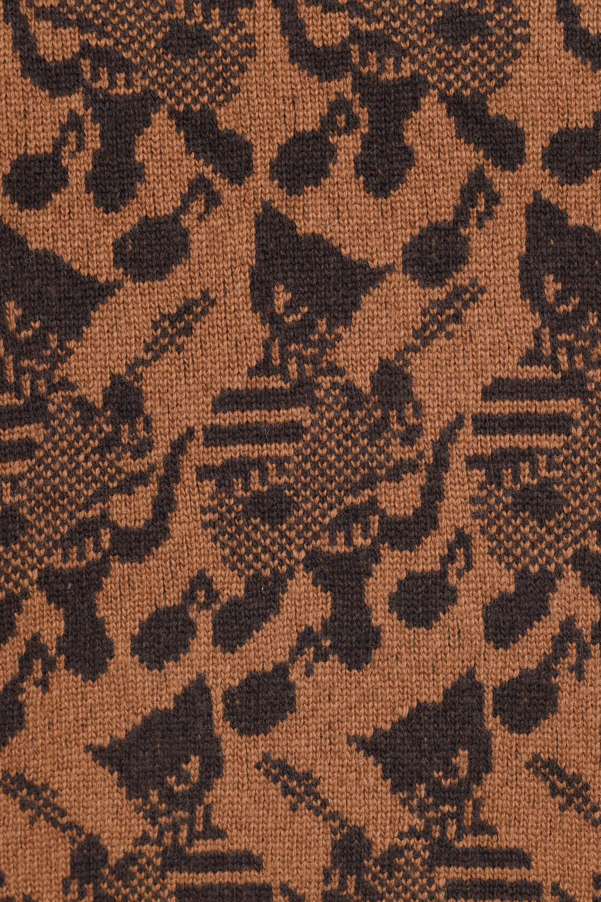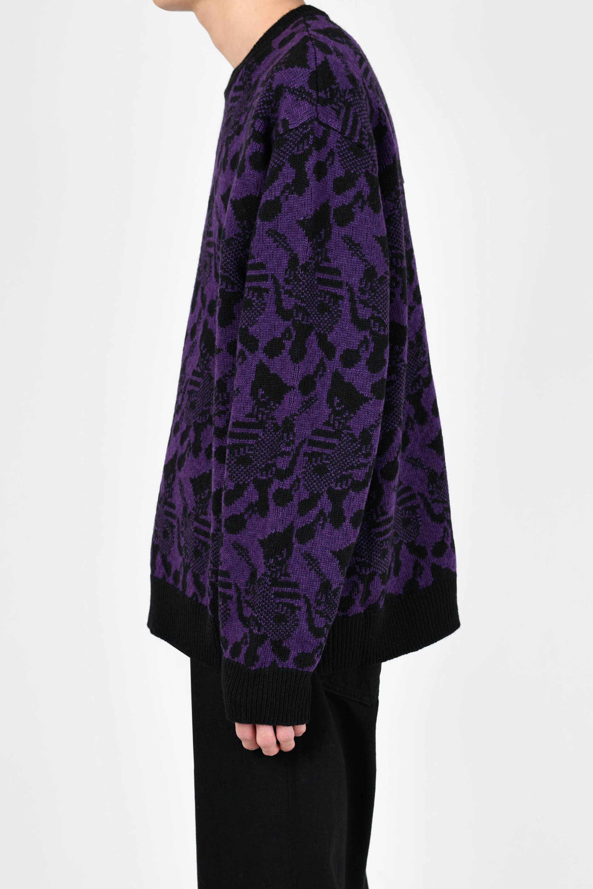 ラムウールの混紡糸を使用したギターを弾く猫の柄のニットプルオーバー。