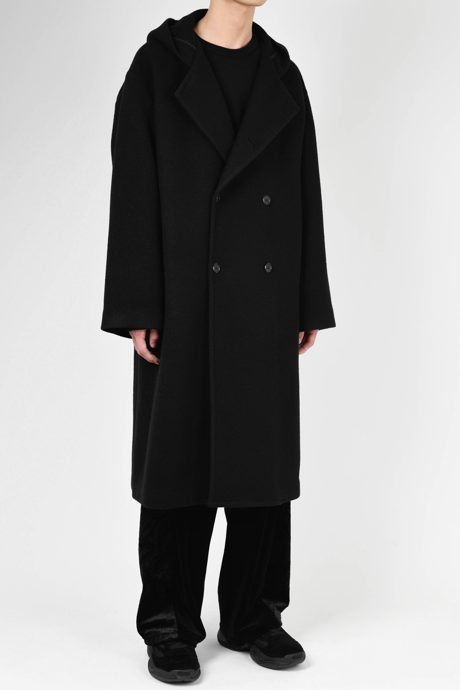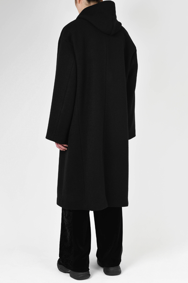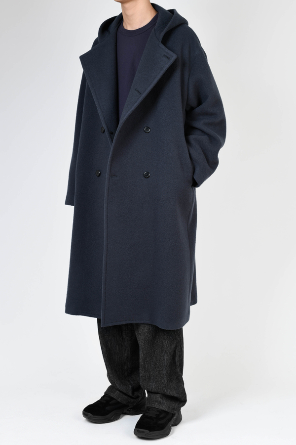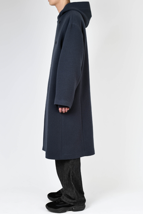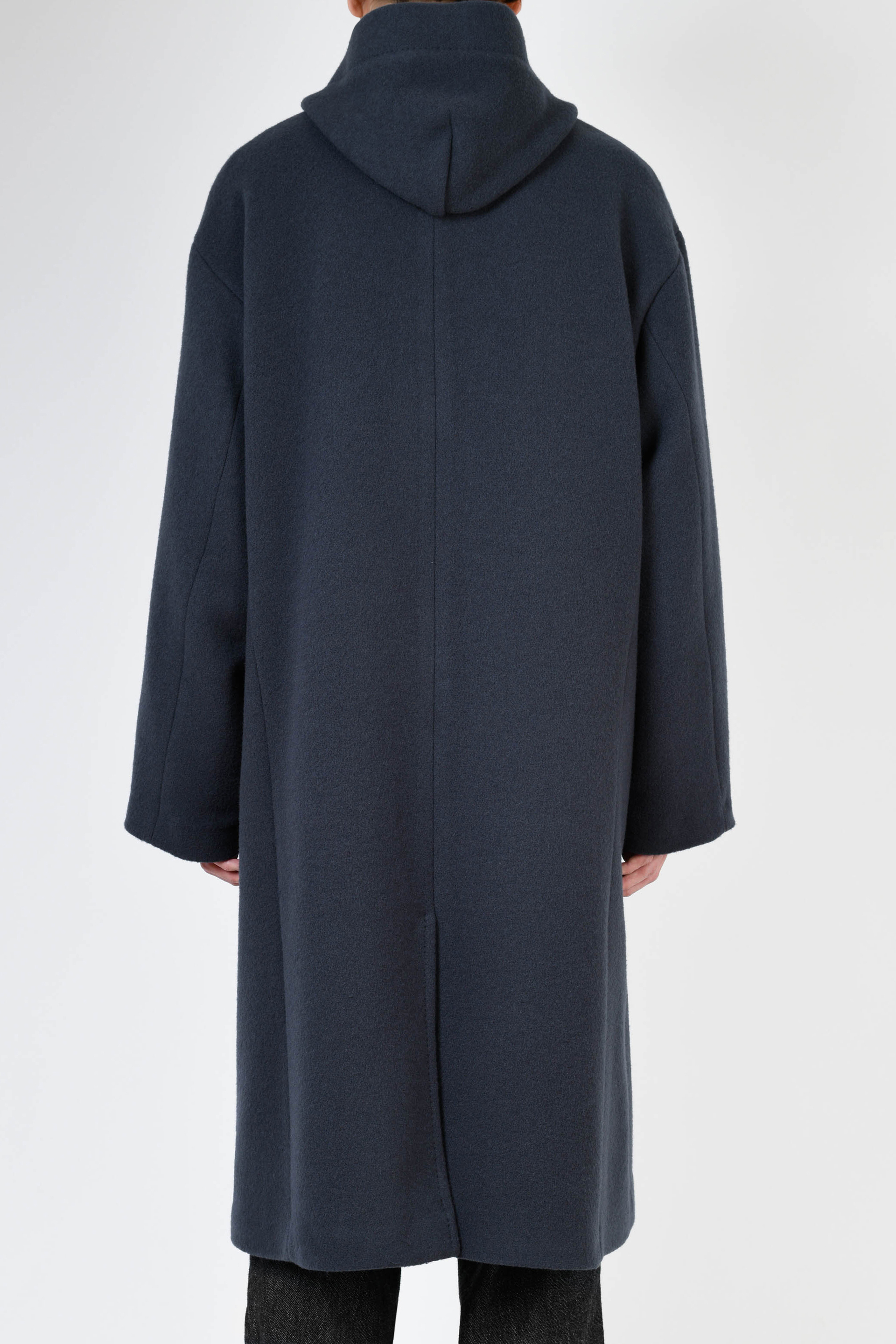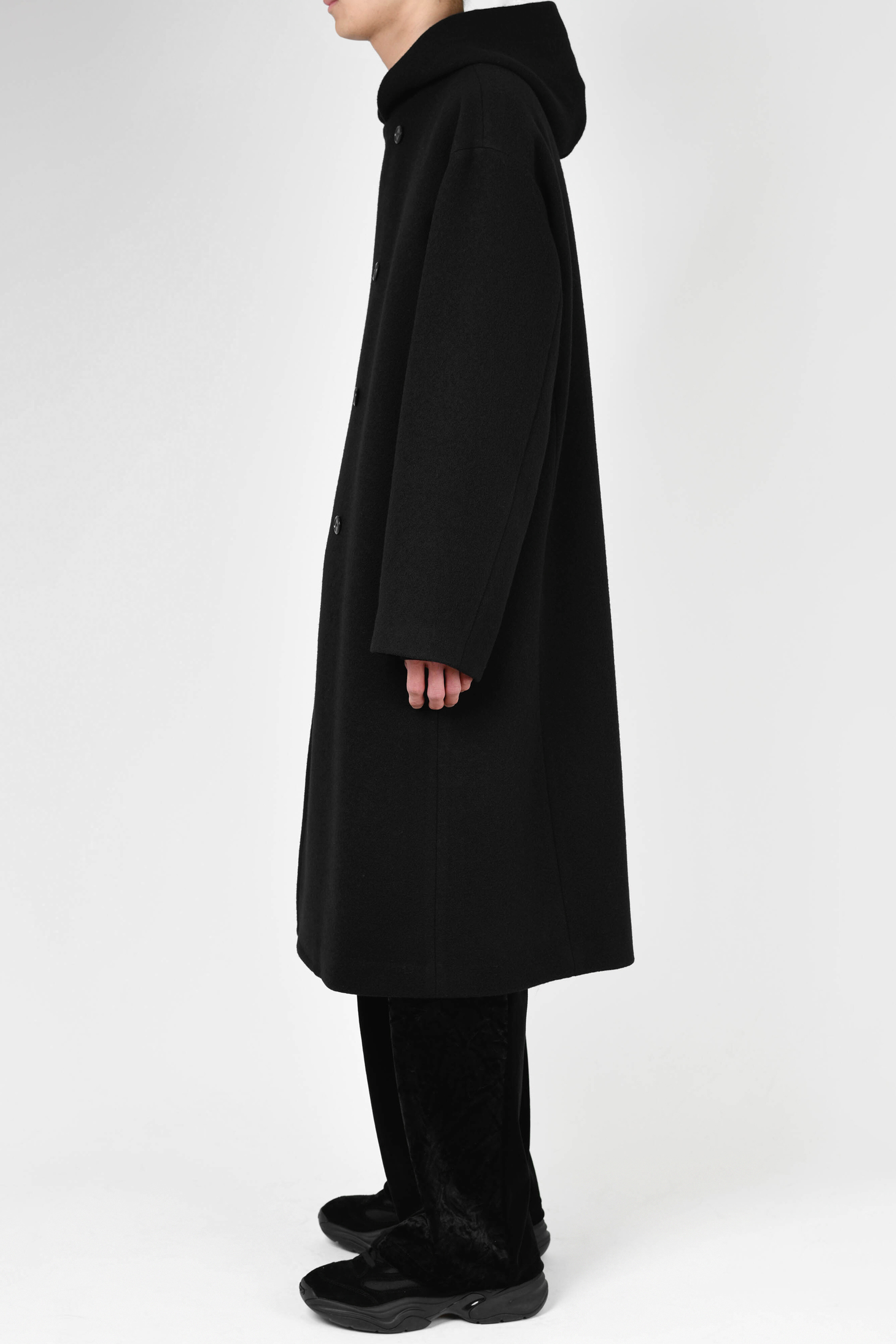 フードは一重仕立てで軽く仕上げた、ルーズフィットシルエットの膝下丈ロングコートです。