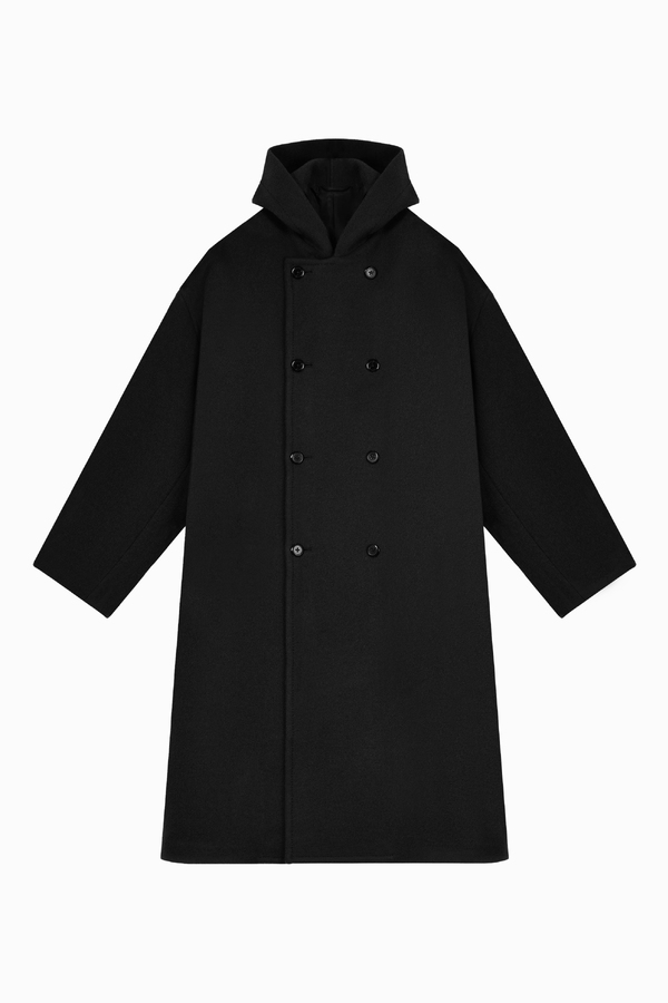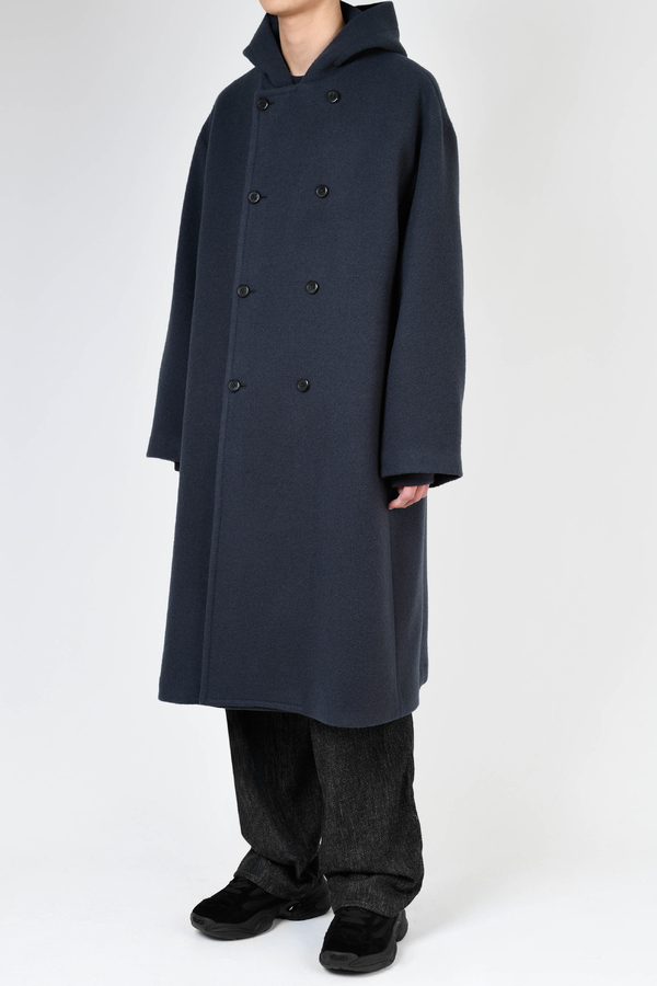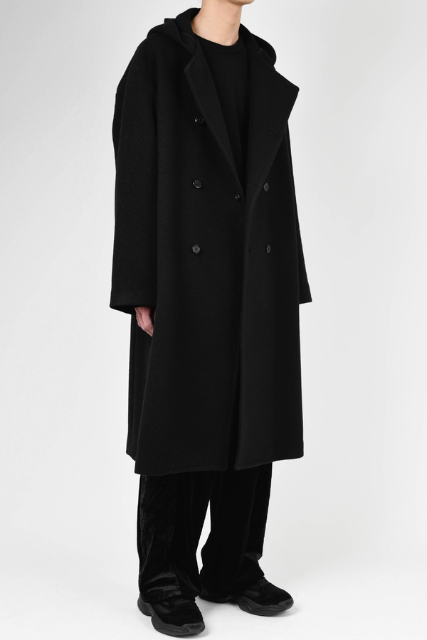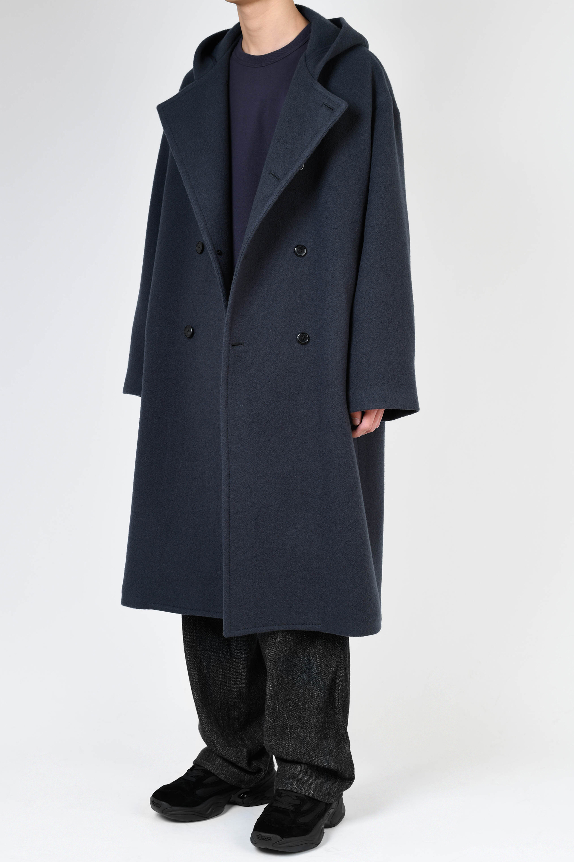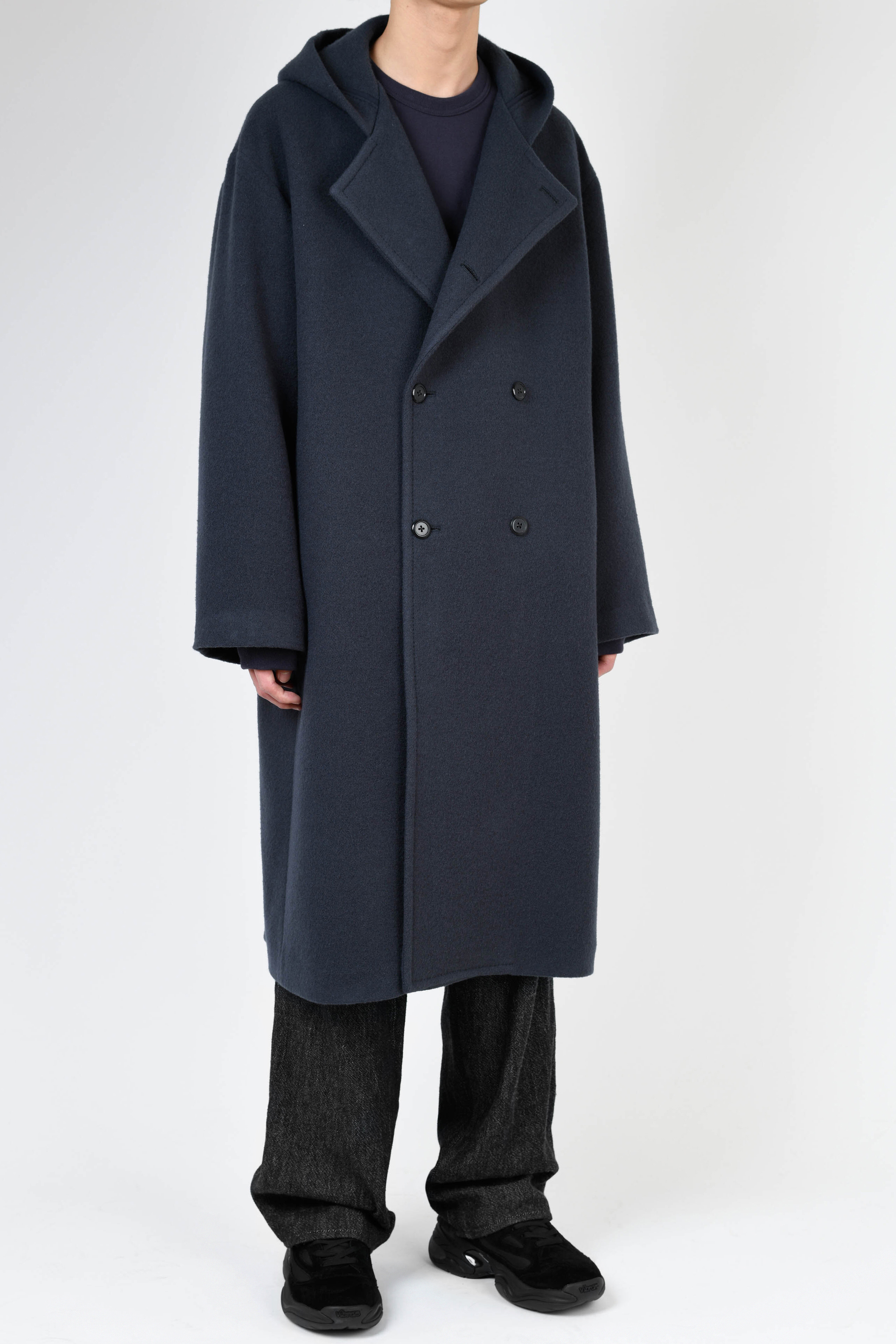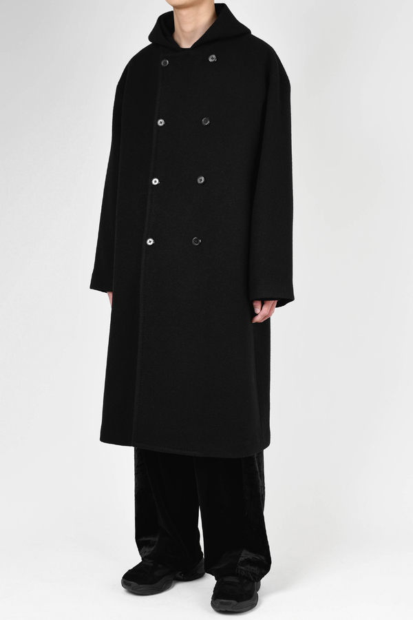 フードは一重仕立てで軽く仕上げた、ルーズフィットシルエットの膝下丈ロングコートです。