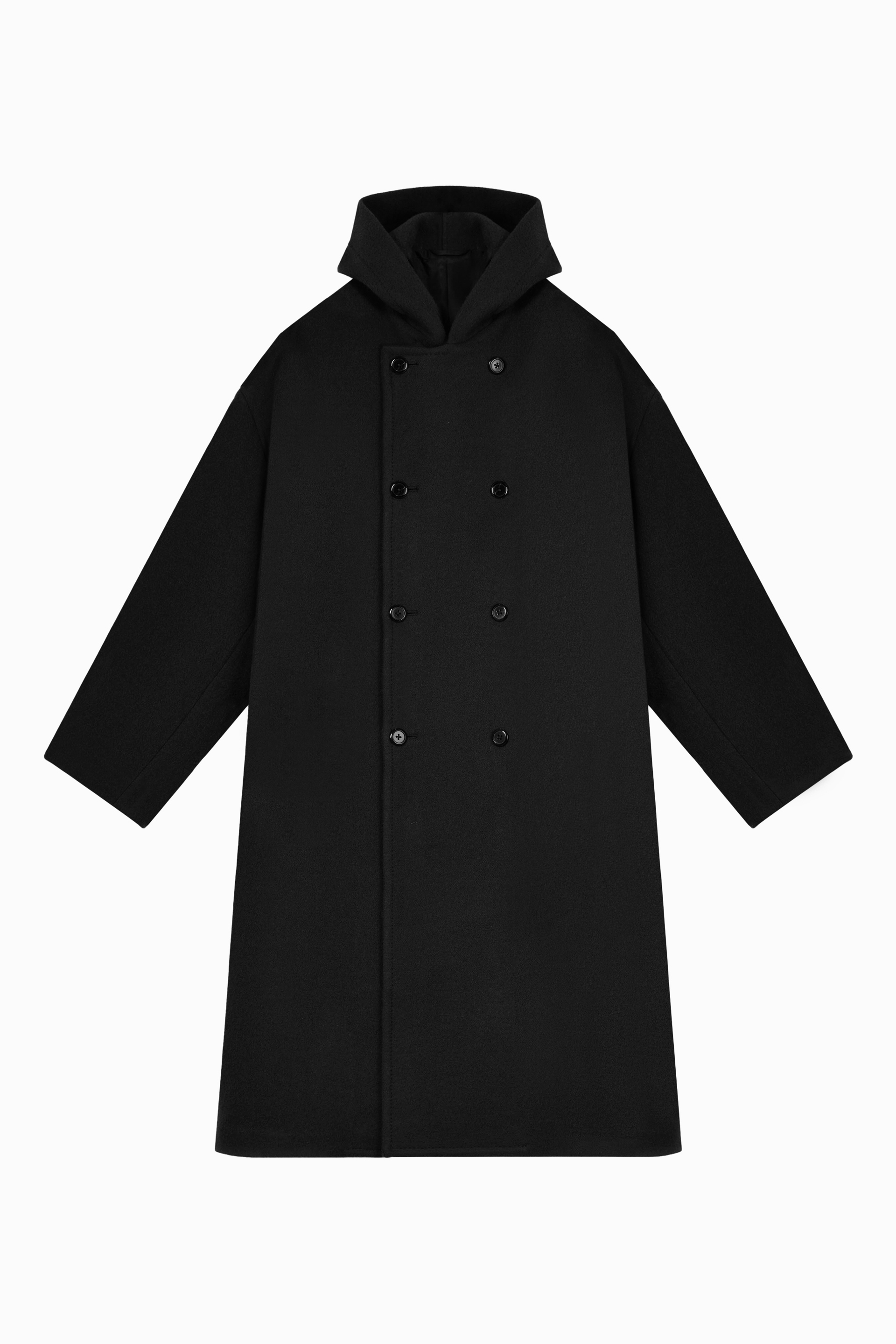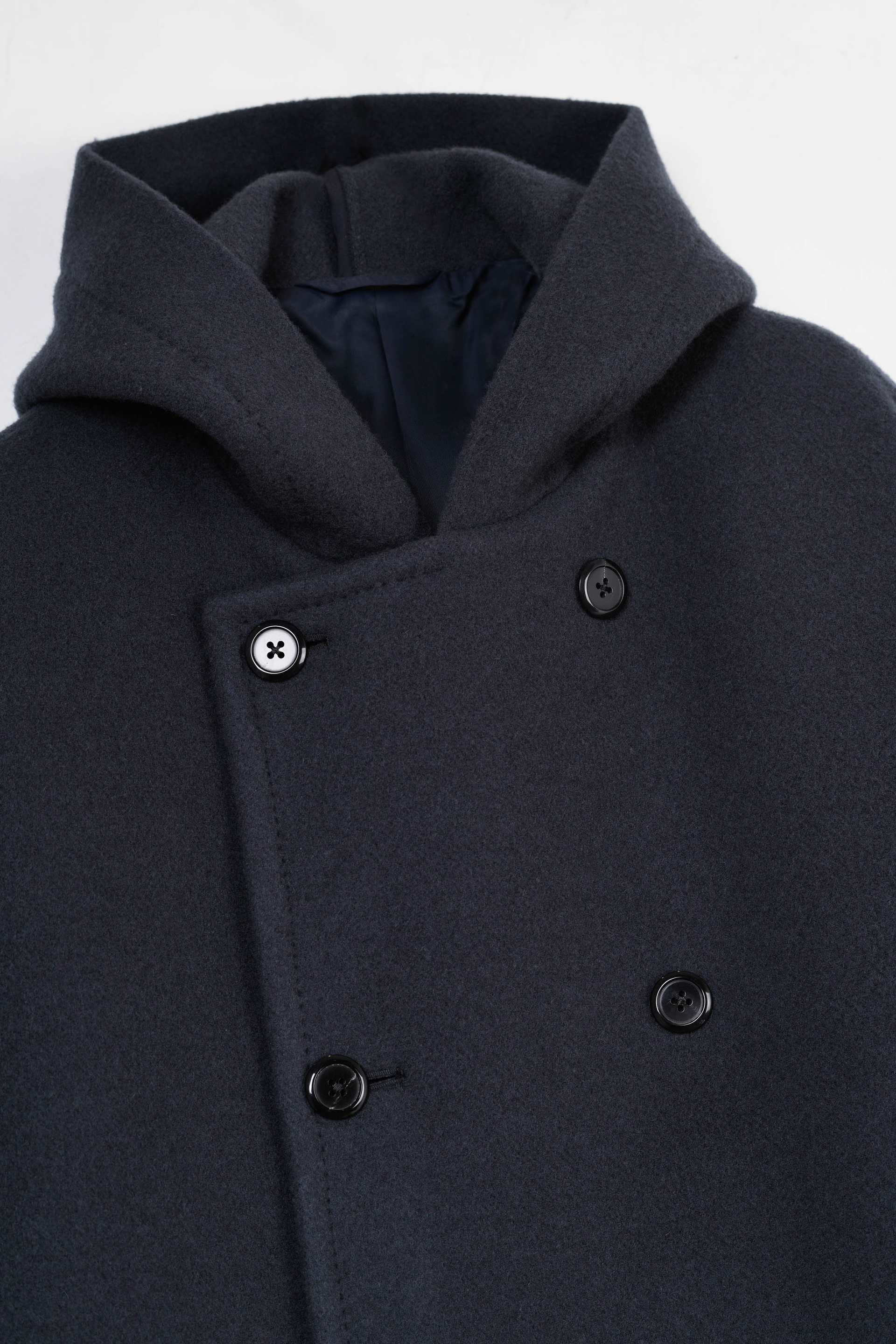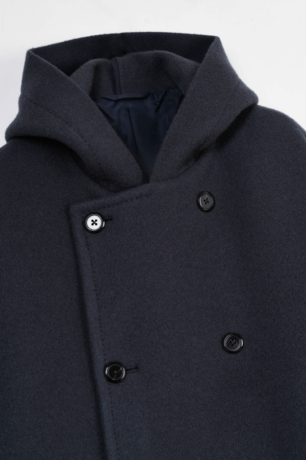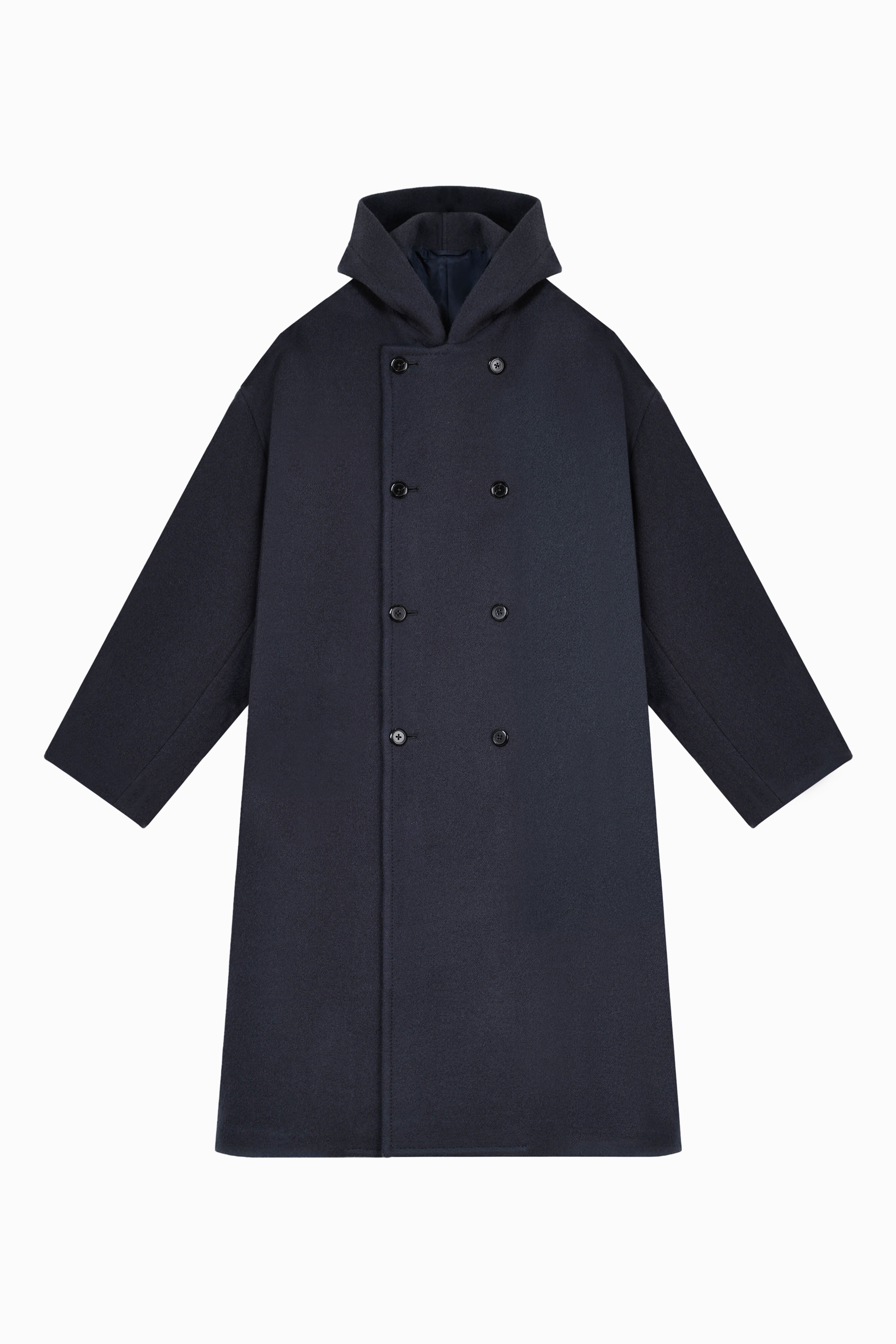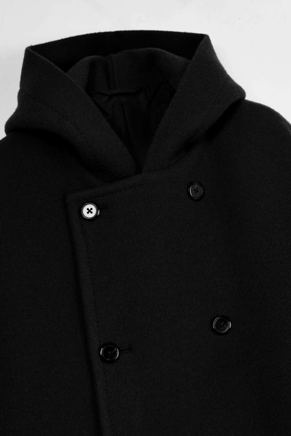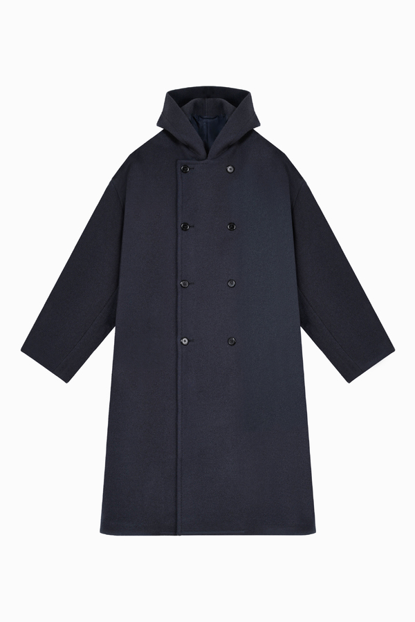 フードは一重仕立てで軽く仕上げた、ルーズフィットシルエットの膝下丈ロングコートです。