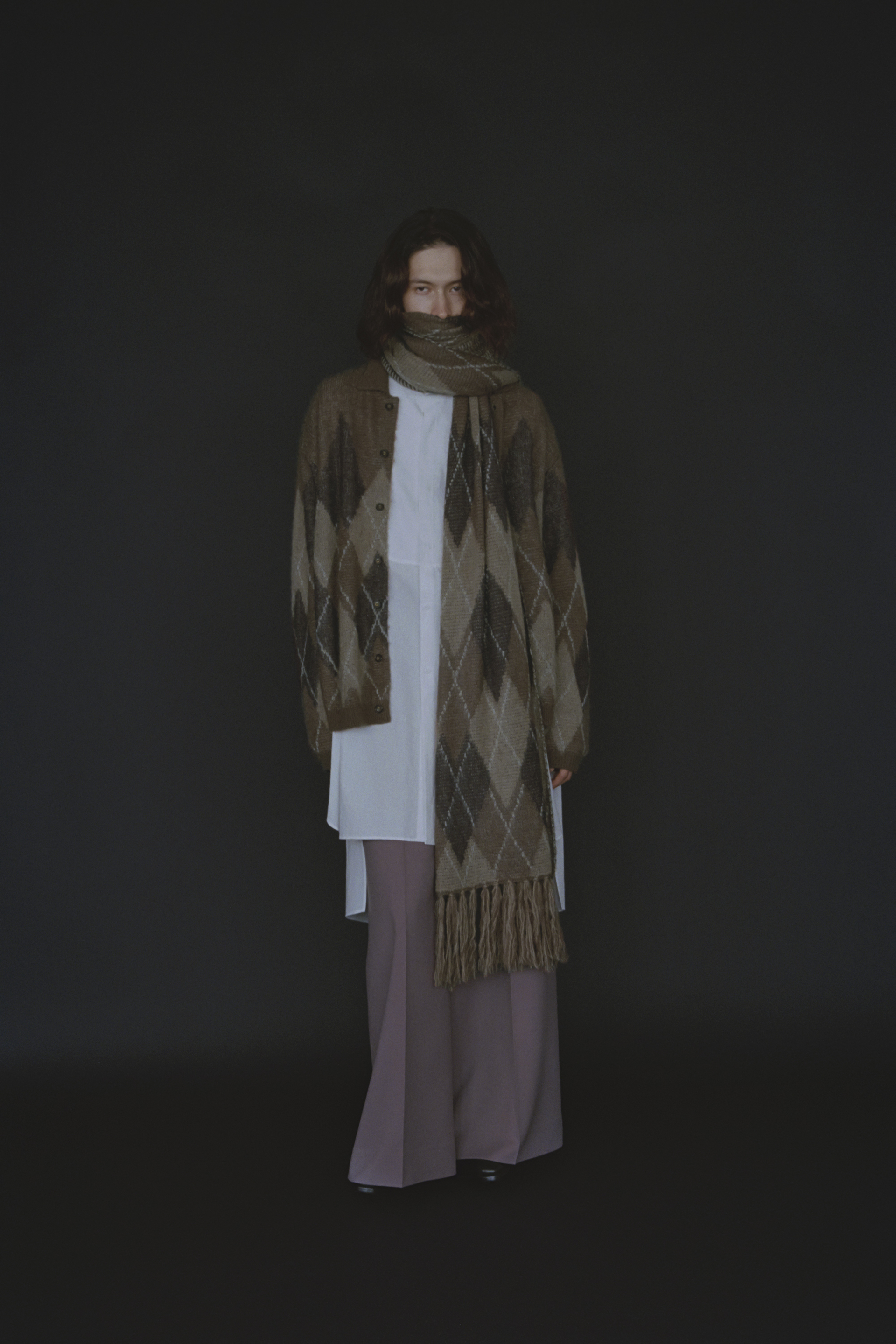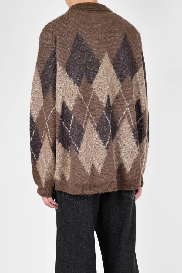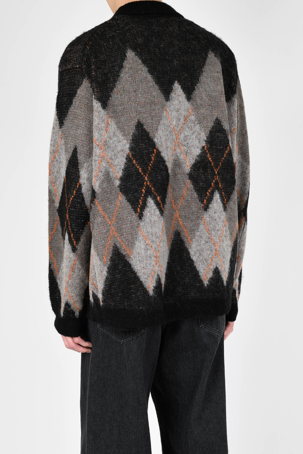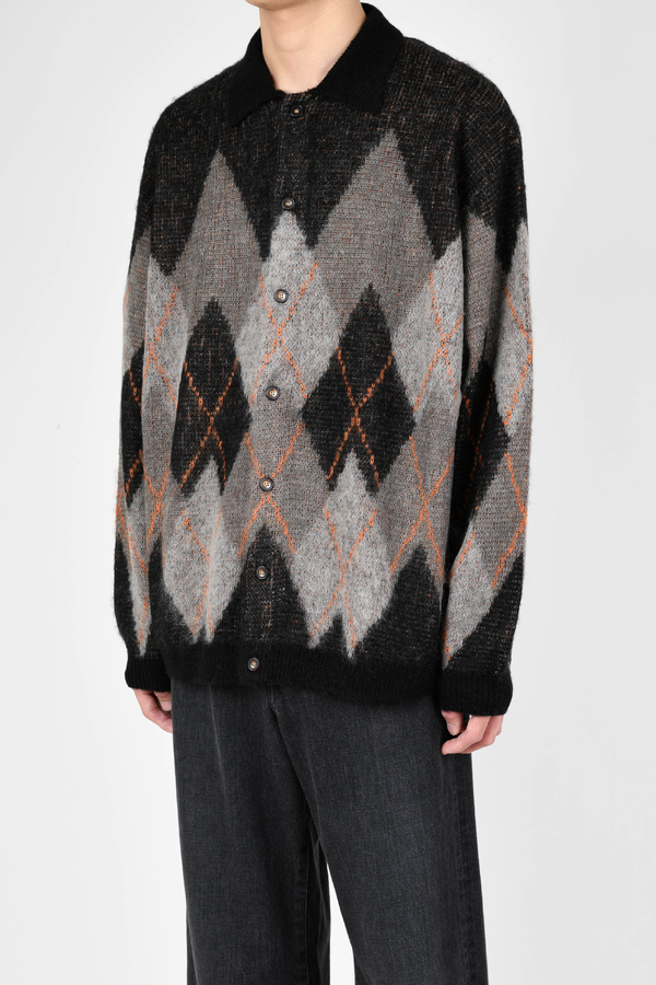 ユニセックスに対応するゆとりのあるサイズ感です。- MOHAIR SHAGGY ARGYLE INTARSIA KNIT:ACRYLIC 55% NYLON 30% WOOL 10% MOHAIR 5%