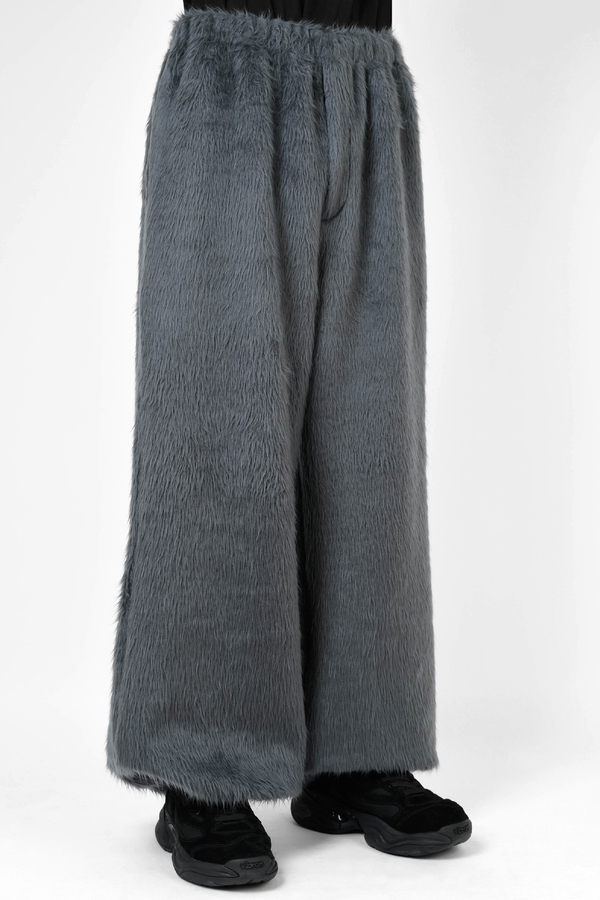 シャギー素材を使用したワイドフレアパンツ。
