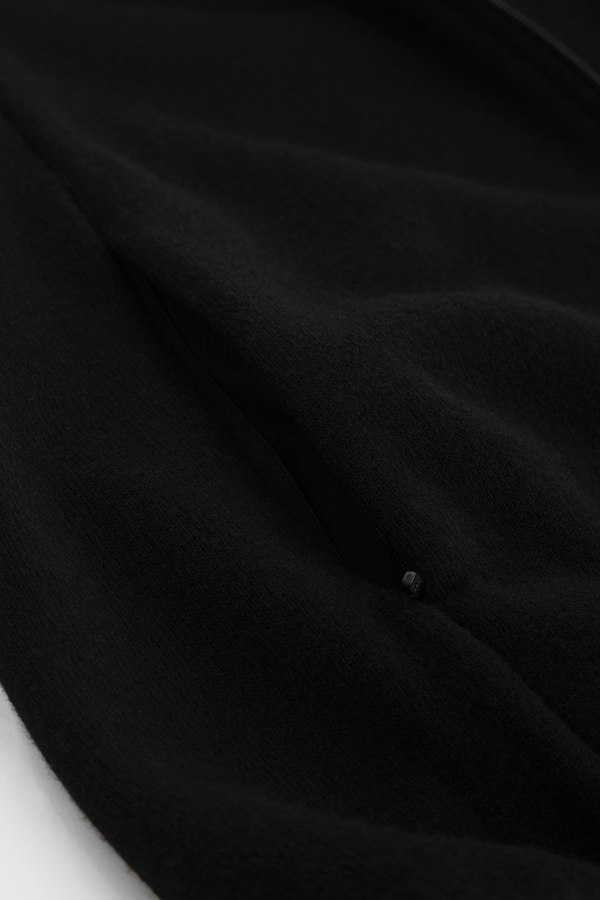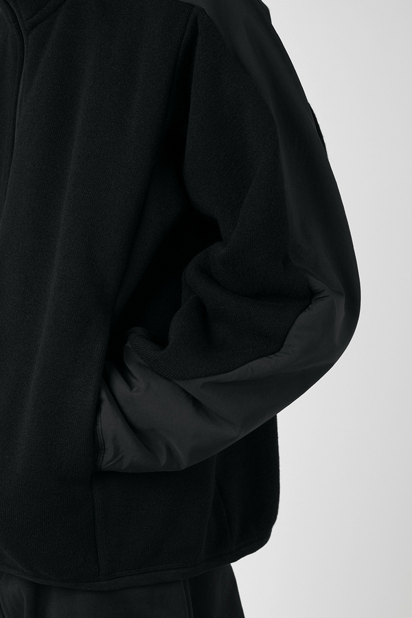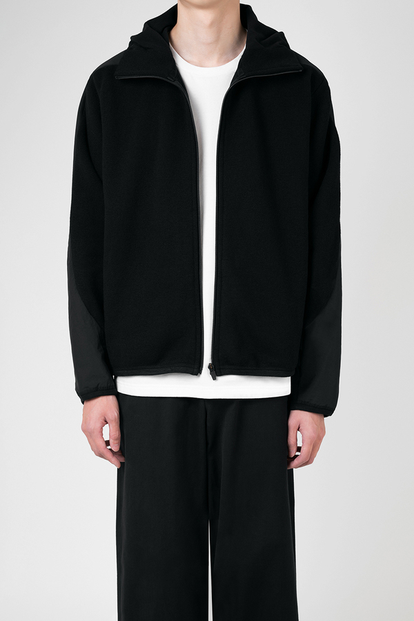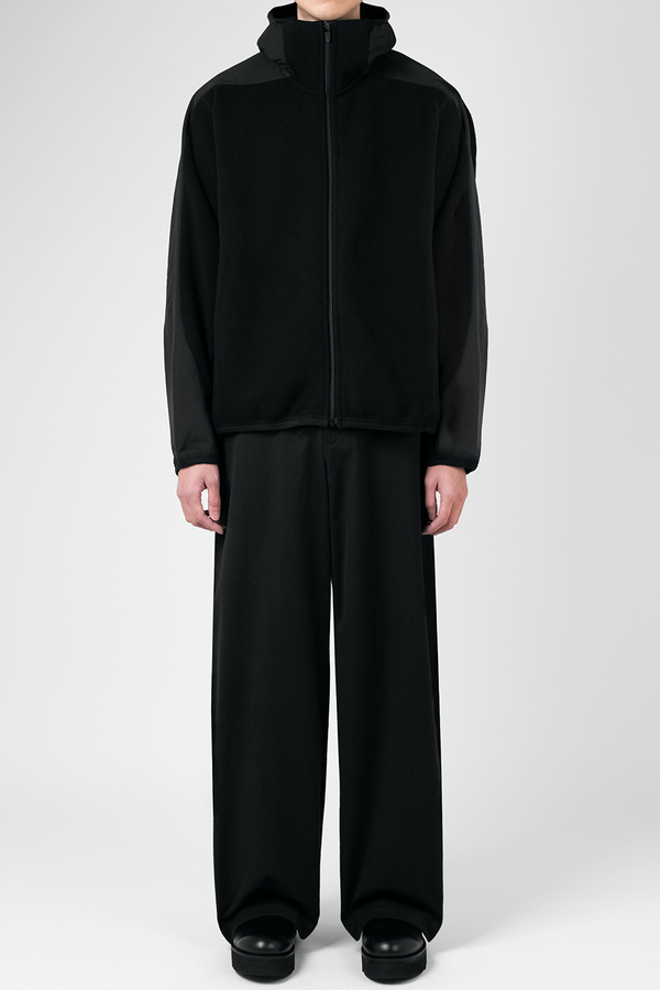 ウールローゲージパイル素材を使用したジップアップフーディーブルゾン。