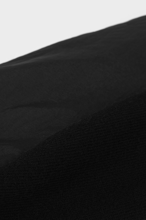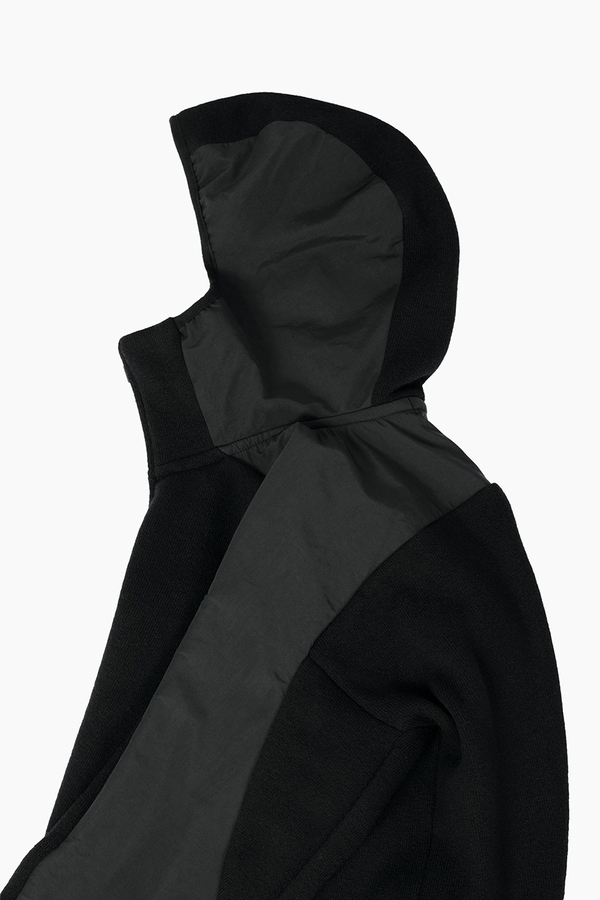 フードから袖にかけては、撥水機能を備えたナイロン素材で切り替え、