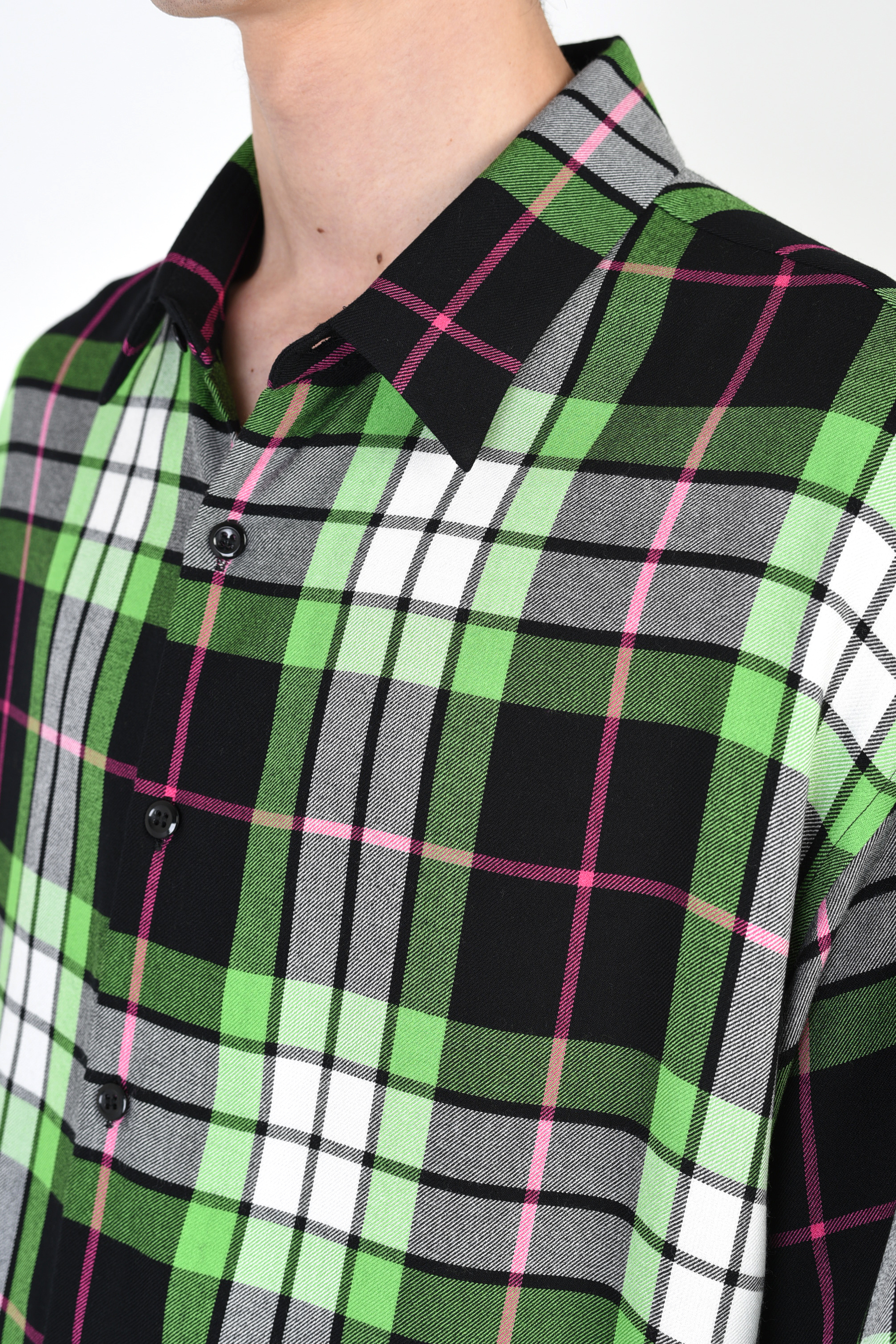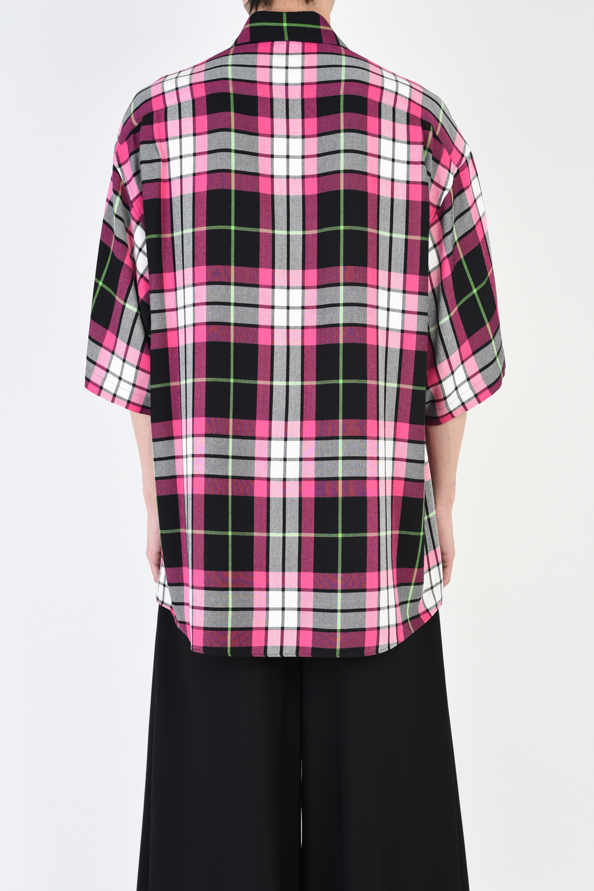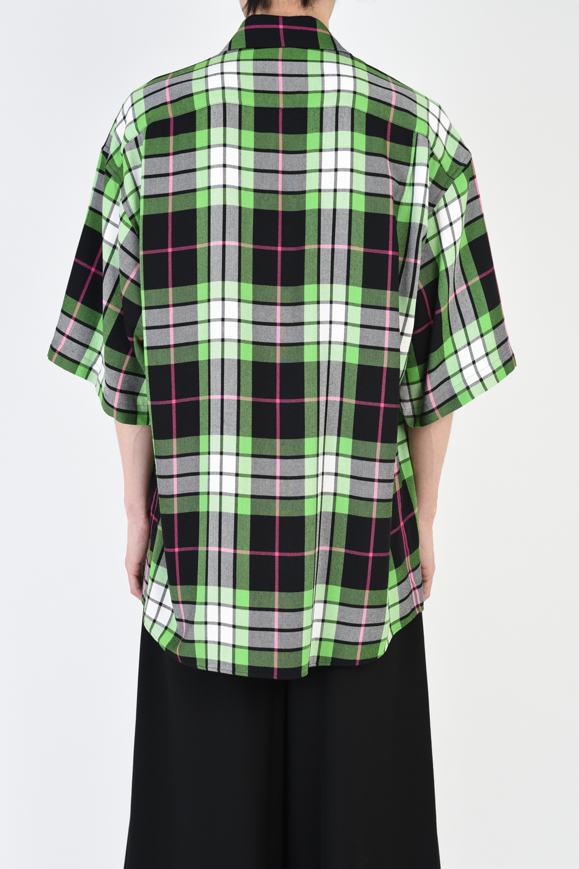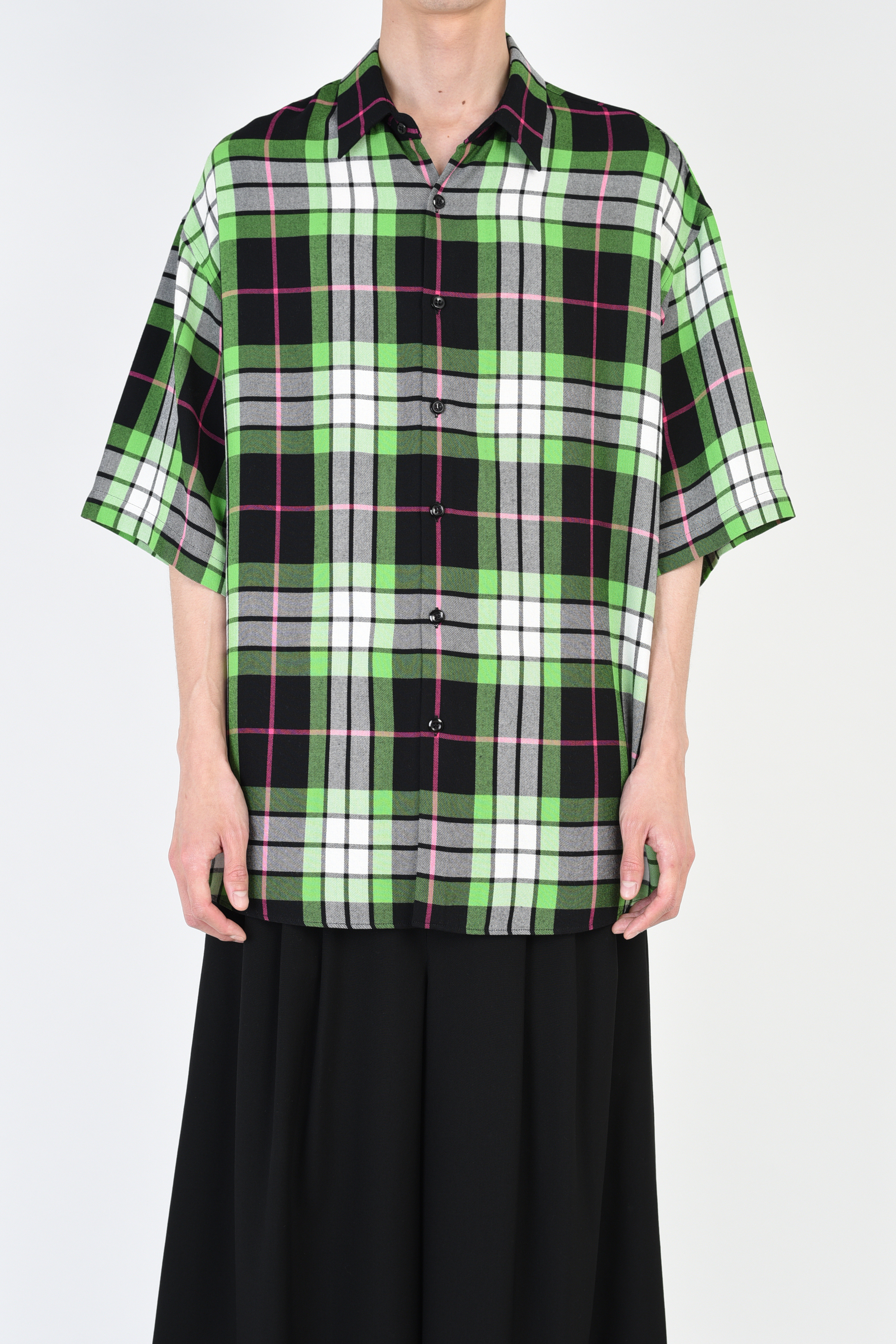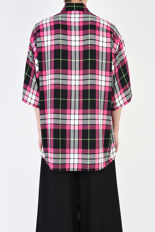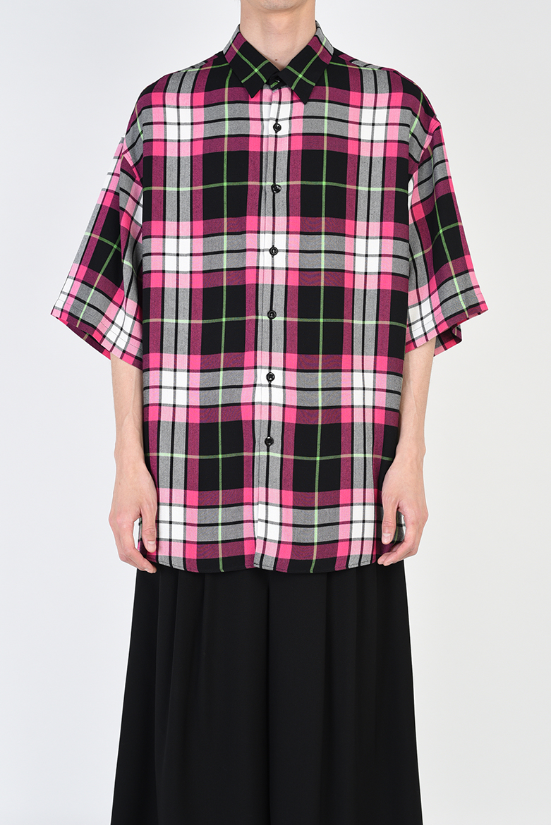 ピッチの広いチェック柄のモダール素材を使用した半袖ビッグシャツ。