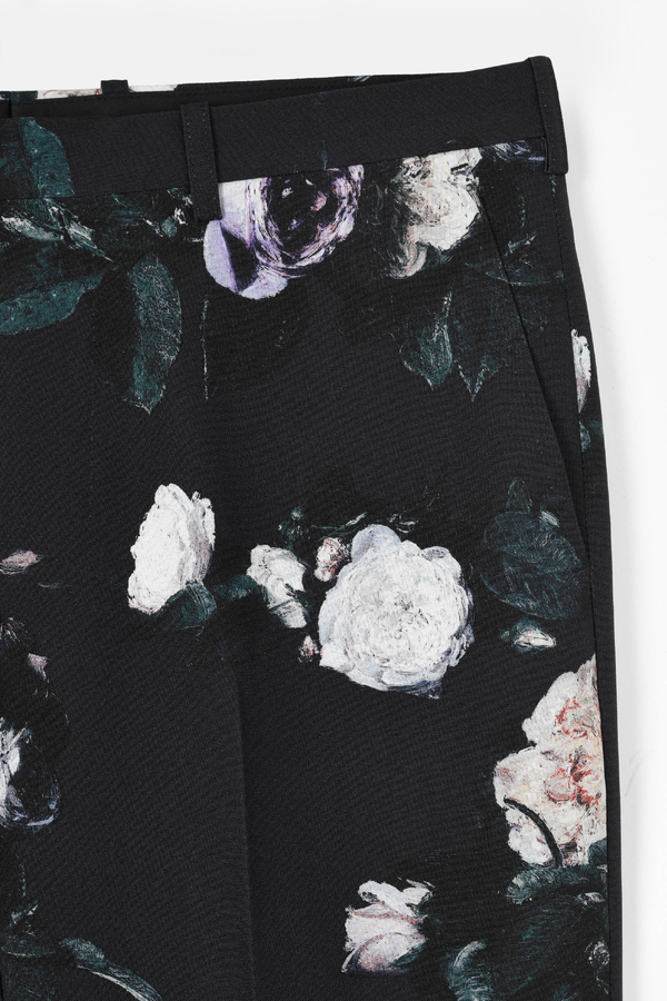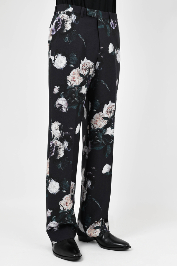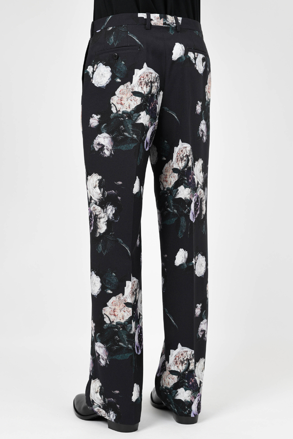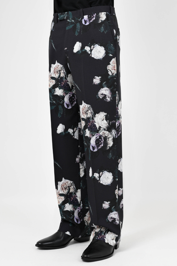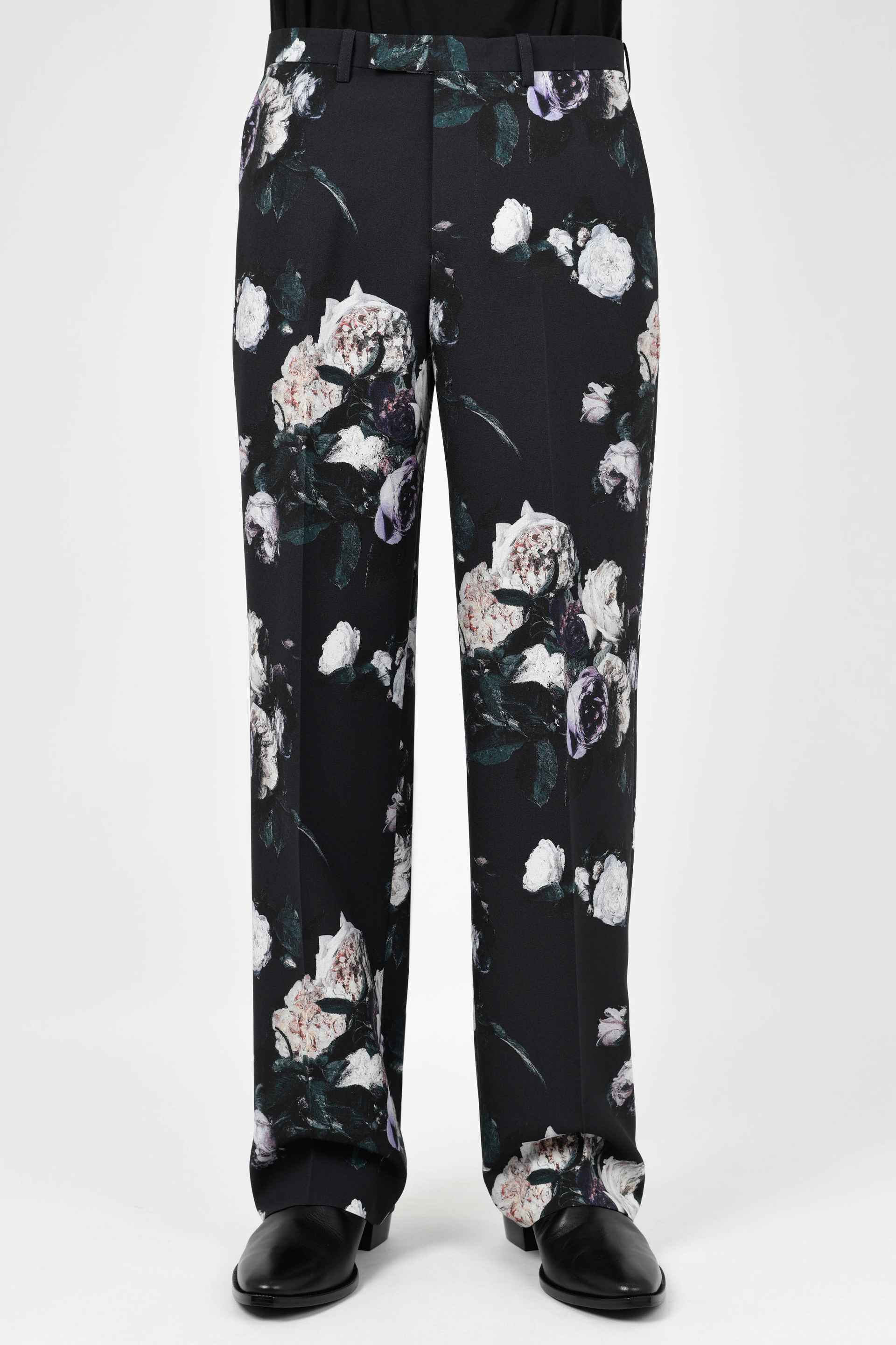 フラワー柄をプリントしたポリエステルトロピカル素材を使用したストレートスラックス。
