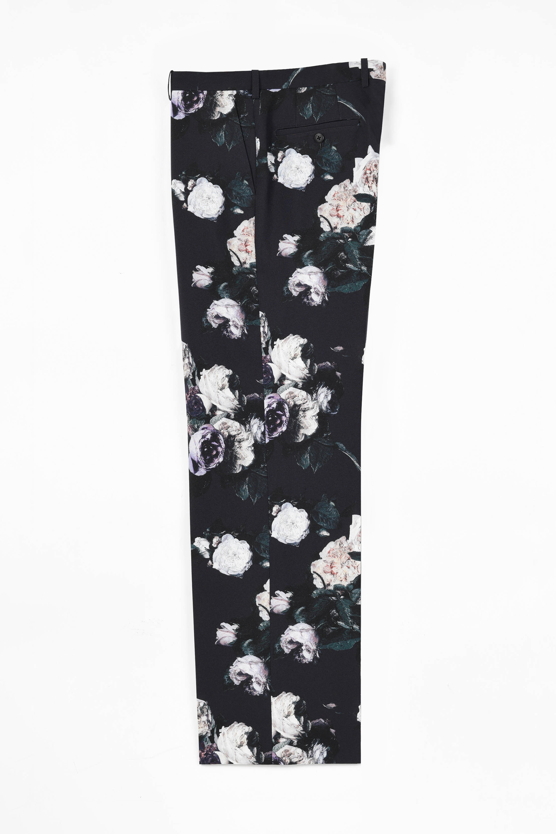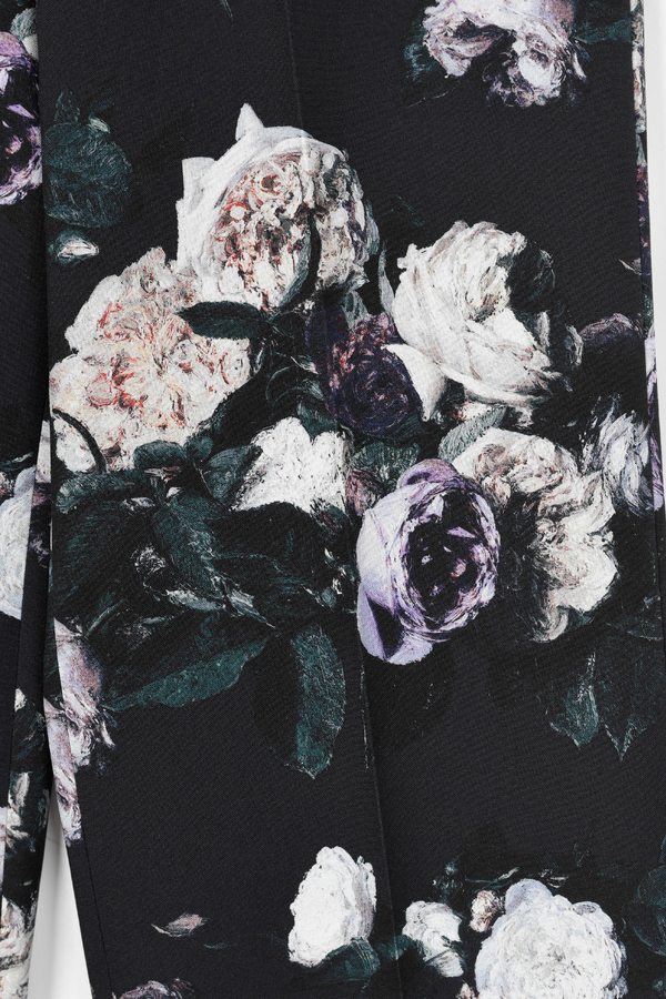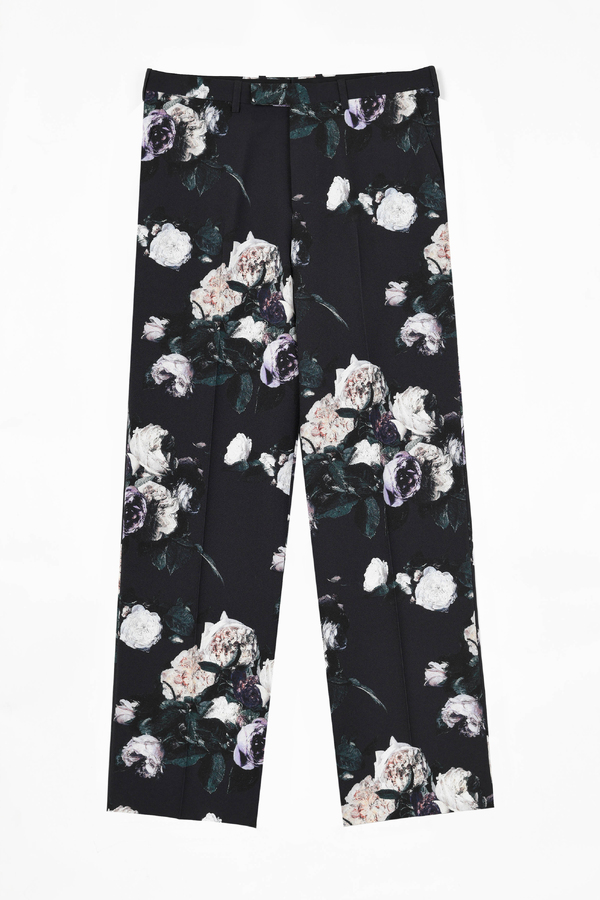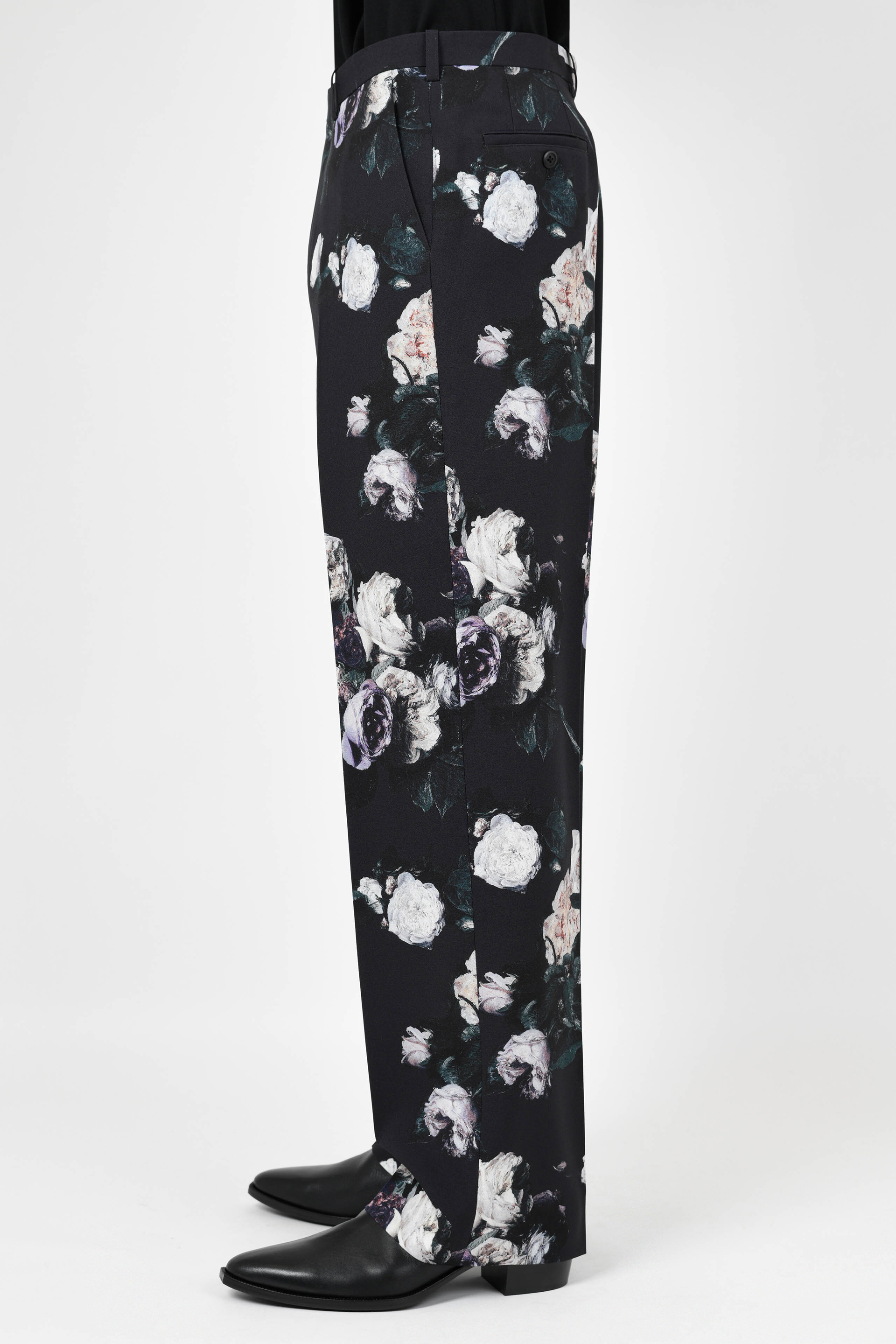 フラワー柄をプリントしたポリエステルトロピカル素材を使用したストレートスラックス。