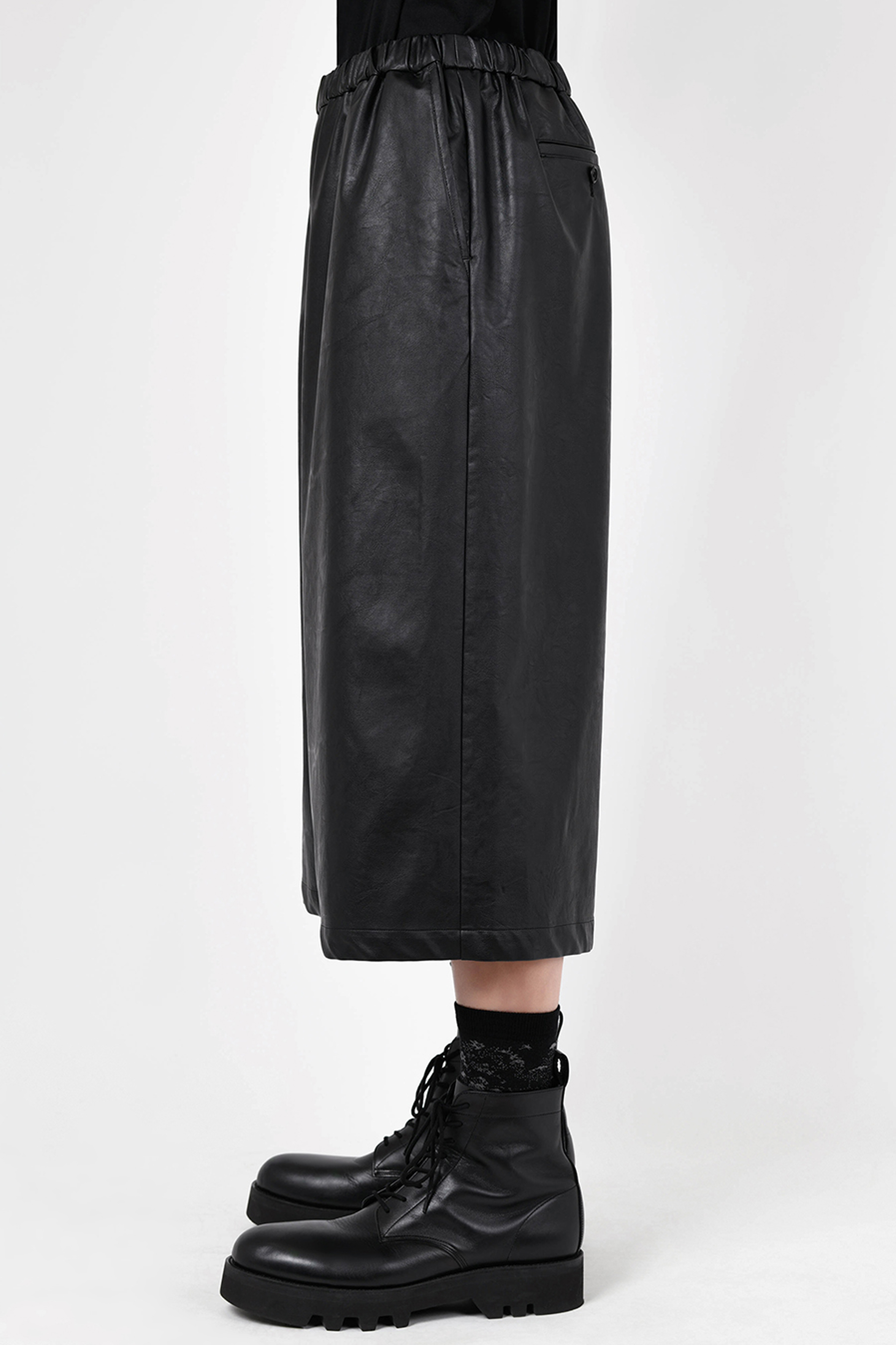 フェイクラムレザーを使用した6分丈ワイドパンツ。